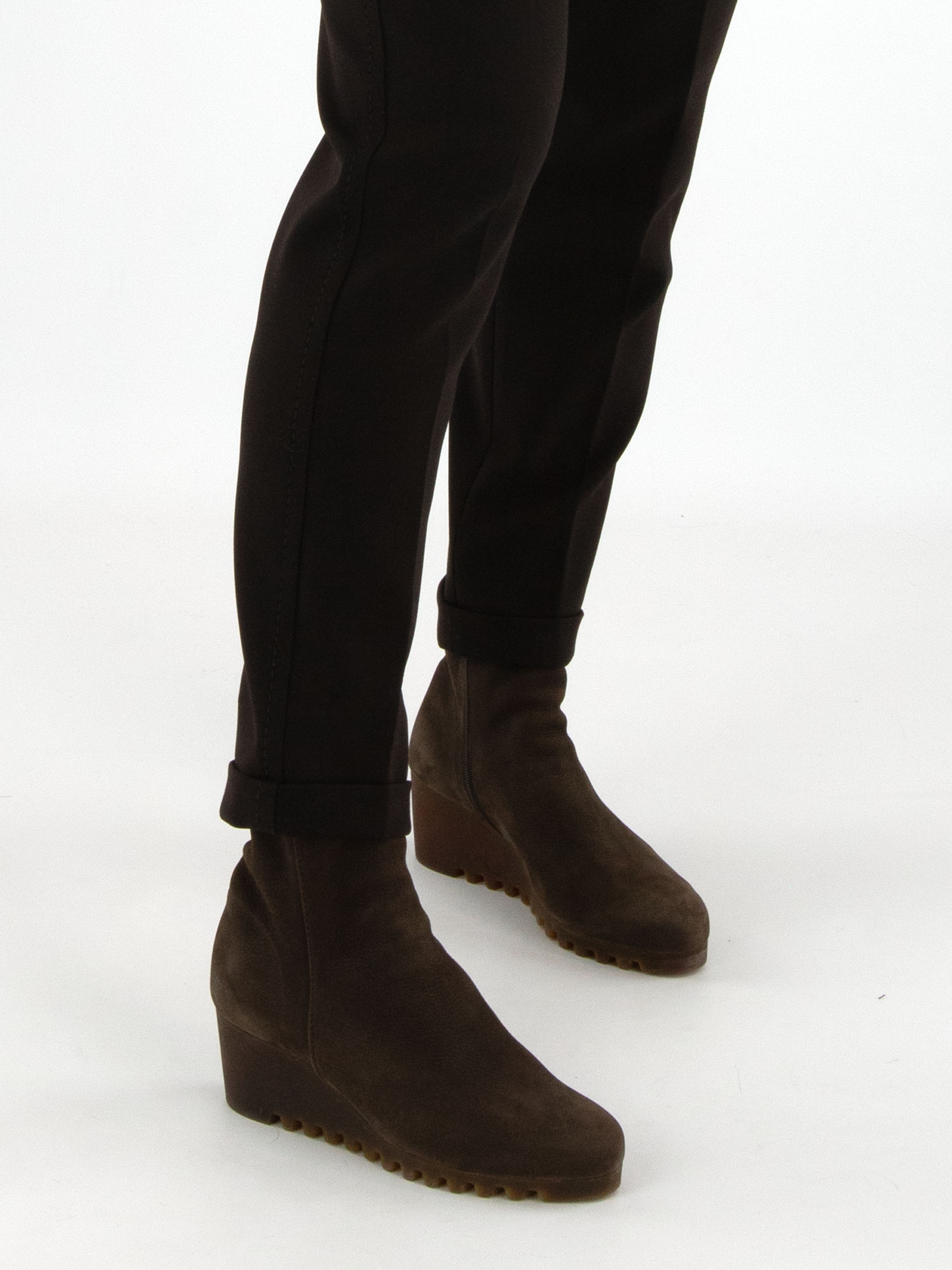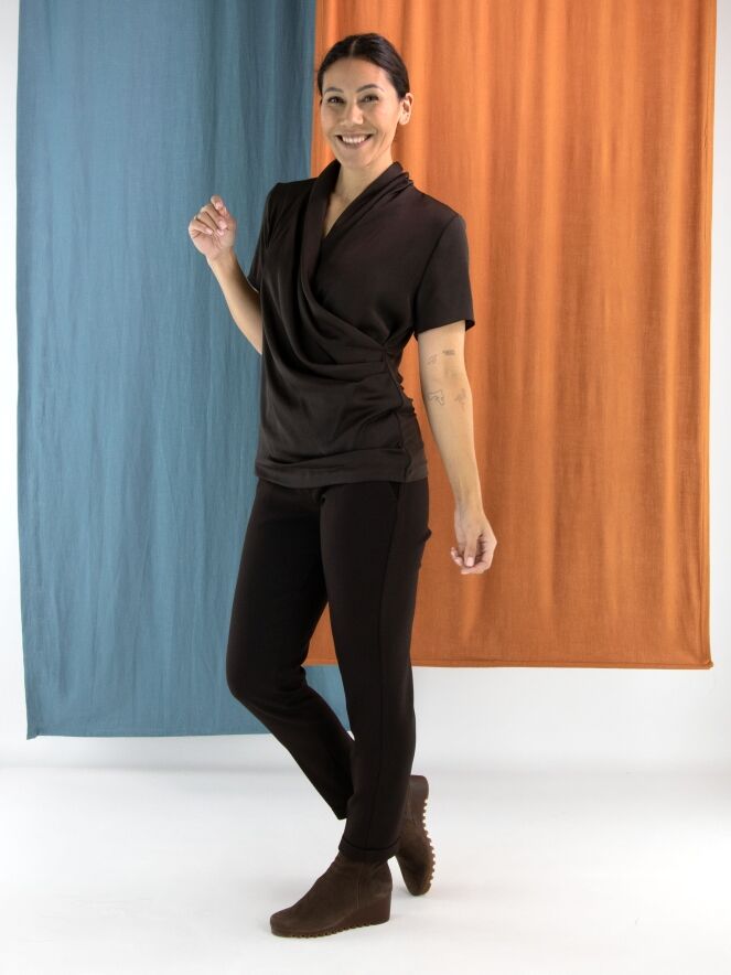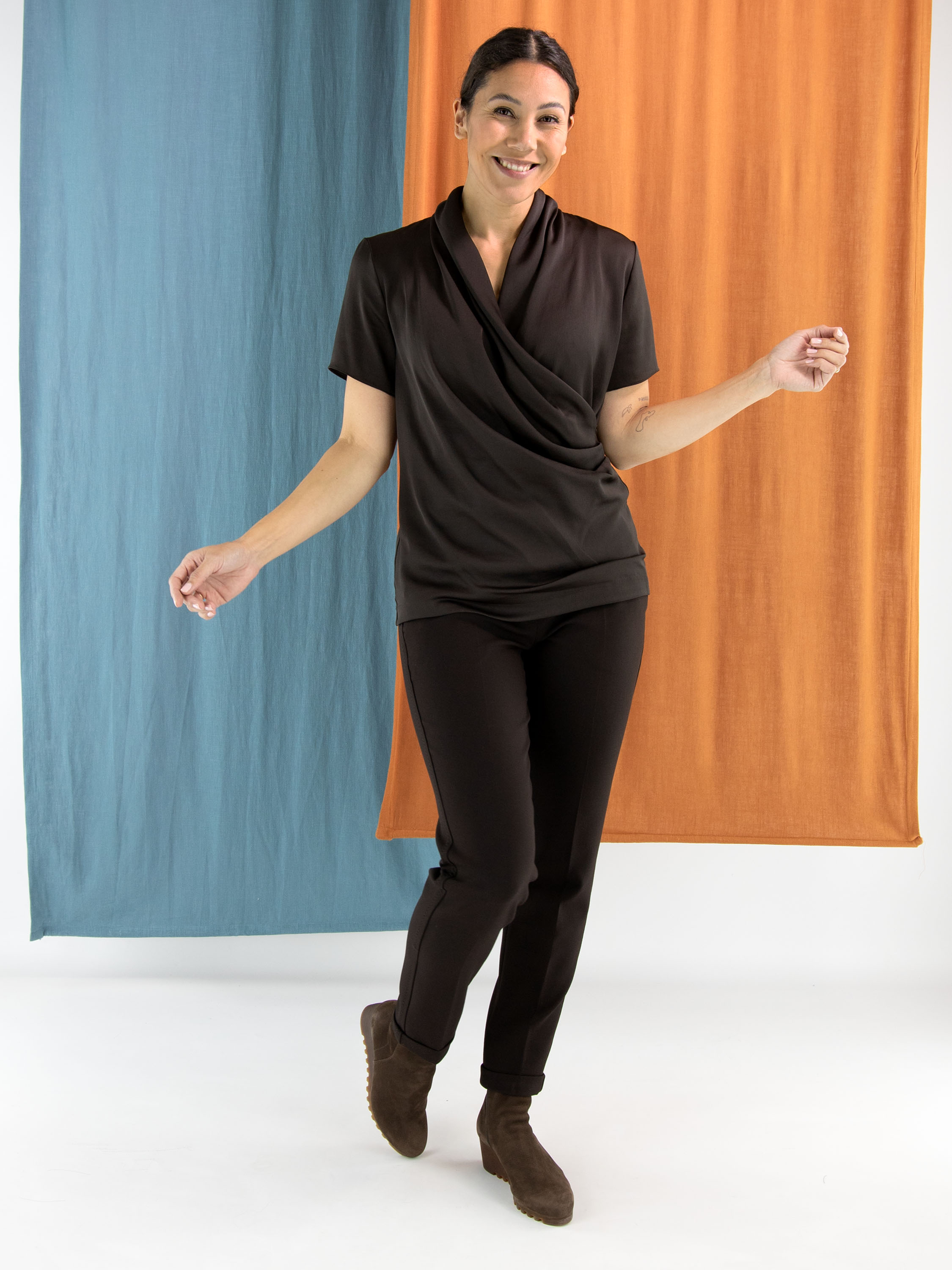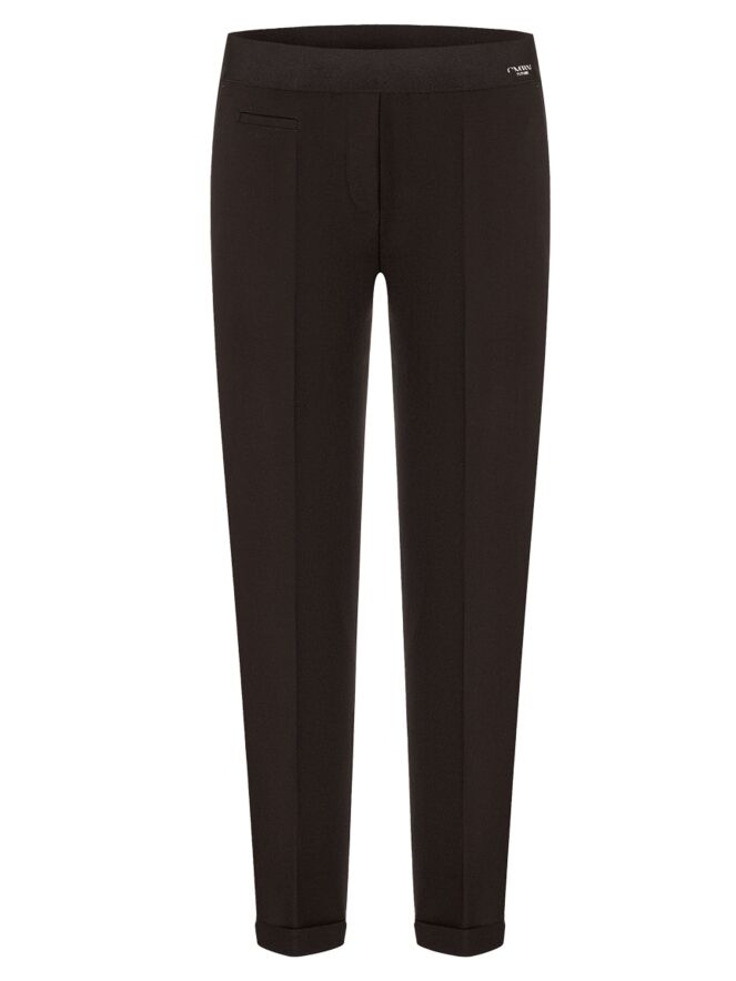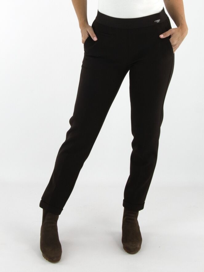 Un pantalon de Cambio en brun moka. La taille est dotée d’une ceinture élastique. Un pli marqué descend au centre de chaque jambe. Le pantalon possède des poches latérales et une couture décorative façon passepoil longe les côtés. Ce pantalon peut être lavé à la main.