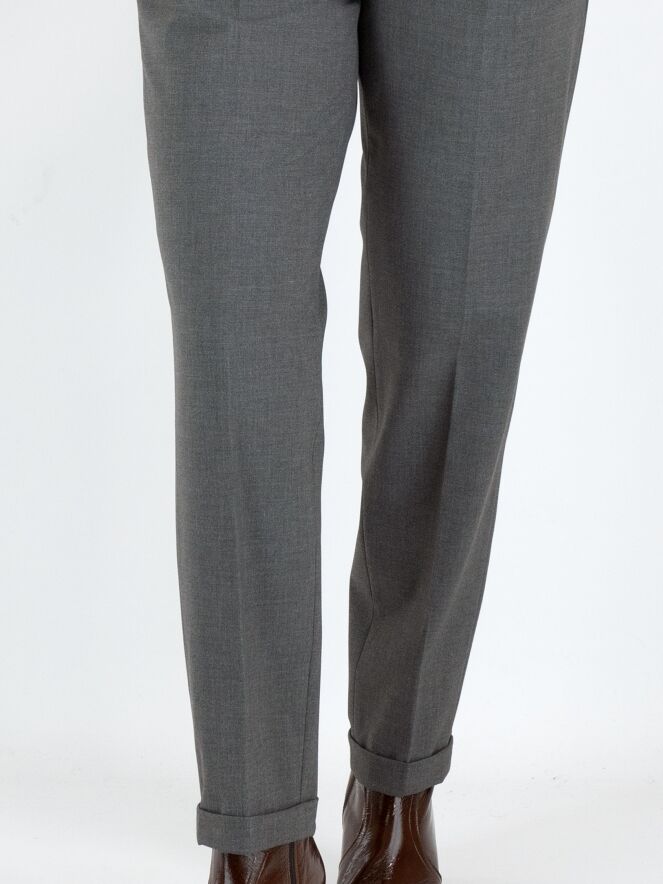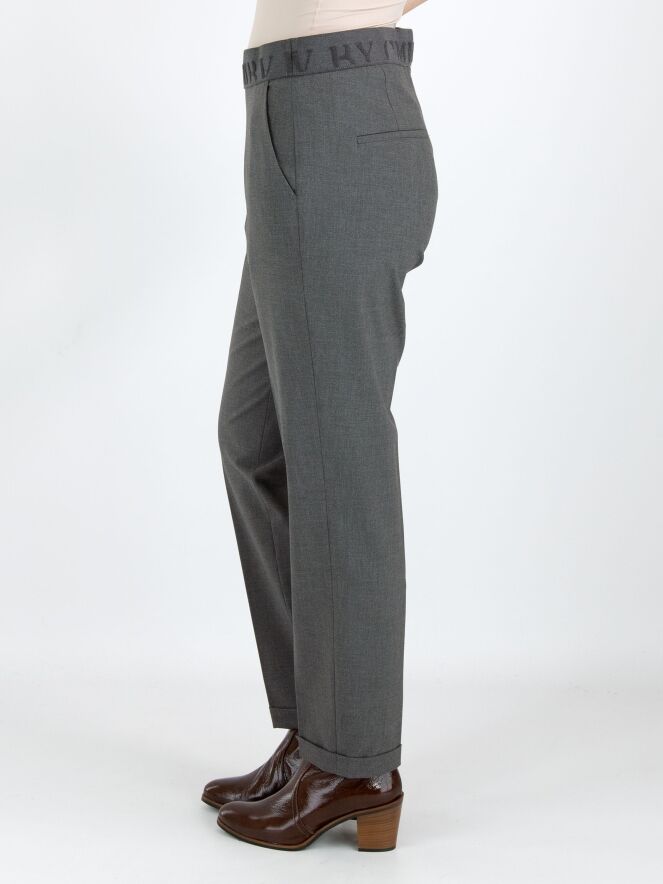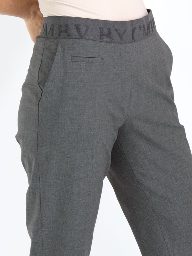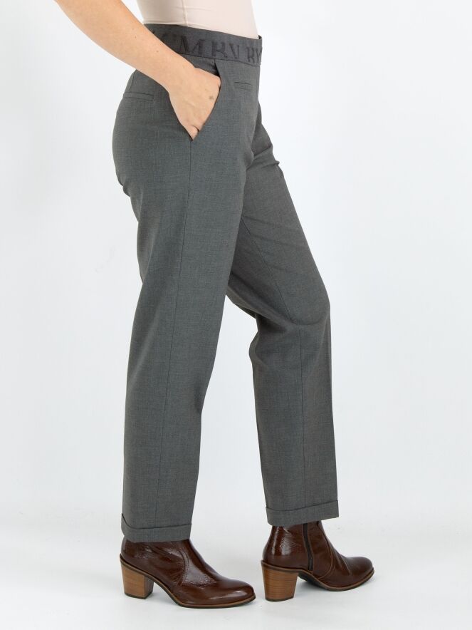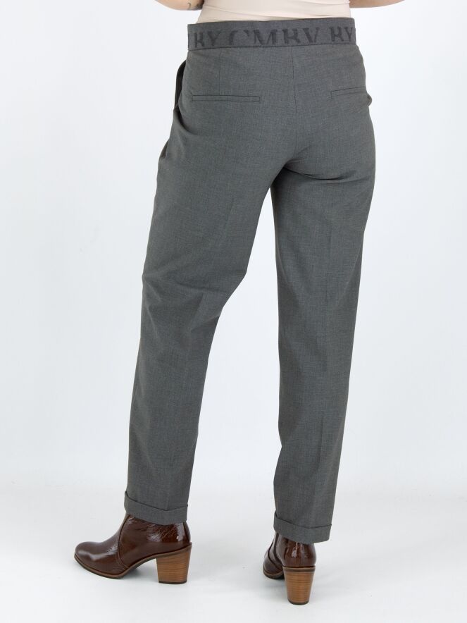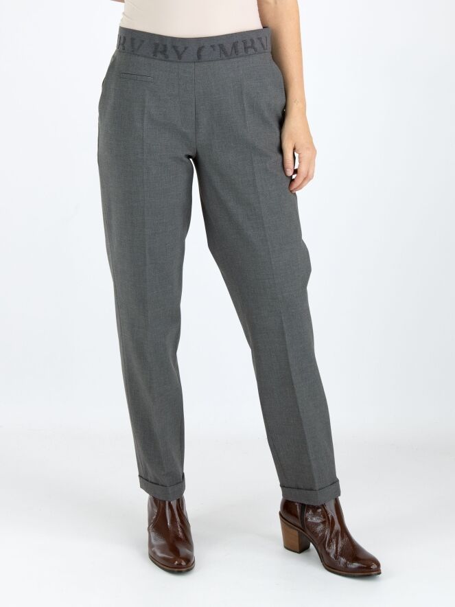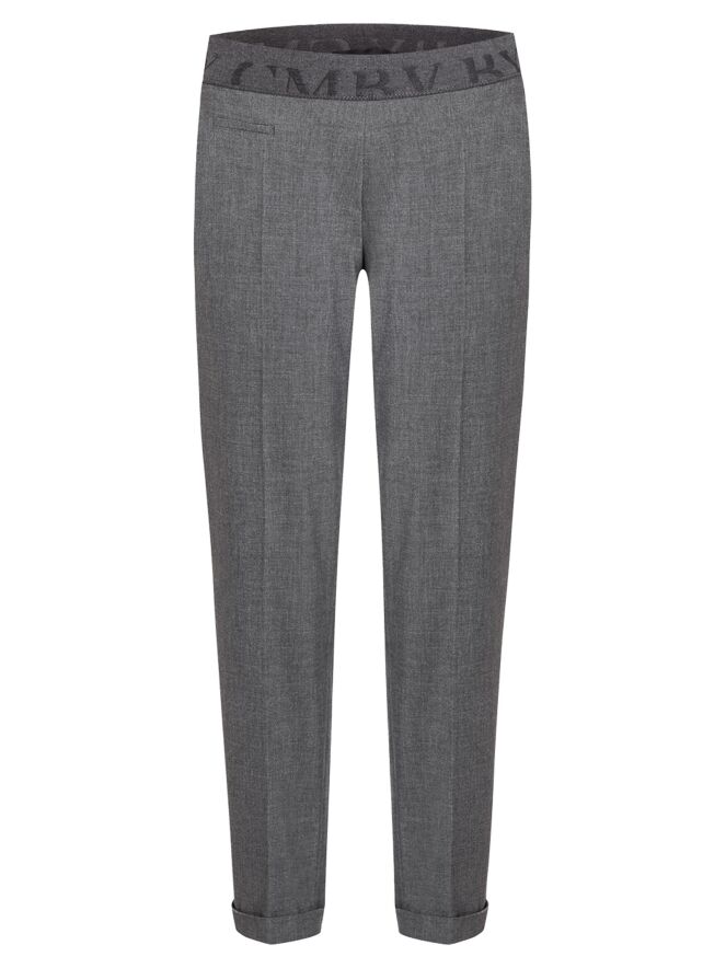 Un pantalon de Cambio de couleur grise. La taille est munie d'un élastique gris. Au milieu des jambes, il y a un pli marqué. En bas, il y a un court revers et le pantalon a des poches fendues. Ce pantalon peut être lavé à 30 degrés.