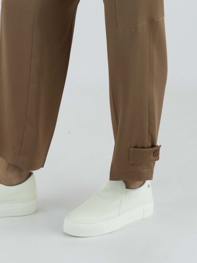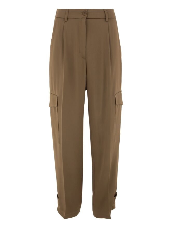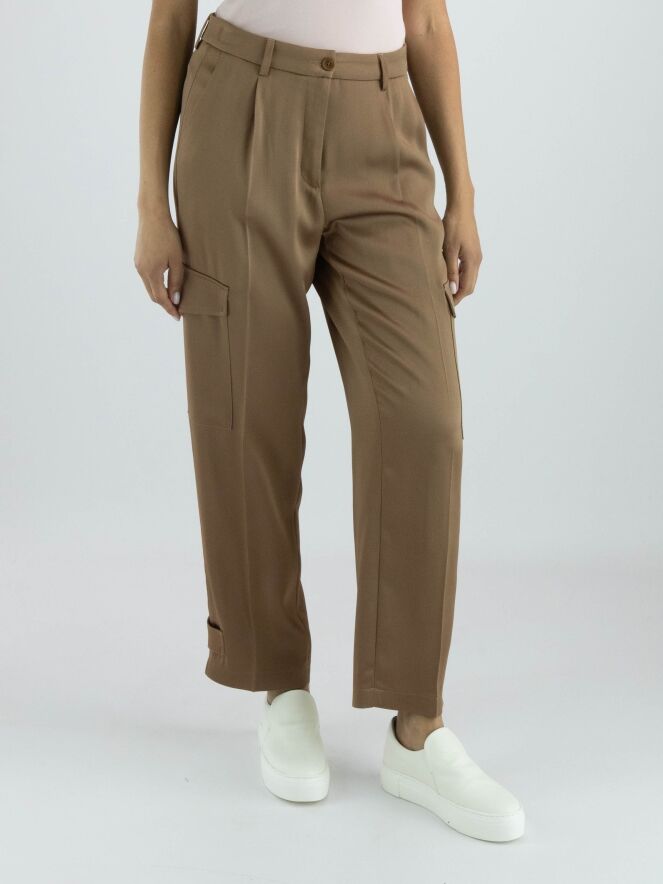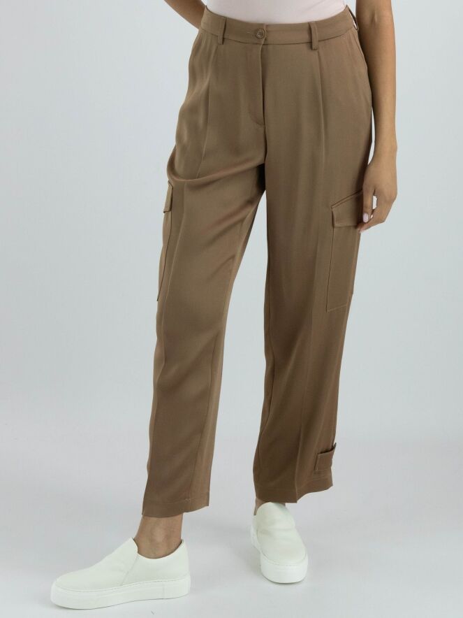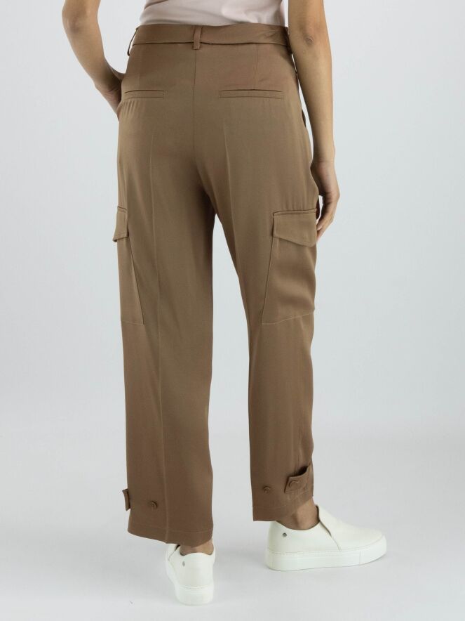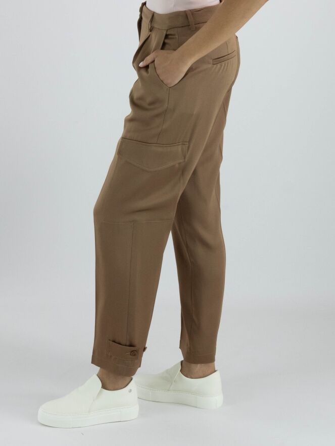 Un pantalon cargo en satin mat luxueux de Cambio en couleur or. Le pantalon possède des poches latérales et un pli marqué au centre des jambes. Au bas des jambes, il y a une boucle décorative qui permet de resserrer légèrement le pantalon. Ce pantalon peut être lavé à la main.