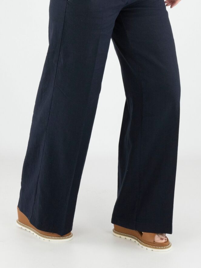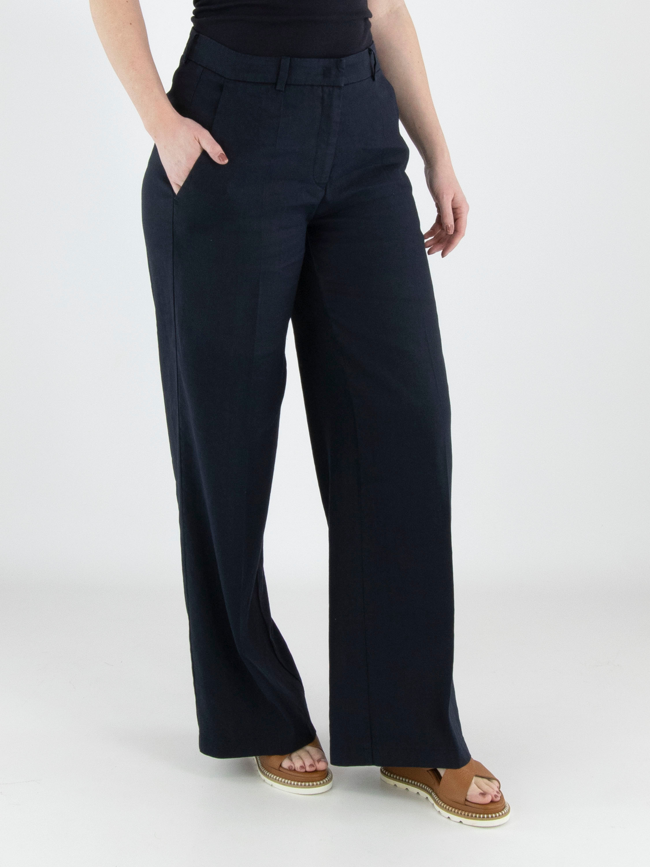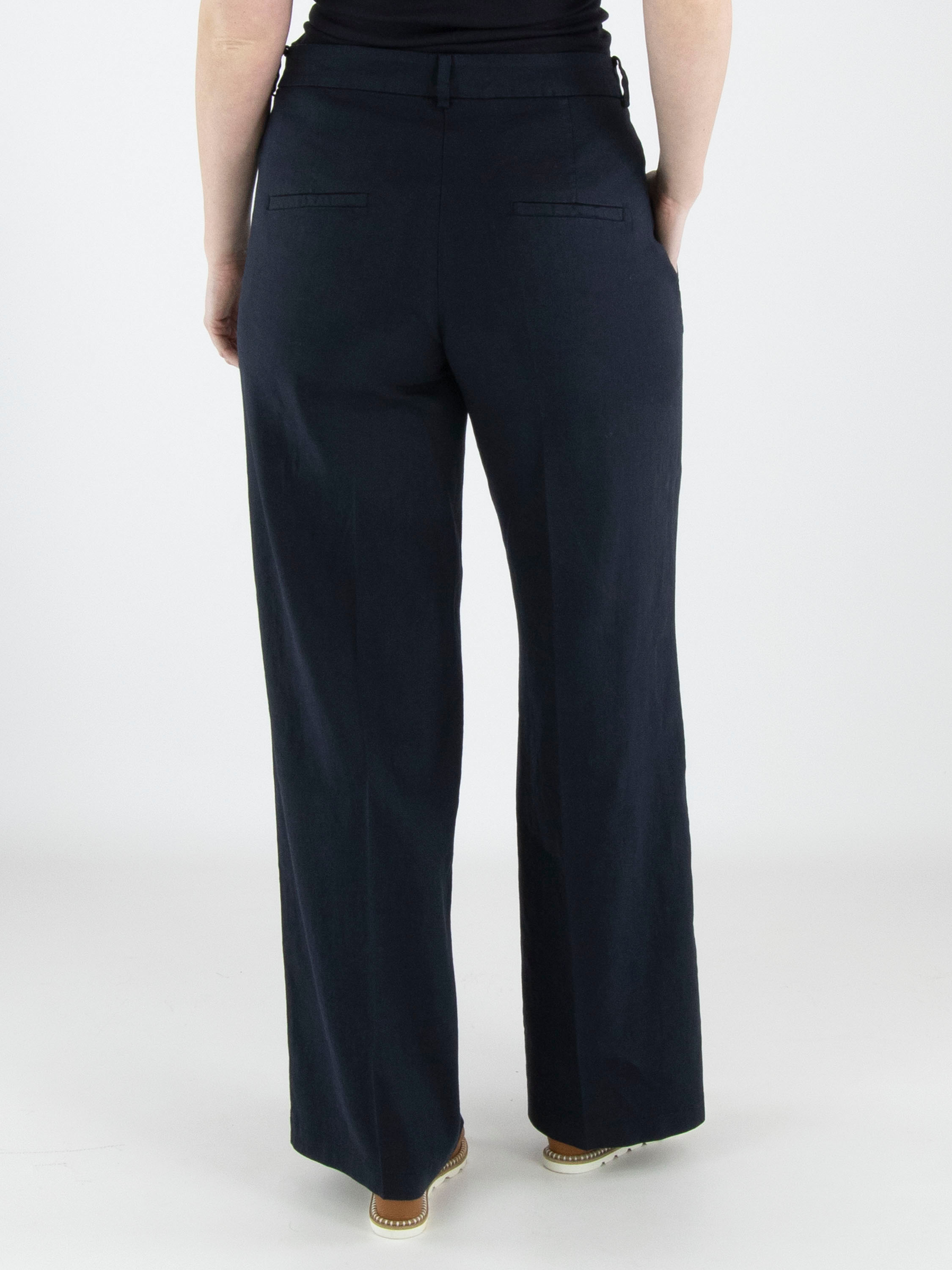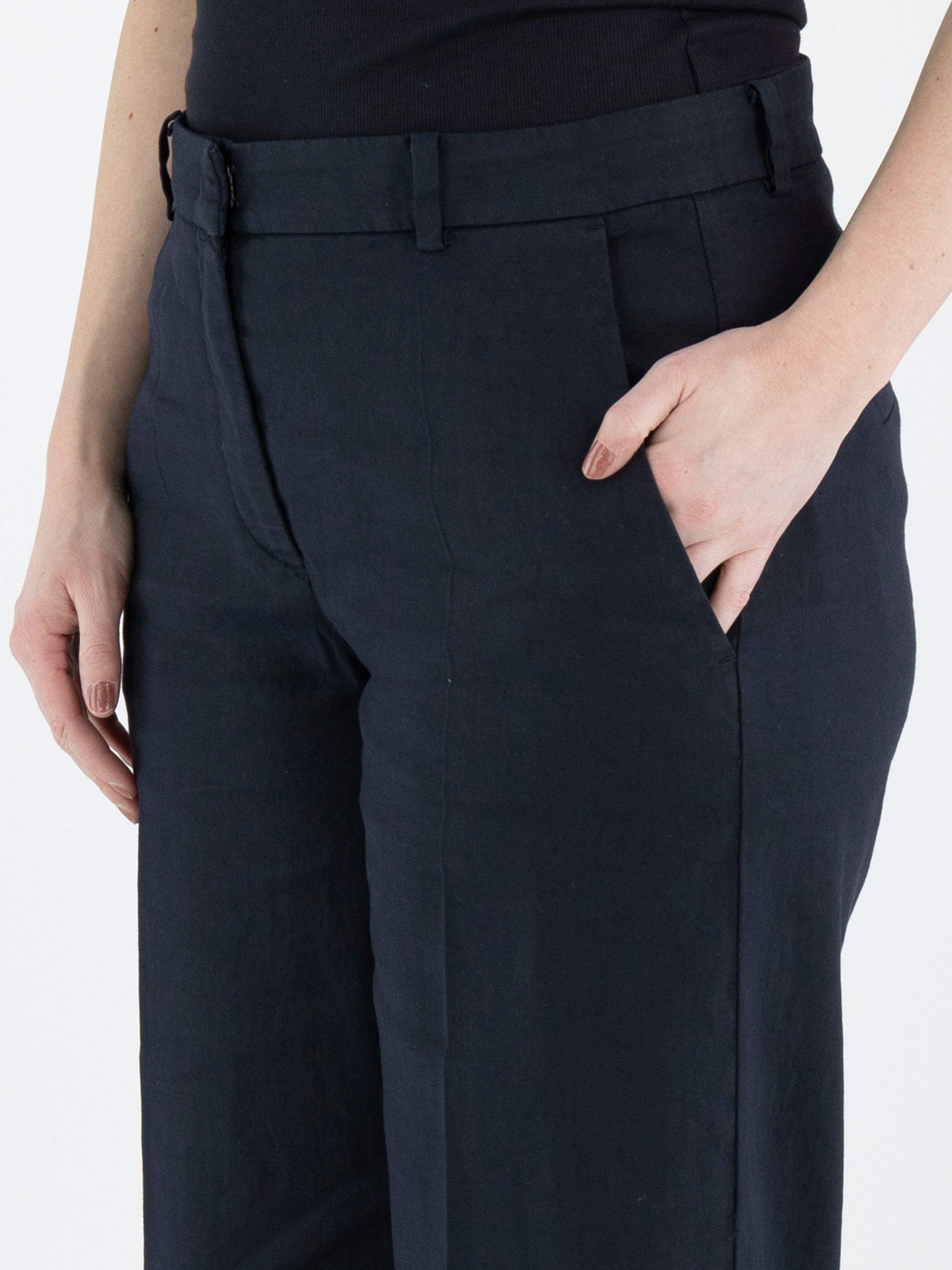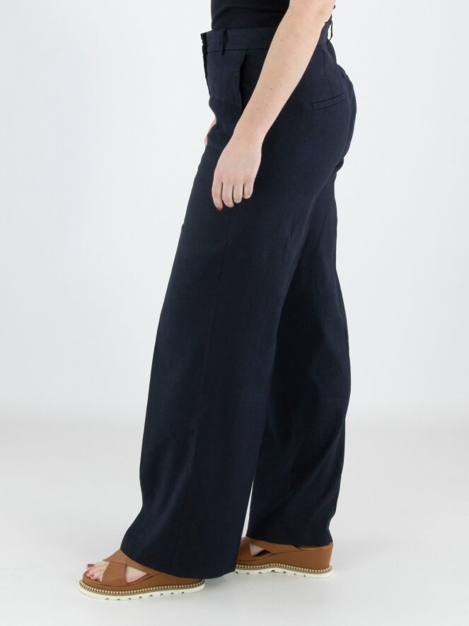 Un pantalon de Cambio en bleu marine. Les jambes sont droites et présentent un pli marqué au centre. Le pantalon possède des poches latérales et peut être lavé à la main.