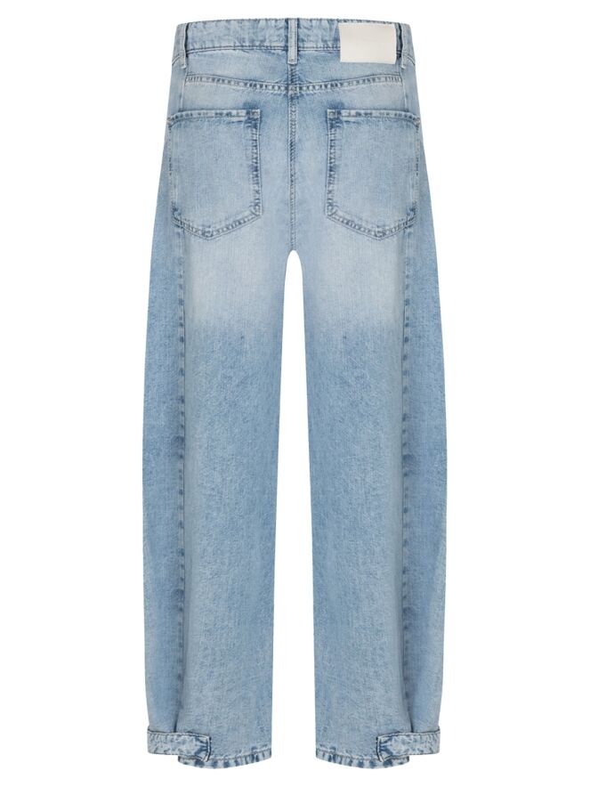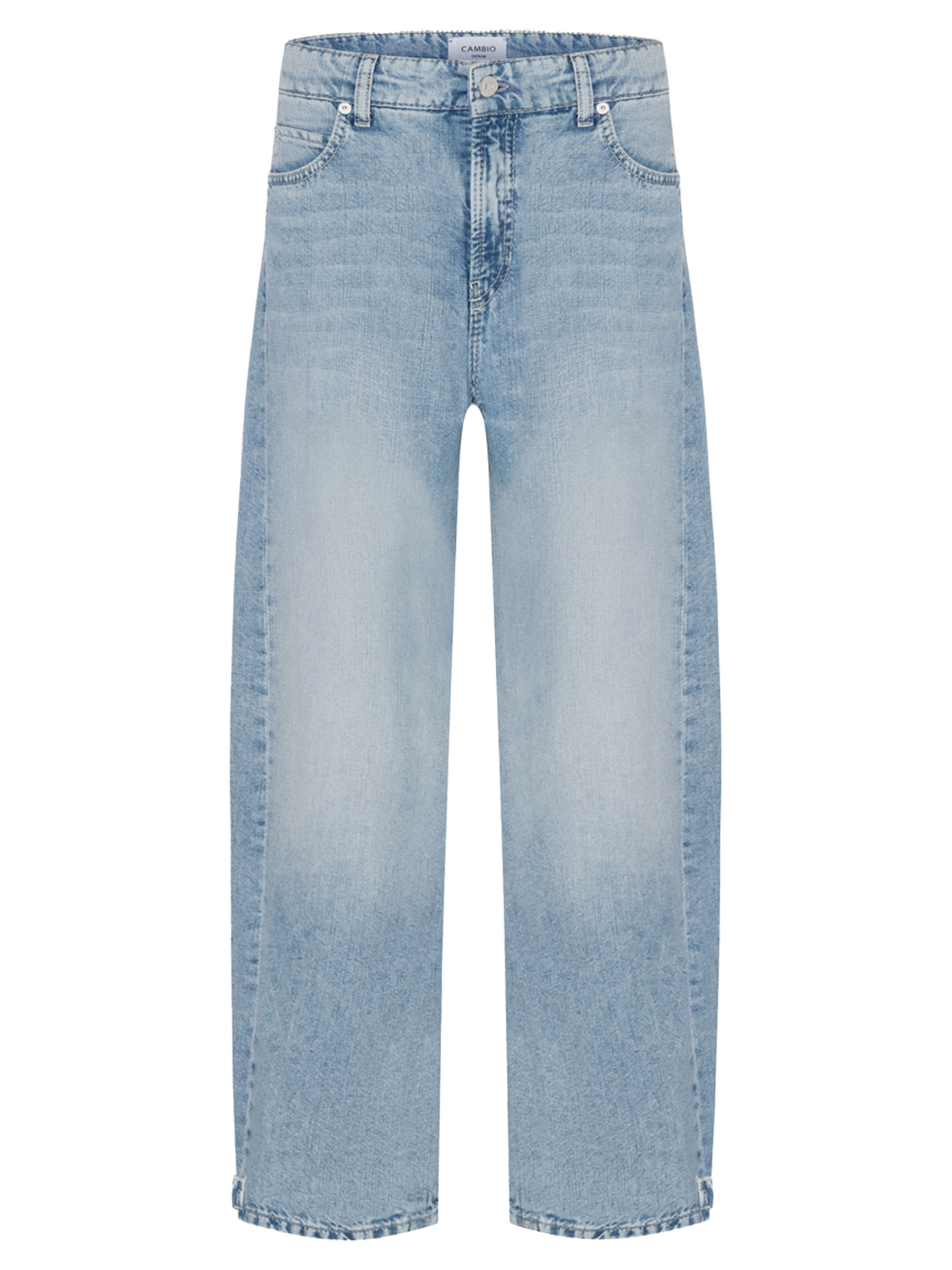 Jean large de Cambio dans une teinte denim bleu clair, décliné dans un modèle classique à 5 poches. La présence de lin dans la composition du tissu confère au jean une douceur et un confort exceptionnels. Au bas des jambes, un court lien décoratif avec bouton-pression sur le côté extérieur apporte une touche contemporaine. Ce jean de créateur exclusif doit être lavé à la main.