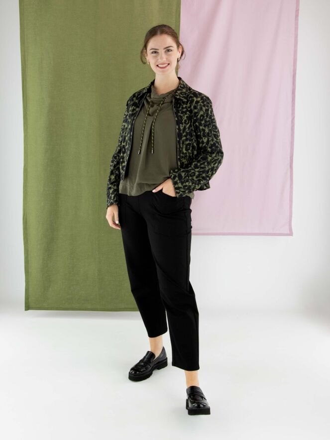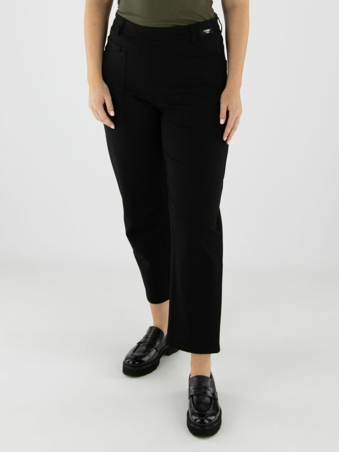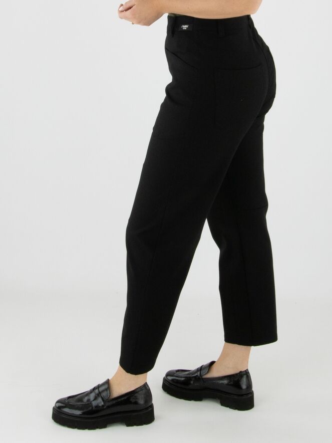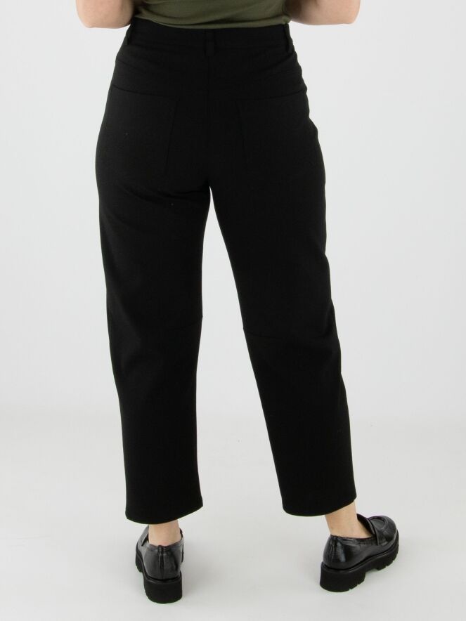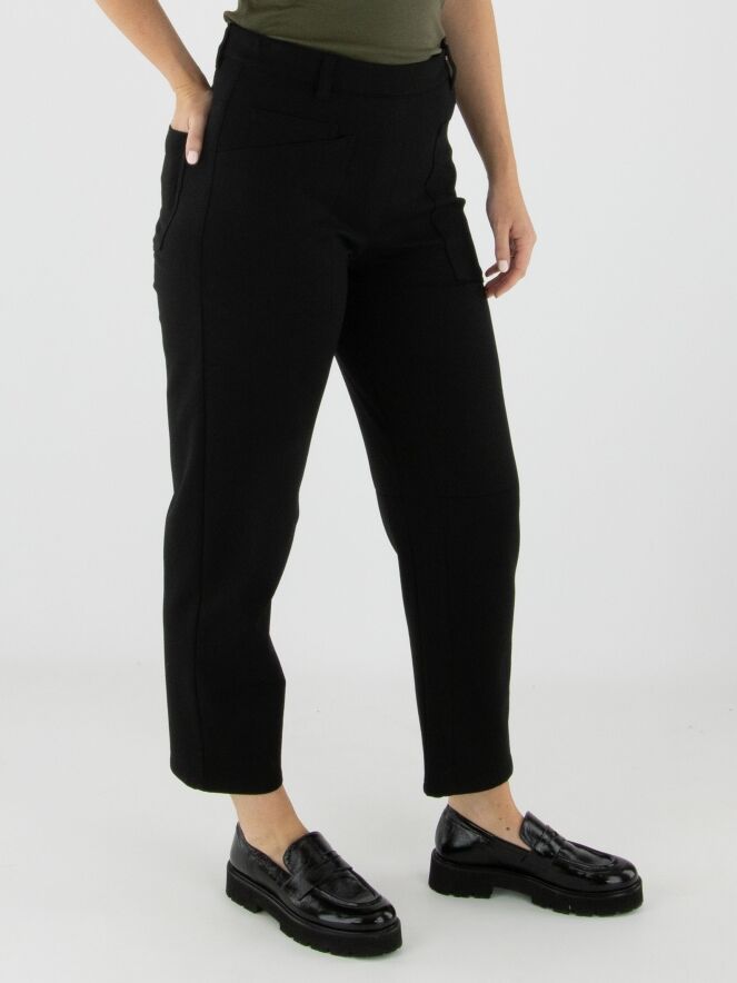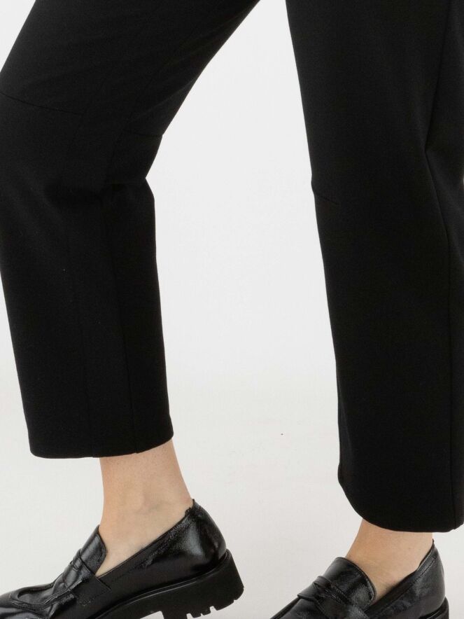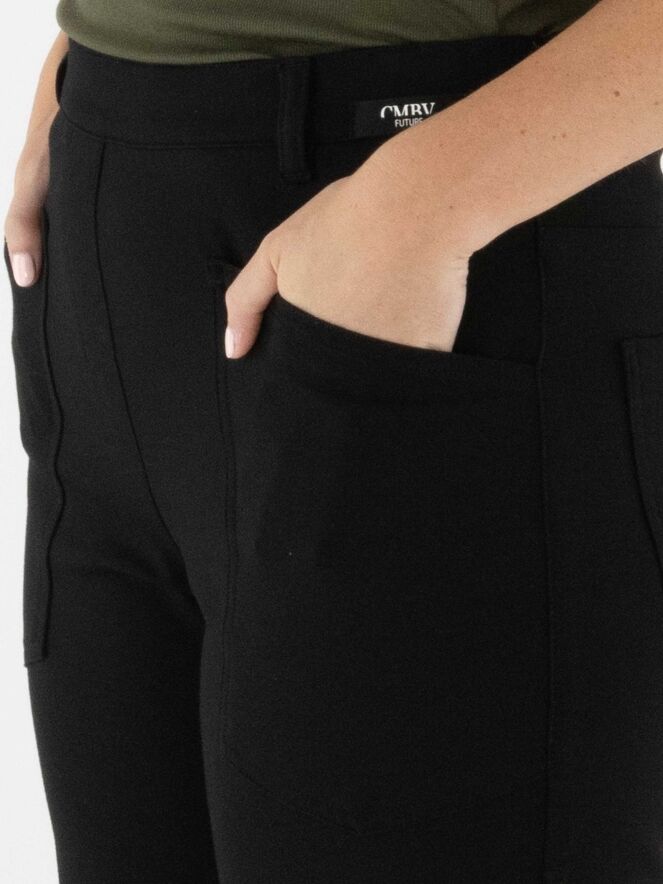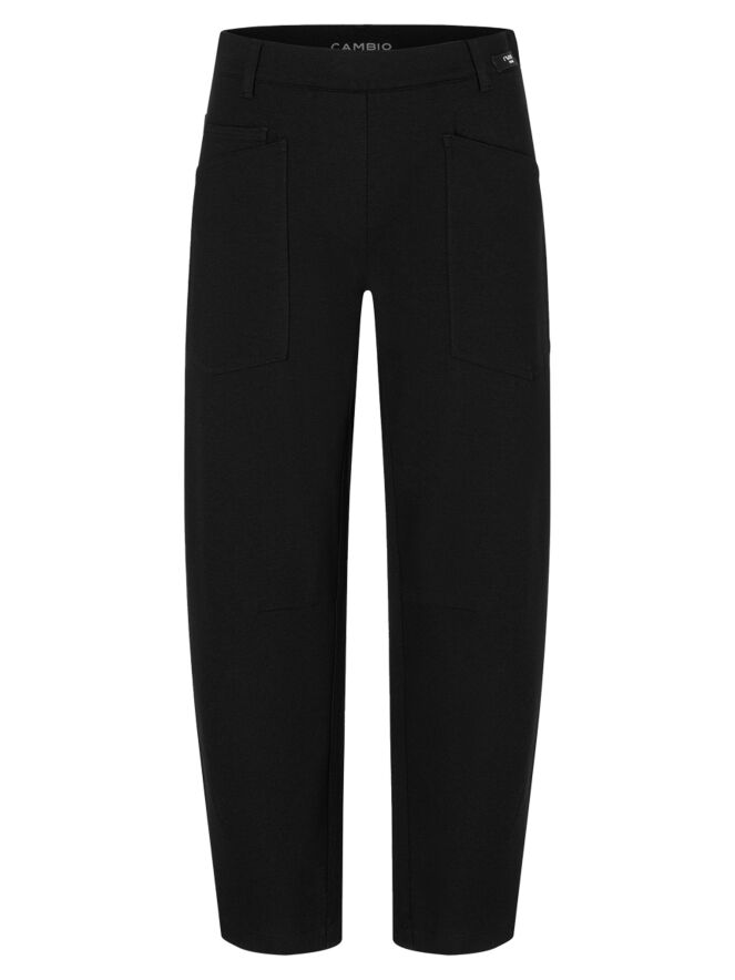 Pantalon noir de la marque Cambio, coupe 5 poches. Une pince de forme se trouve au niveau des genoux. Ce pantalon doit être lavé à la main.