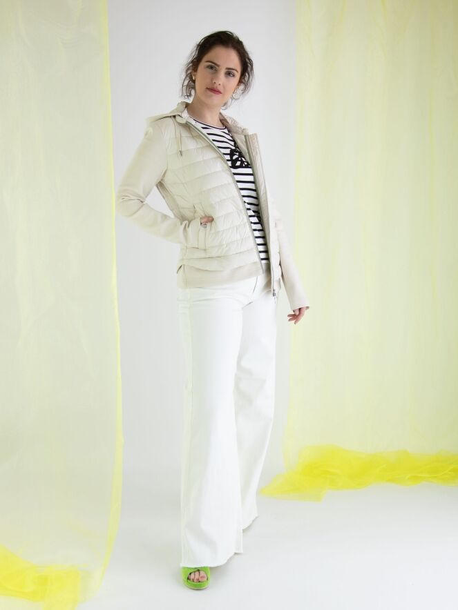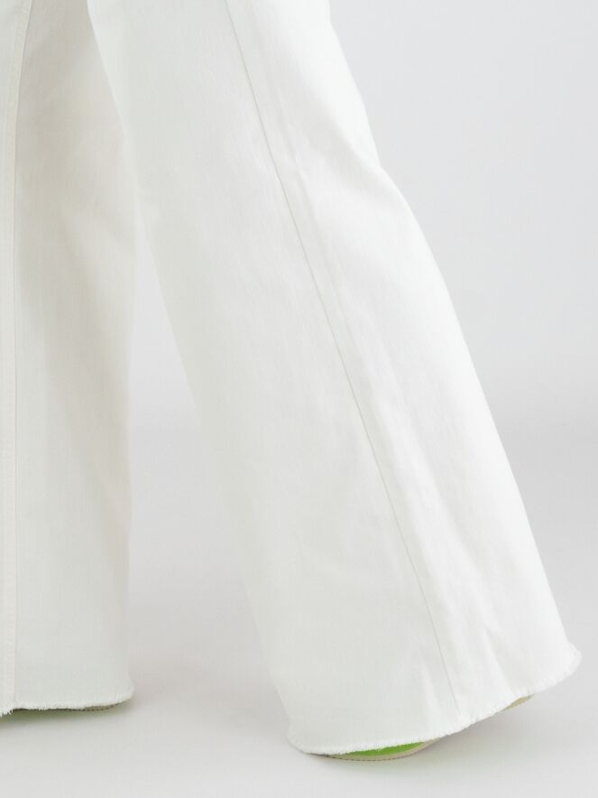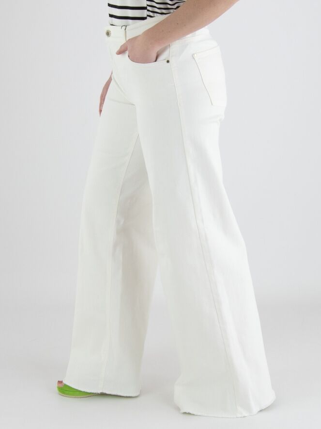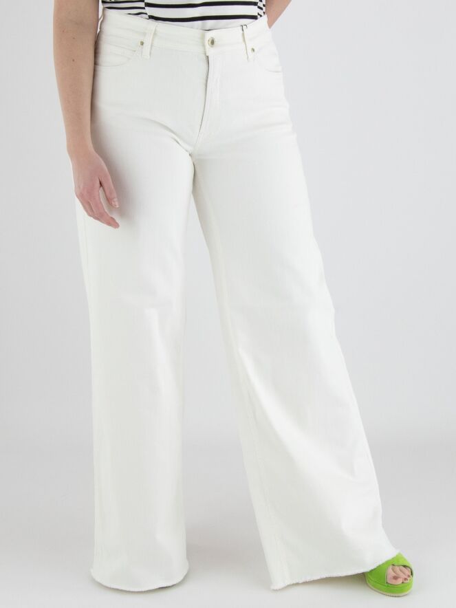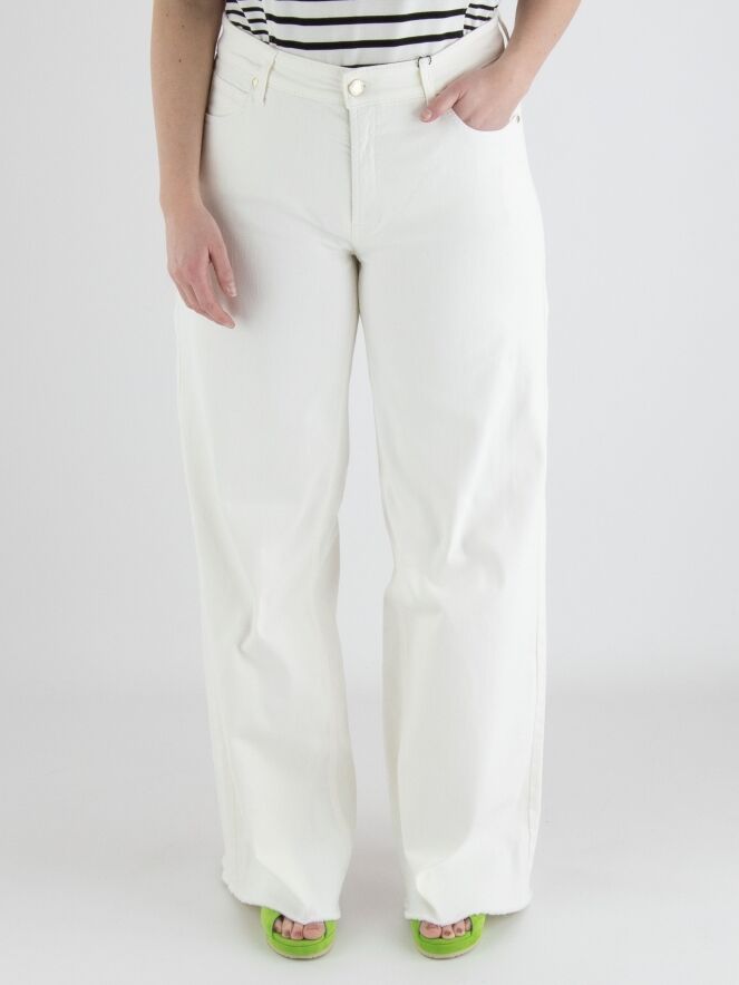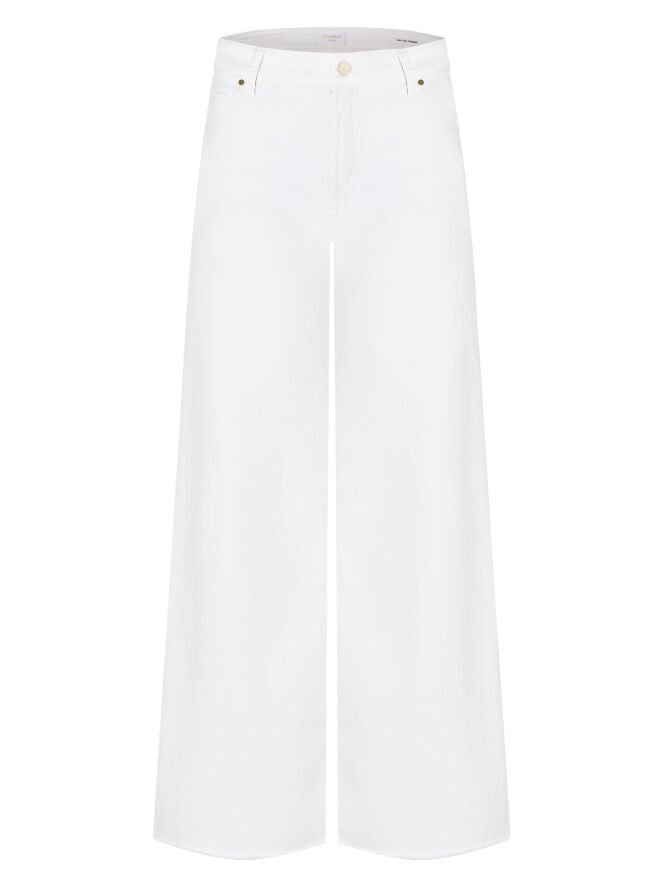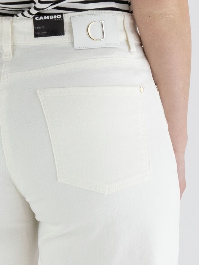 Jeans à jambes larges de Cambio en blanc. Le jeans est de style 5 poches, et les ourlets des jambes larges sont effilochés. Ce jeans peut être lavé à 30 degrés.