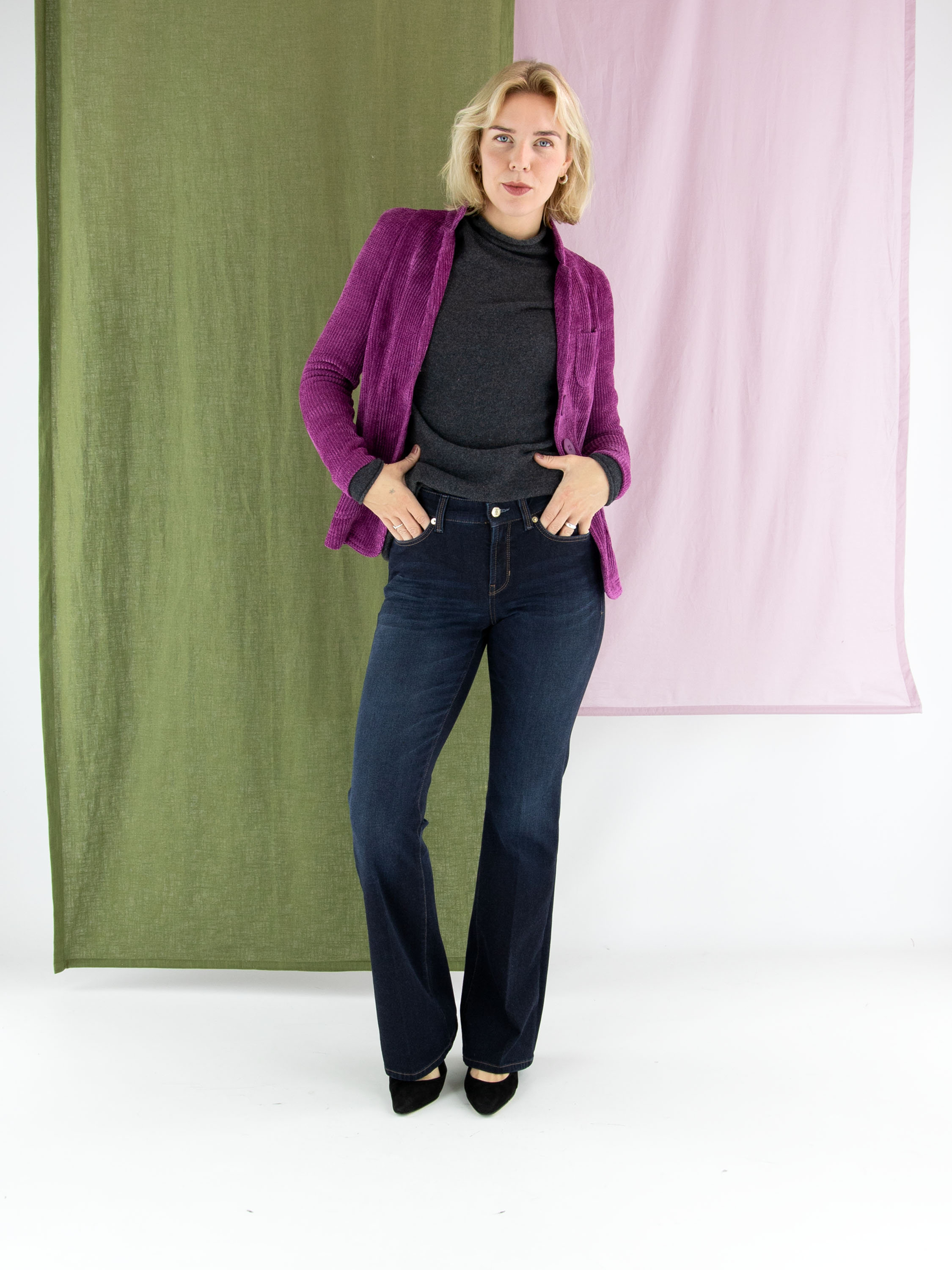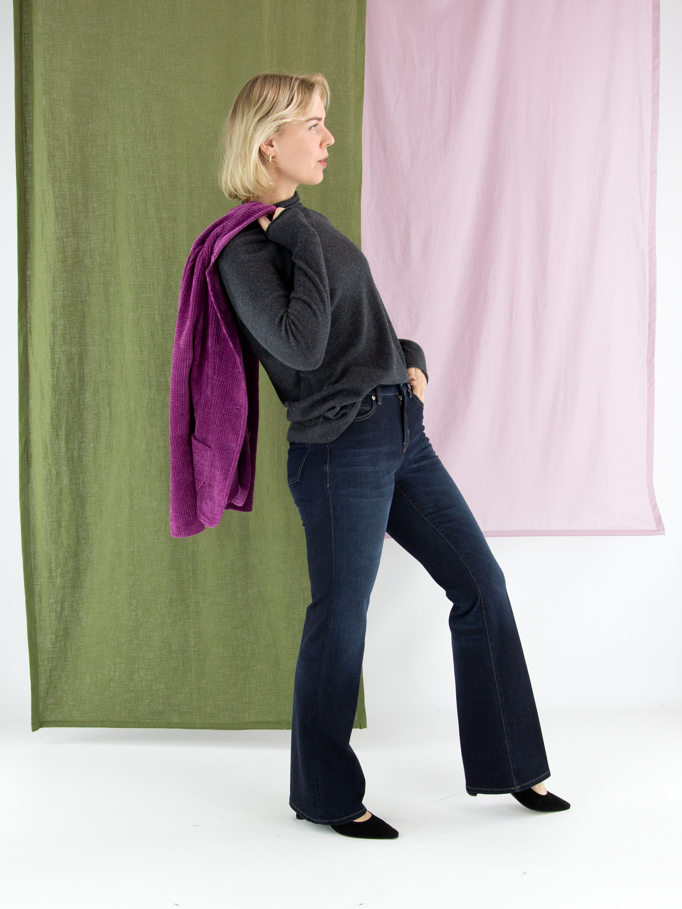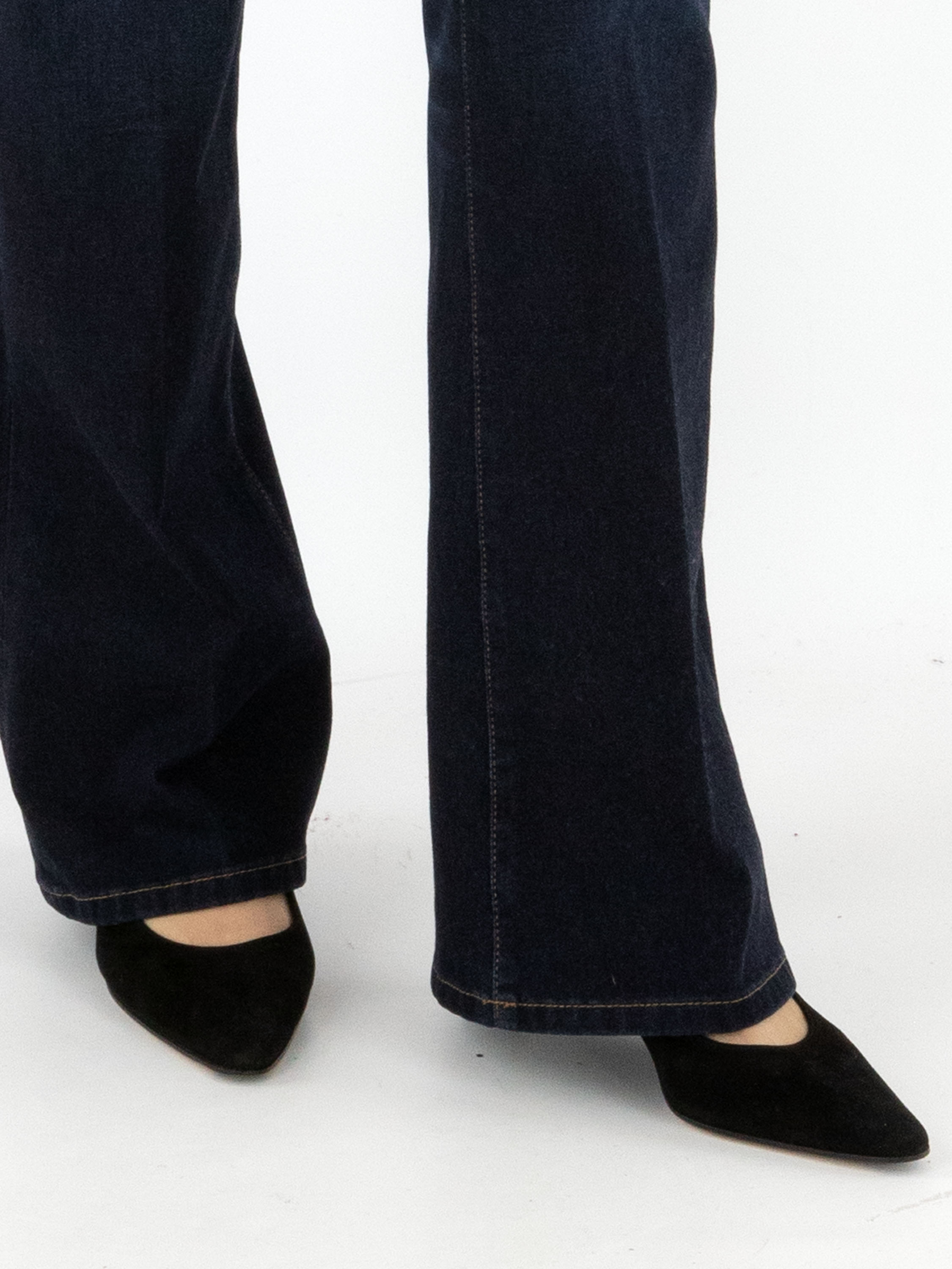 Un jean évasé en denim foncé de Cambio. Ce modèle adopte une coupe classique à 5 poches et peut être lavé à 30 degrés.
