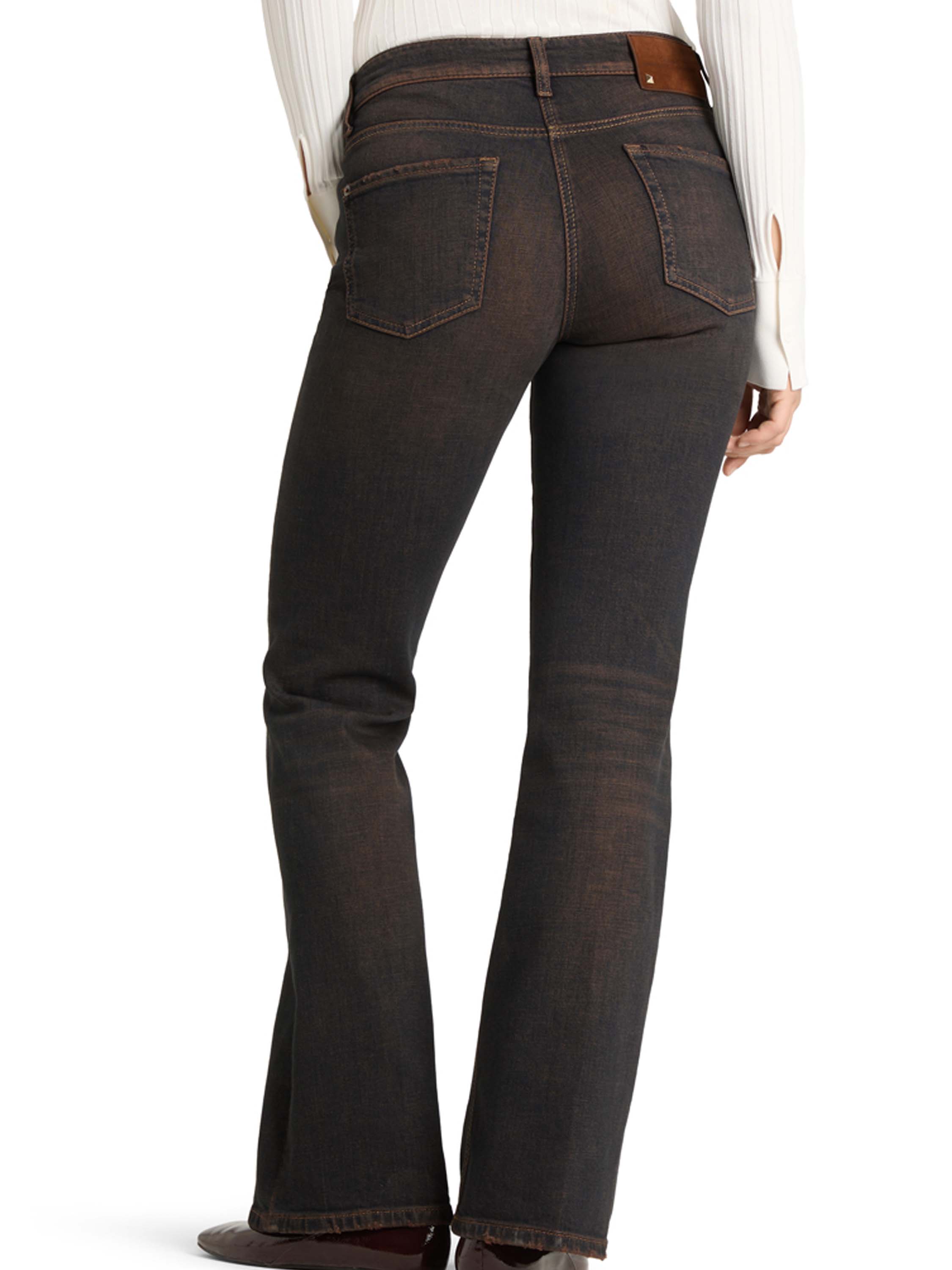 Un jean évasé en denim foncé de Cambio avec une touche de couleur rouille. Le modèle est conçu dans une coupe 5 poches classique et peut être lavé à 30 degrés.