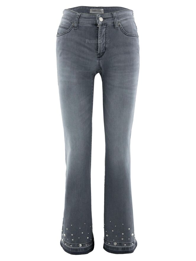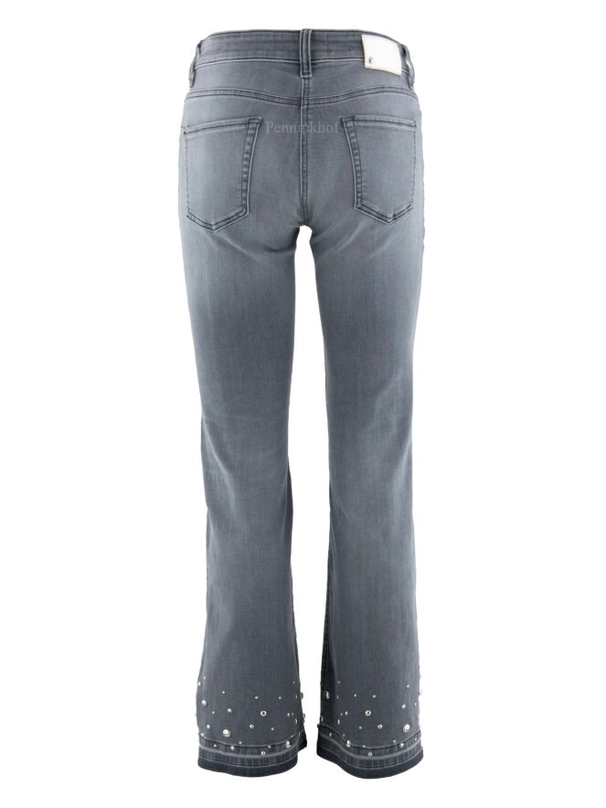 Jeans évasé délavé de Cambio, de couleur gris clair. Le jeans a 5 poches. Le bas des jambes est orné de plusieurs clous ronds argentés de différentes tailles. Le bord des jambes est rayé dans plusieurs tons de gris. Ce jean peut être lavé à 30 degrés.