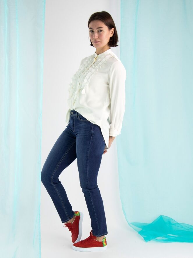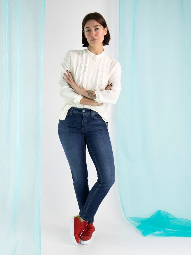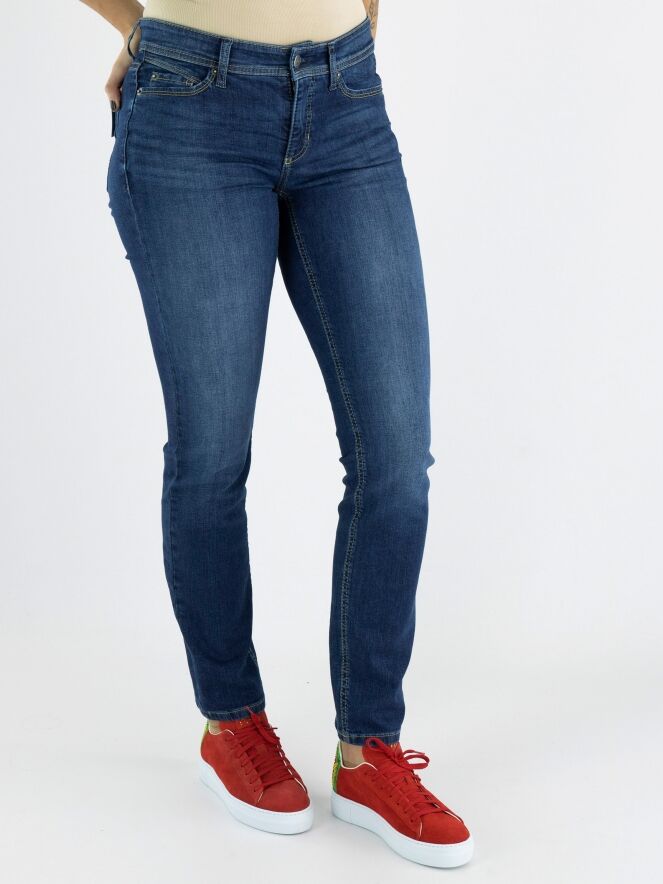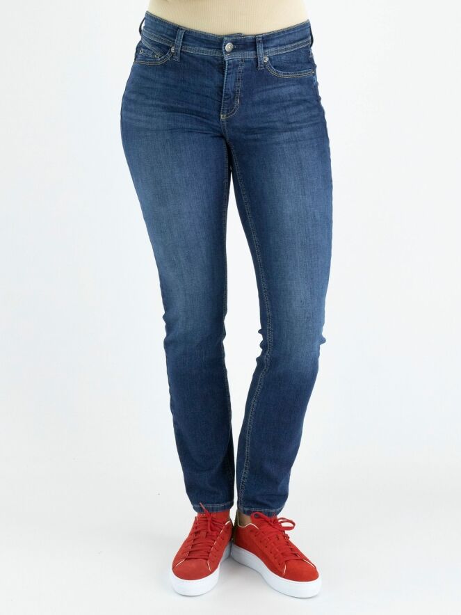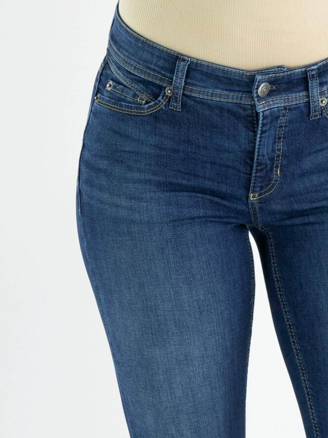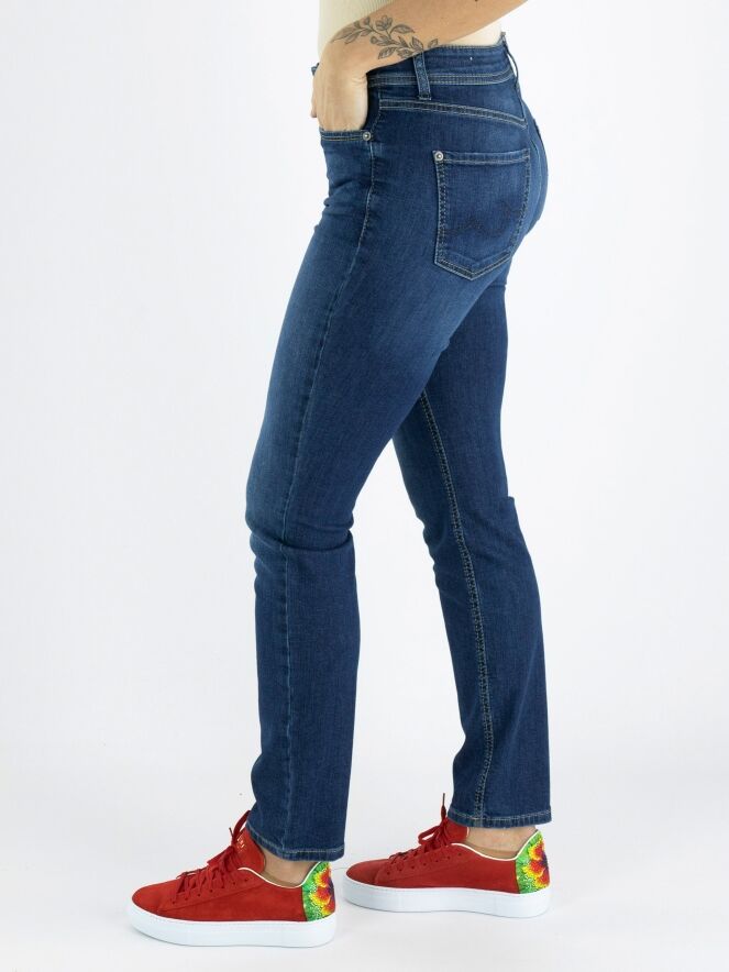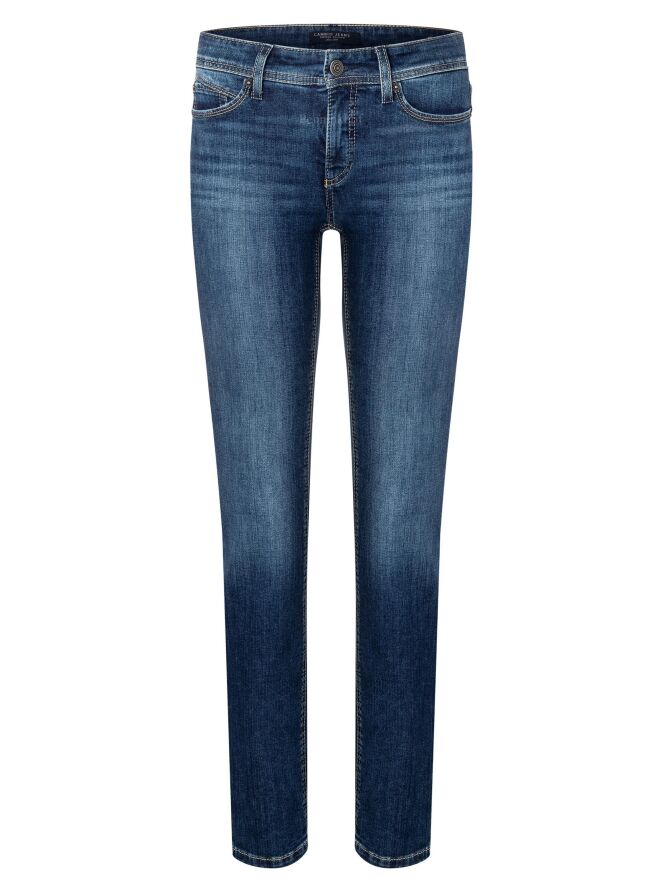 Blue jeans éco fabriqué dans un denim durable, de la marque Cambio, de couleur bleu moyen, dans un modèle 5 poches. Légèrement délavé. Lavage à 30 degrés.