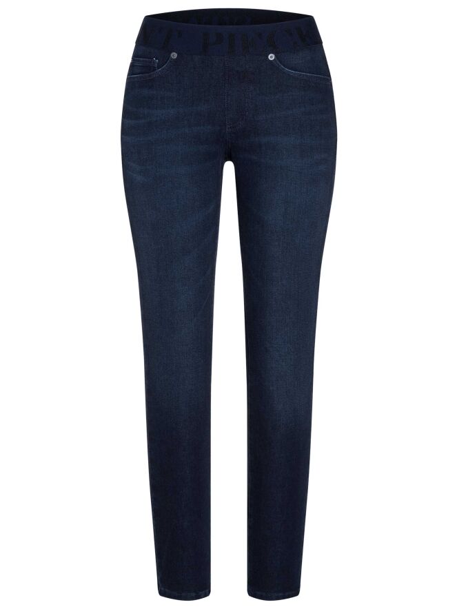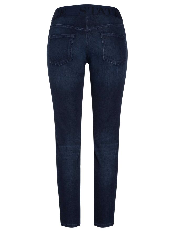 Jeans à la coupe ajustée, de la marque Cambio, en denim de couleur bleu jeans. Il est équipé d'un large élastique à la taille avec marquage en lettres noires. Modèle à 5 poches. Lavage à 30 degrés.
