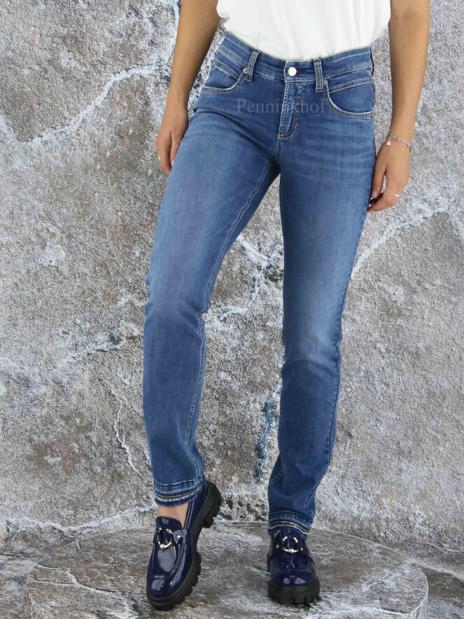 Jean basique délavé de la marque Cambio. Le jeans est un modèle à 5 poches. Le bas des jambes est orné d'une chaînette décorative de couleur argentée. Le bord des jambes est finement frangé. Lavage à 30 degrés.