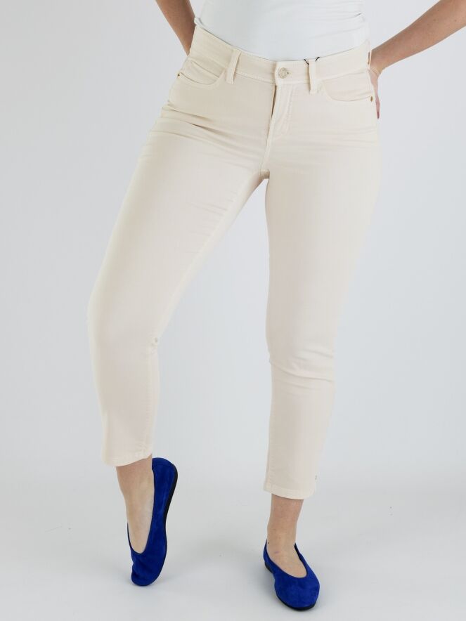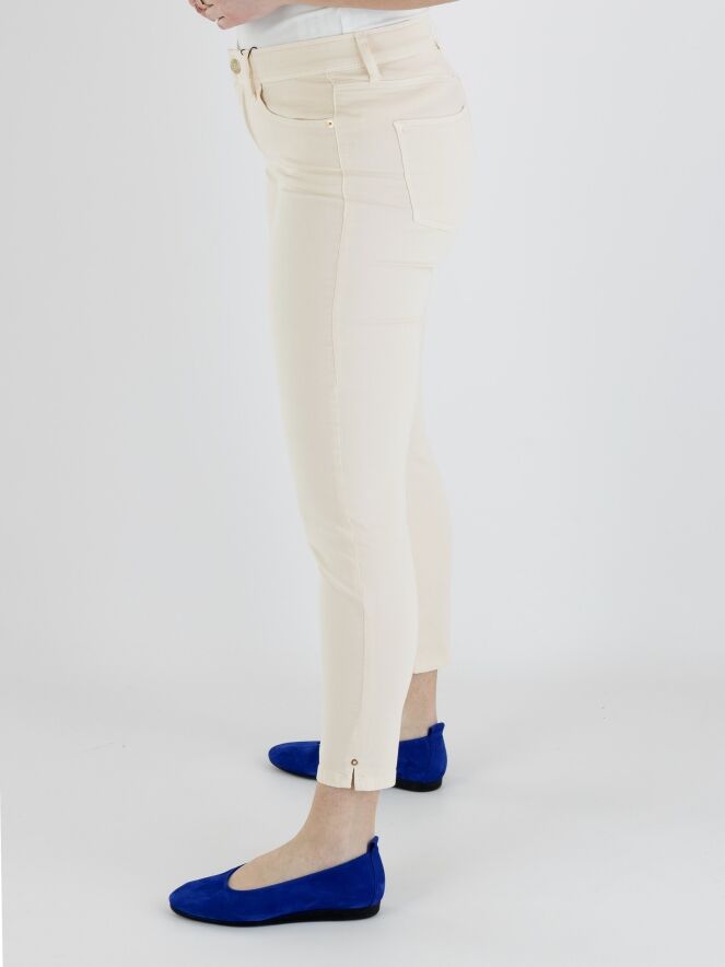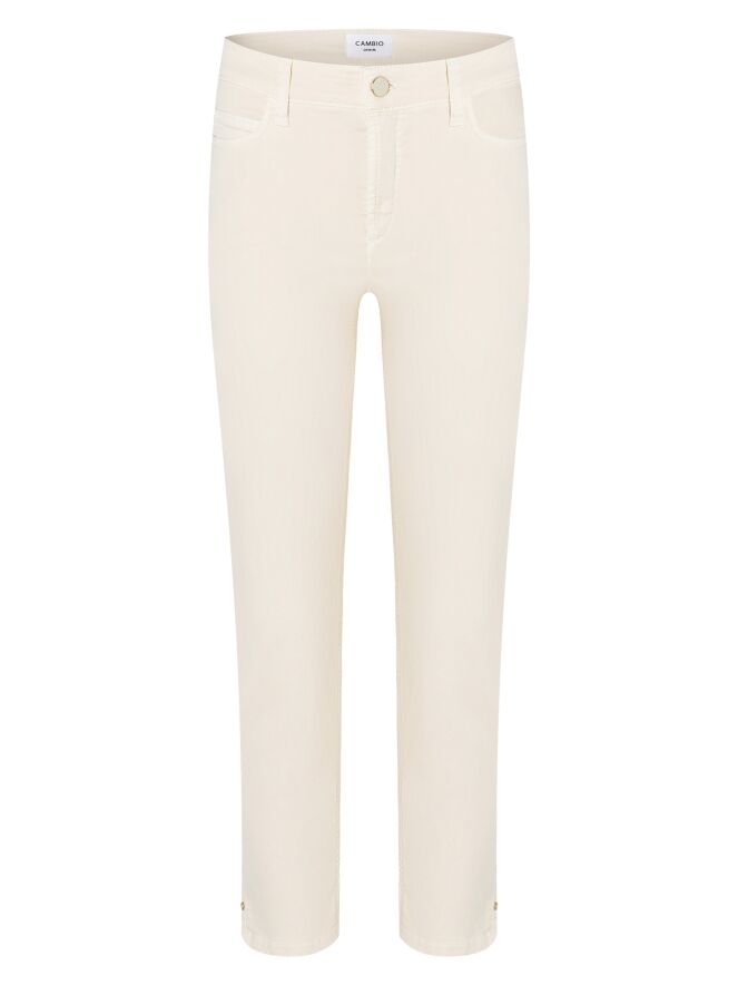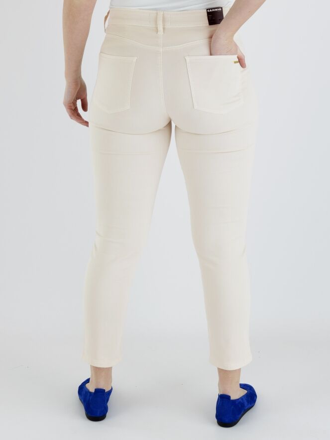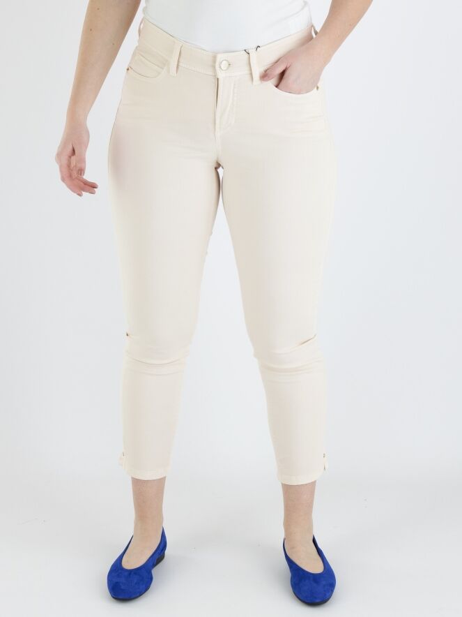 Un jean court de Cambio de couleur blanc crème. Au bas des jambes, il y a une petite fente sur les côtés avec une clou. Le jean est de style 5 poches et peut être lavé à 30 degrés.