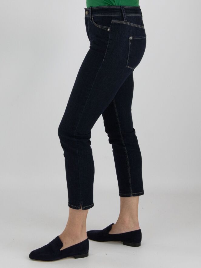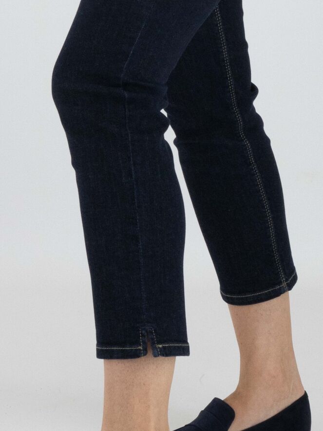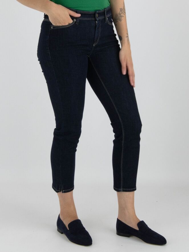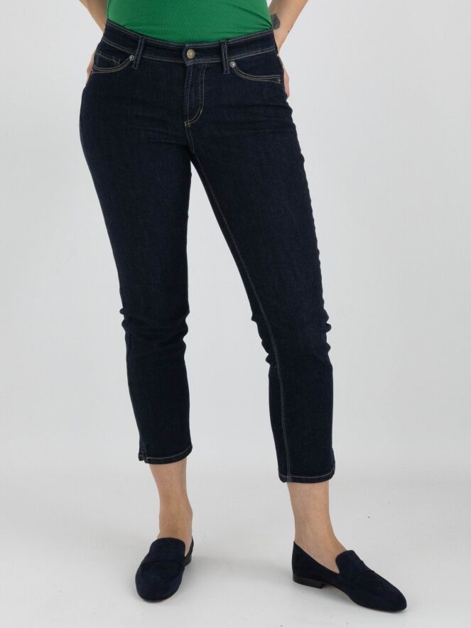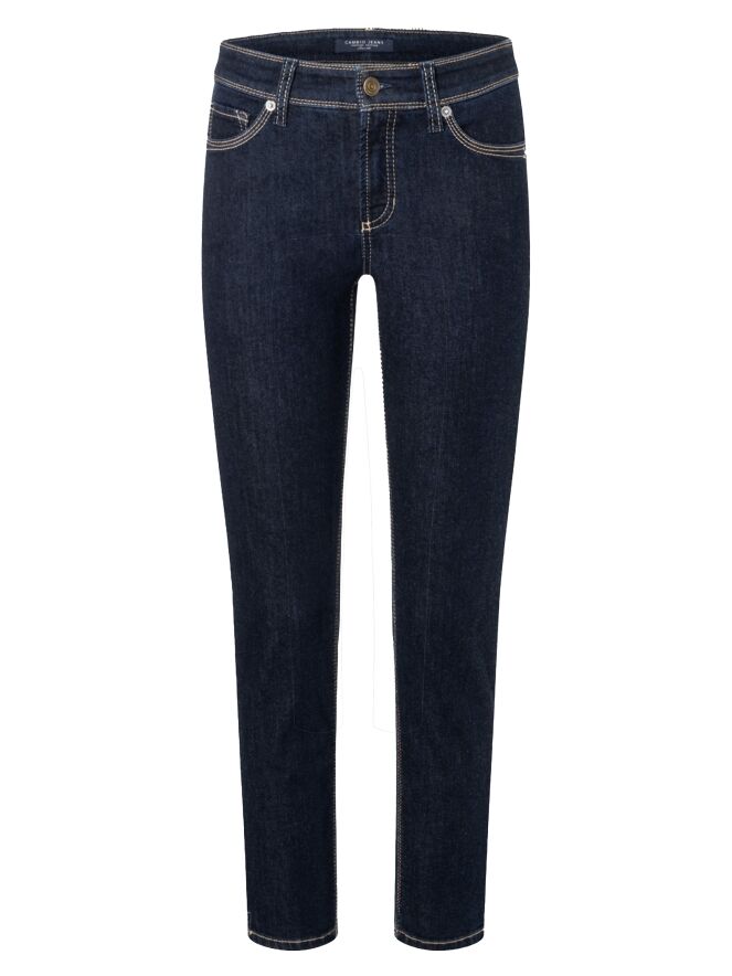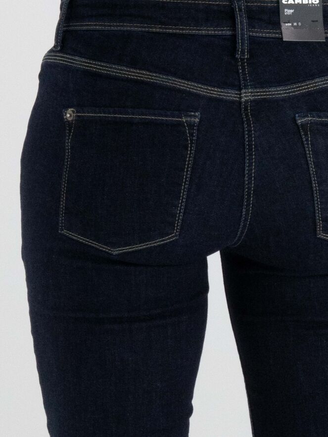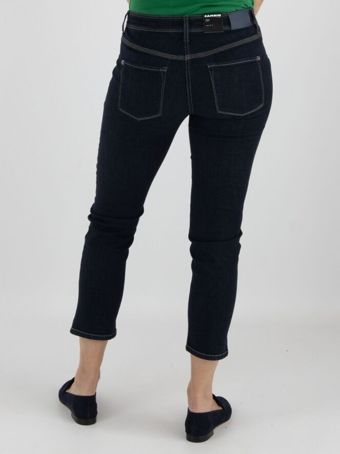 Un jean de Cambio en couleur denim foncé. Le jean est un modèle à 5 poches et peut être lavé à 30 degrés.