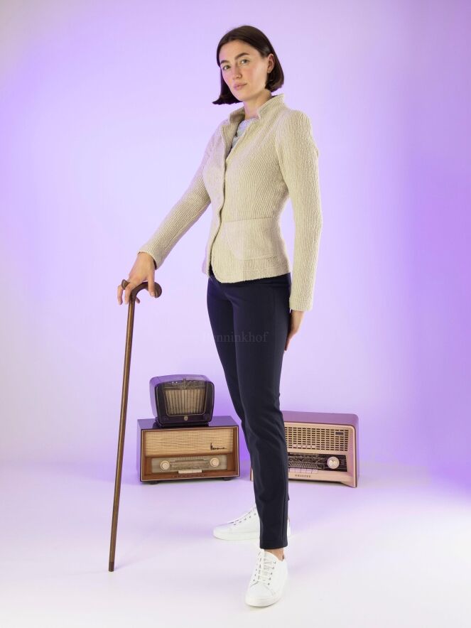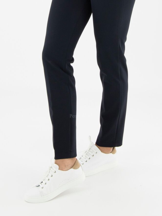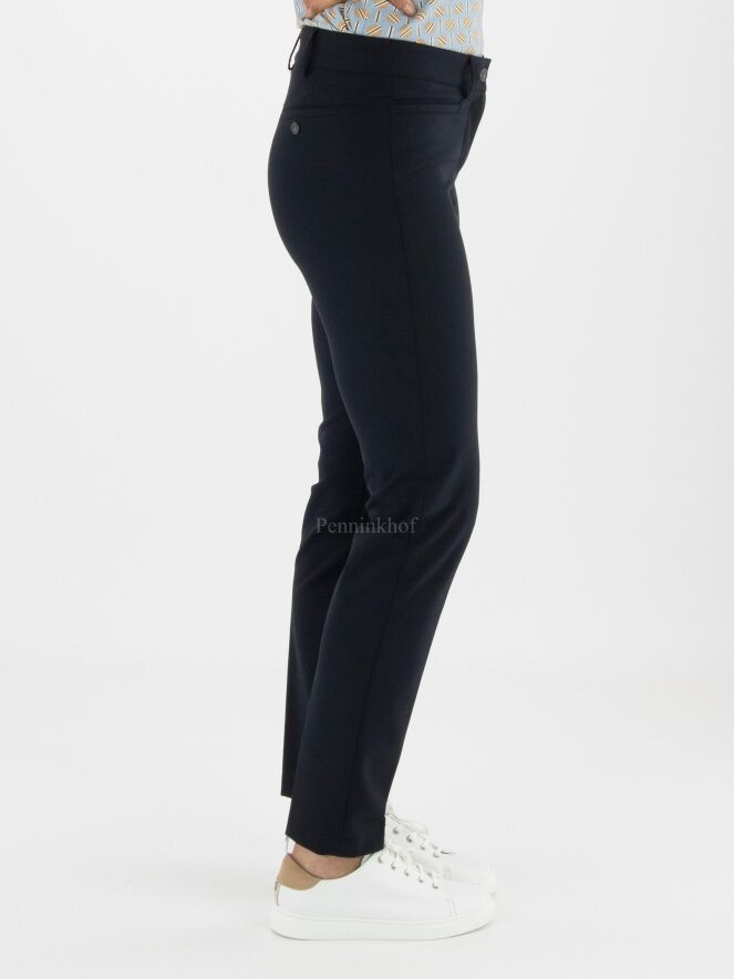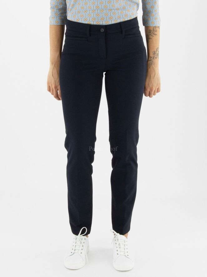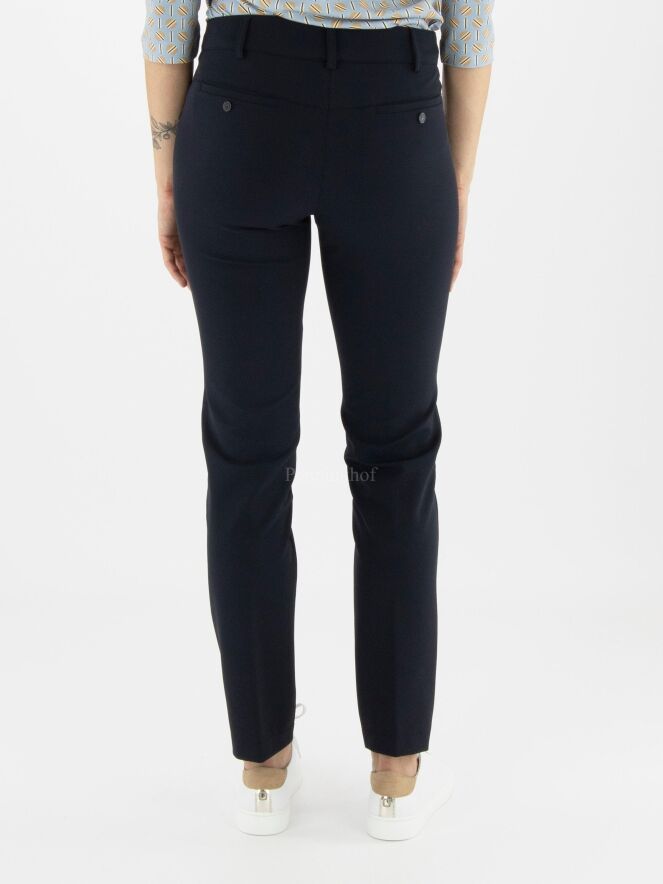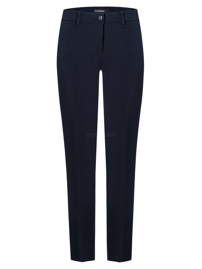 Elégant pantalon basique de la marque Cambio, de couleur bleu marine. Modèle à 4 poches à fente pour ce pantalon de coupe droite. Lavage à la main.