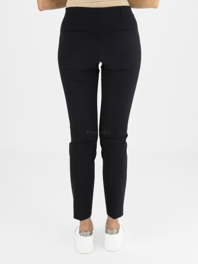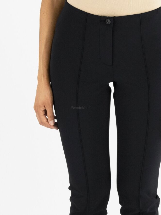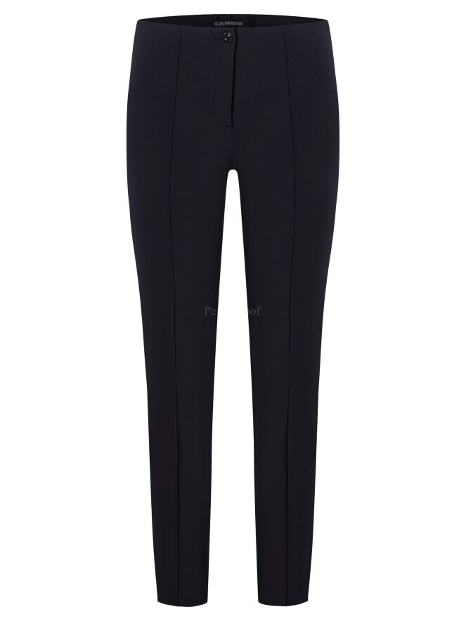 Pantalon de la marque Cambio, de couleur bleu marine. La taille est élastiquée et la jambe est marquée par une surpiqûre centrale sur toute sa hauteur. Lavage à la main.