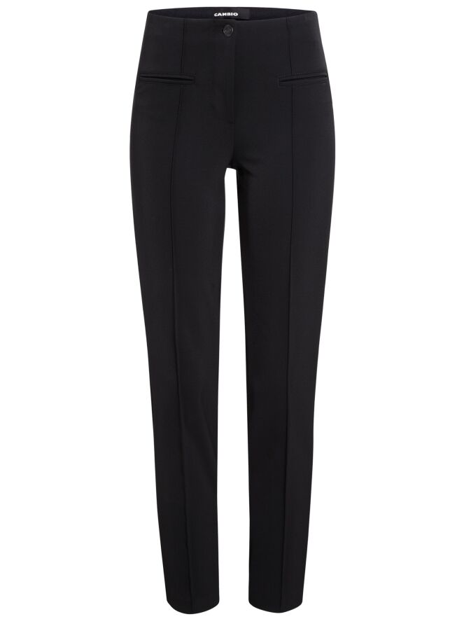 Pantalon de coupe droite, de la marque Cambio, de couleur noire. Un pli sur chaque jambe et les 2 poches horizontales zippées lui apportent une touche élégante. Lavage à 30 degrés.