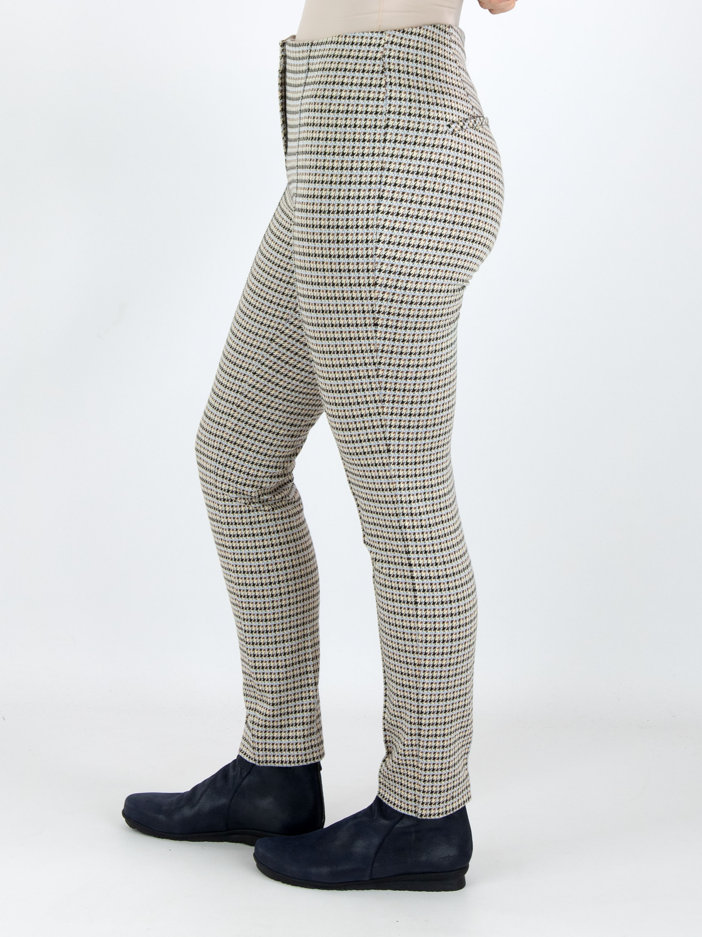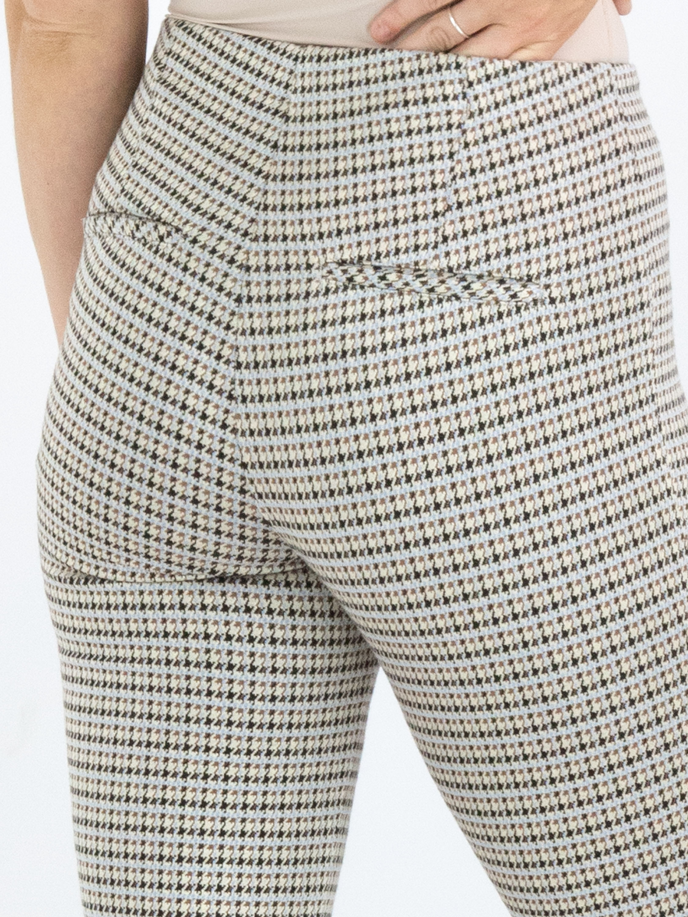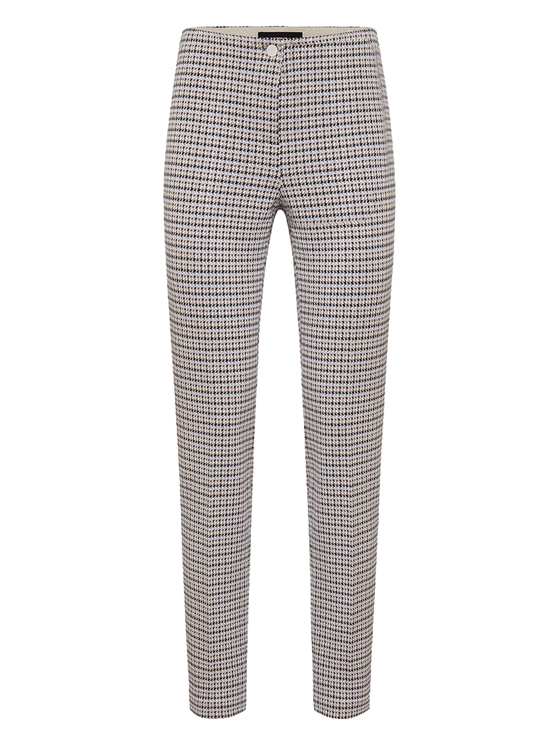 Un pantalon de Cambio avec un imprimé pied-de-coque dans les couleurs bleu glace, cognac et noir sur un fond beige. La taille est élastique. Au centre des jambes, il y a une couture inversée. Ce pantalon peut être lavé à la main.