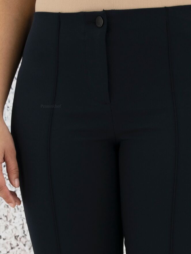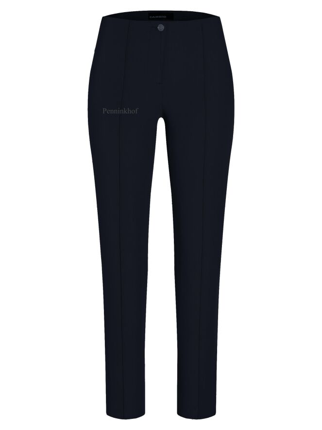 Pantalon de la marque Cambio, de couleur bleu marine. Un pli de repassage surpiqué orne la jambe. Une bande élastique équipe la taille. Lavage à la main.