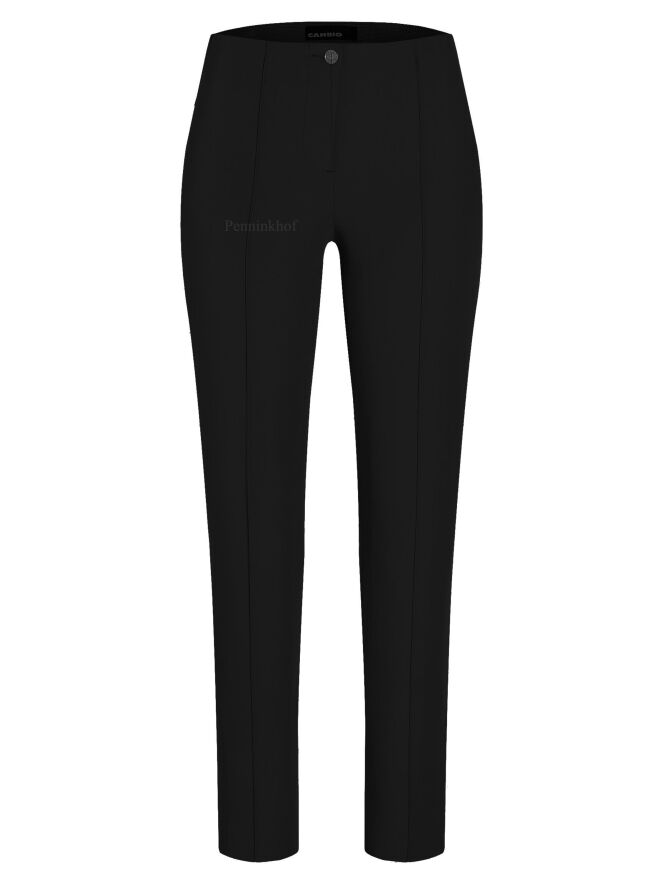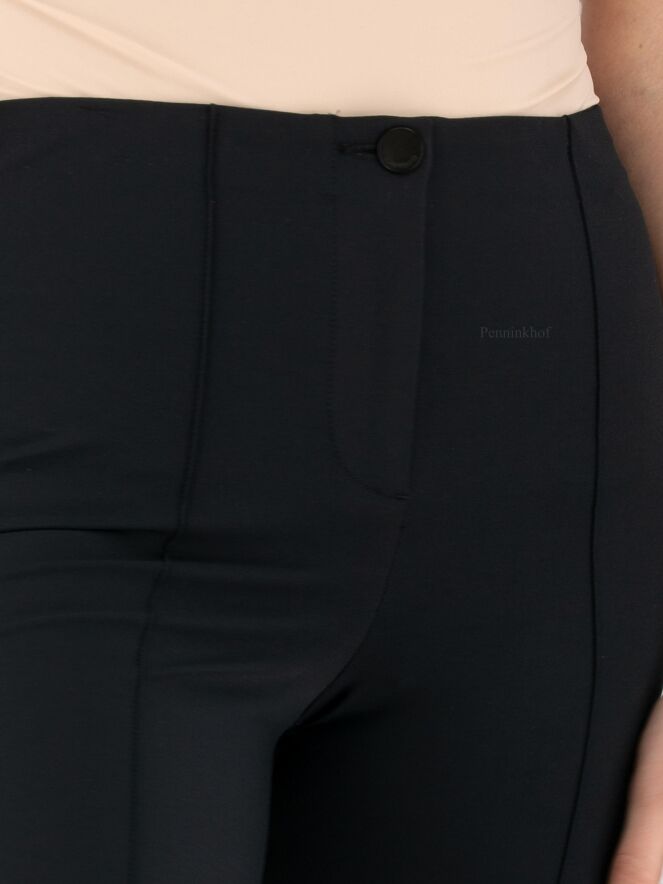 Pantalon de la marque Cambio, de couleur noire. Un pli de repassage surpiqué orne la jambe. Une bande élastique équipe la taille. Lavage à la main.