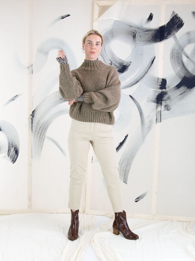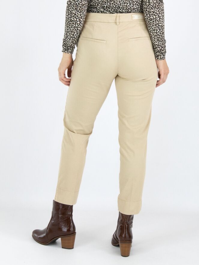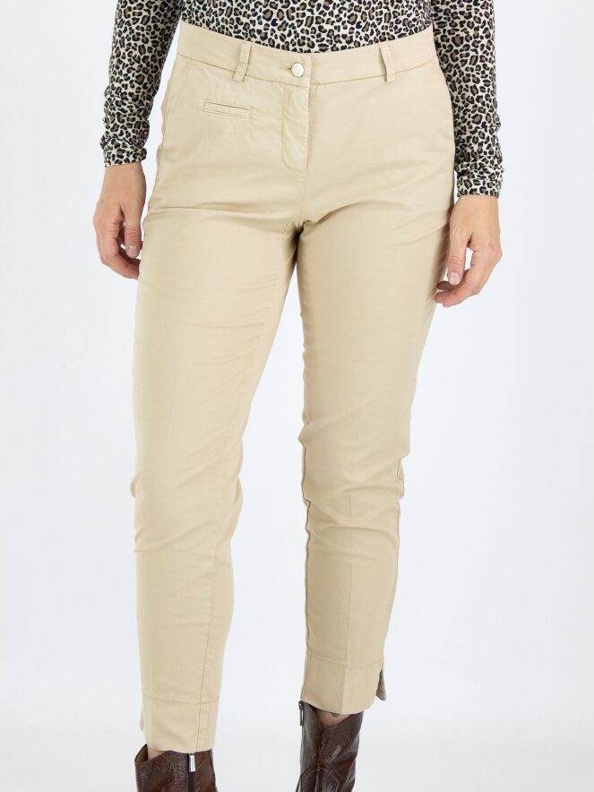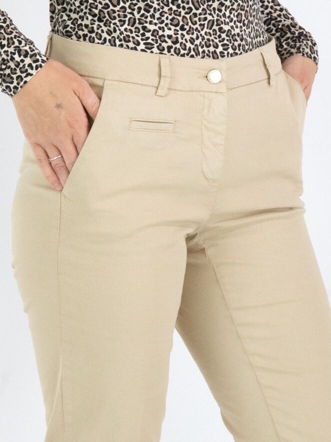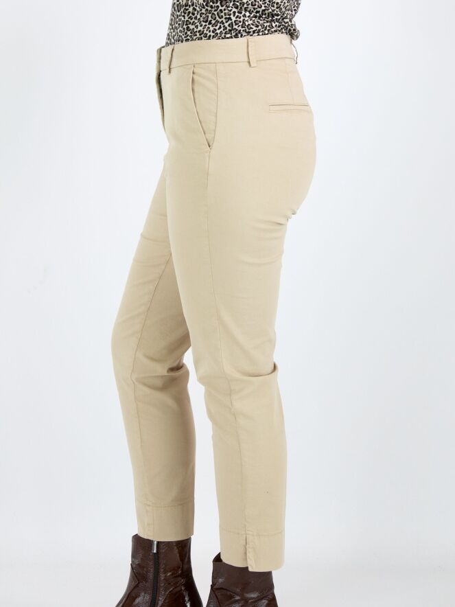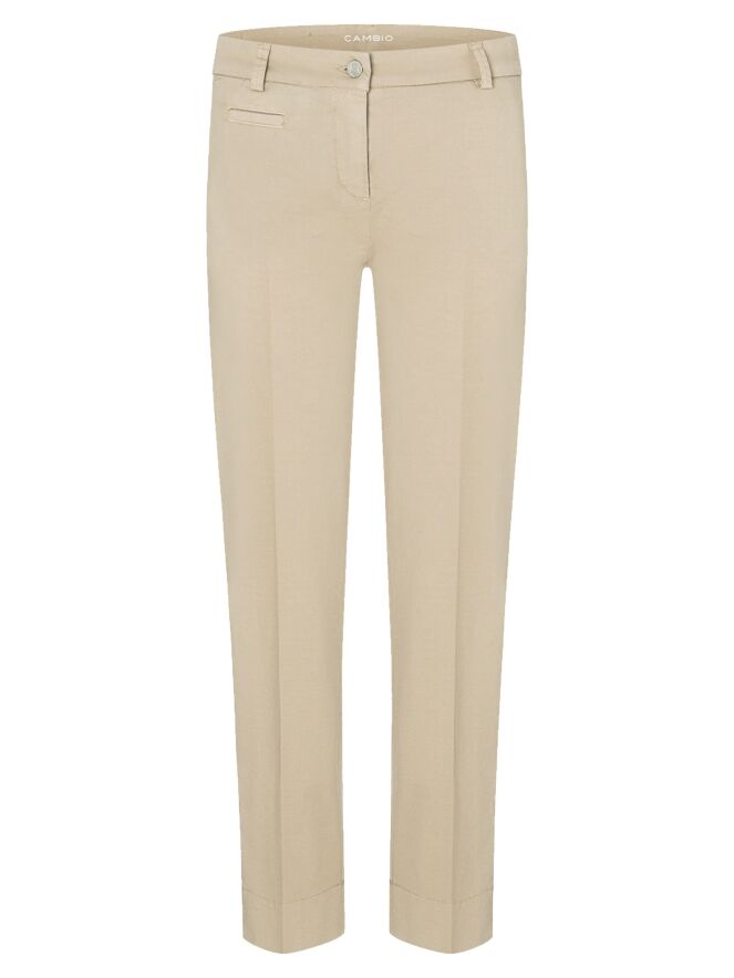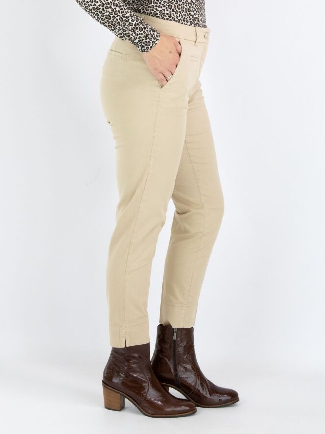 Un pantalon Cambio de couleur sable. Le pantalon est équipé de poches passepoilées et d'un pli marqué au centre des jambes. À la base, il y a une large bande avec une petite fente sur le côté. Ce pantalon peut être lavé à 30 degrés.