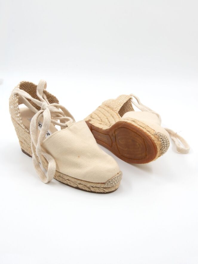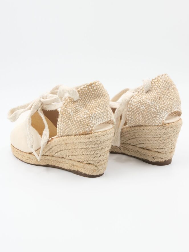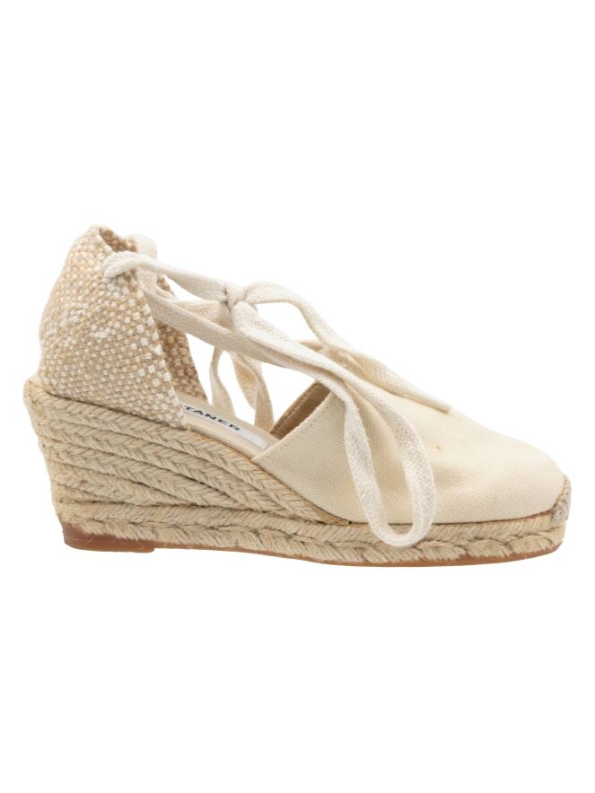 Une espadrille de Castagner avec un talon compensé de hauteur moyenne en blanc crème. La bride de talon est tressée en blanc et beige.