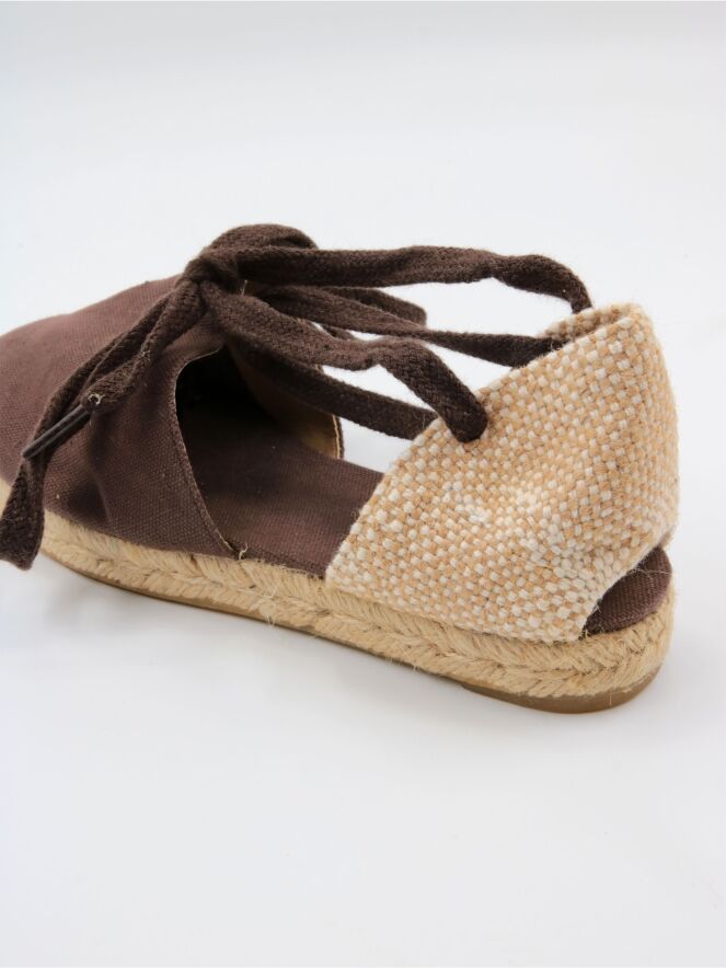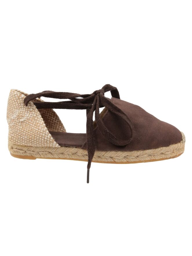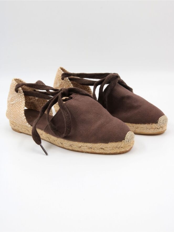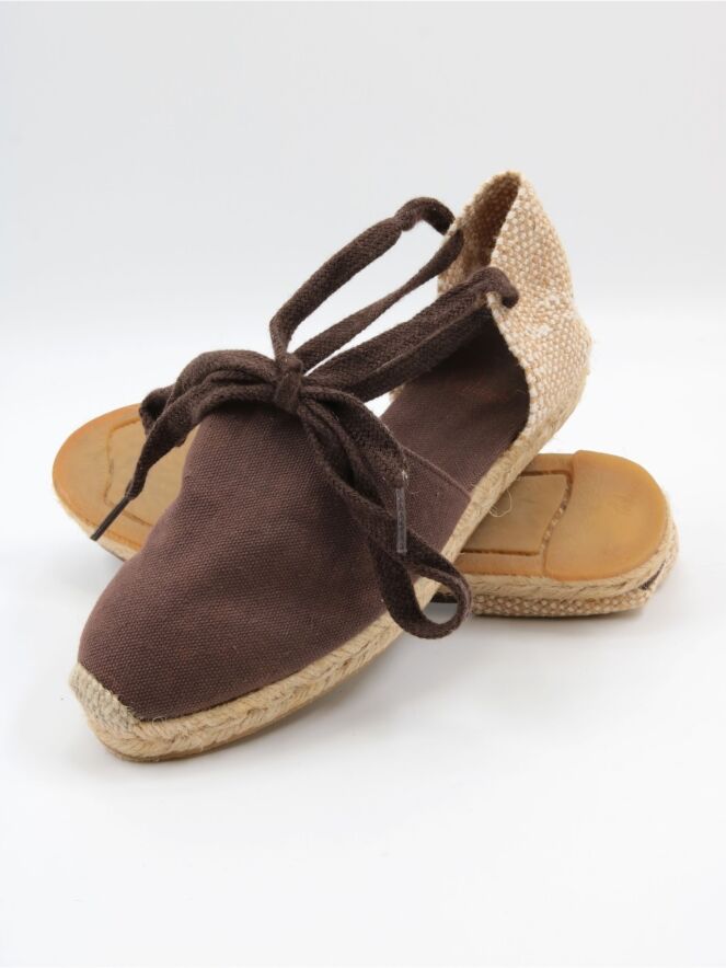 Une espadrille plate de Castagner en brun moka. La bride de talon est tressée en blanc et beige.