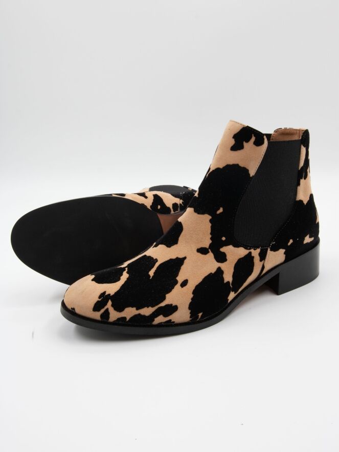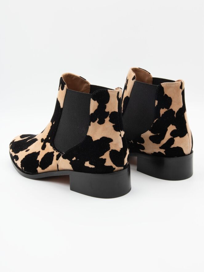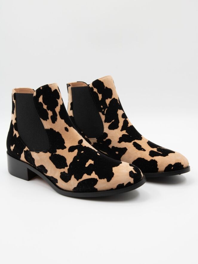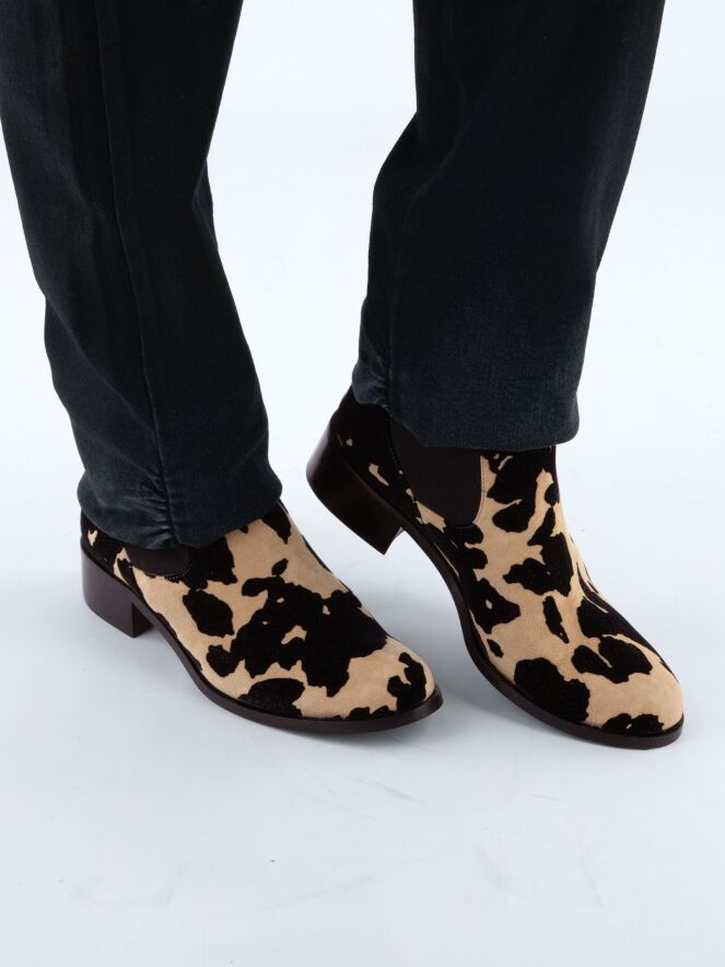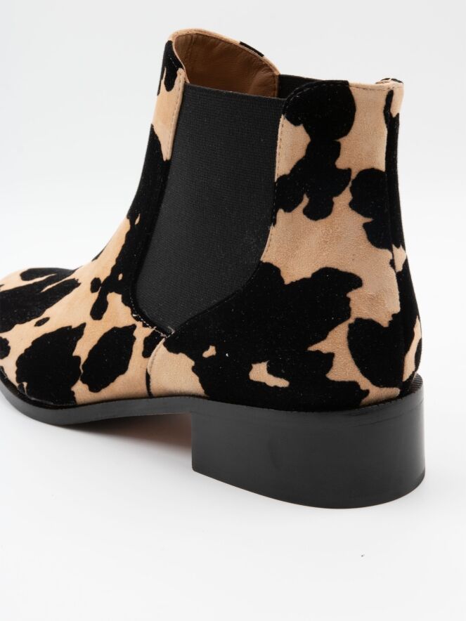 Une bottine courte de la marque Cervone avec un imprimé tacheté dans les couleurs camel et noir. Des empiècements élastiques sont insérés de chaque côté de la tige. La bottine a un bout rond et l’intérieur est doublé de cuir.