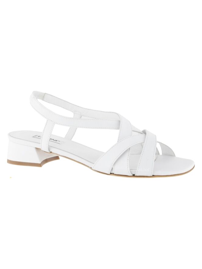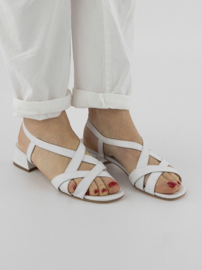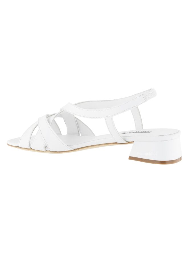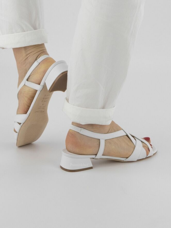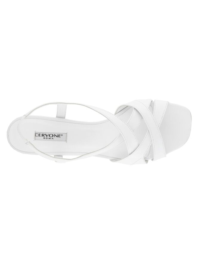 Escarpin ouvert de la marque Cervone, en cuir de couleur blanche. Trois sangles sont croisées sur l'avant-pied. Une sangle court sur les côtés du pied jusqu'au talon comprenant une partie élastique sur le talon. Le talon est recouvert du même matériau que la chaussure.