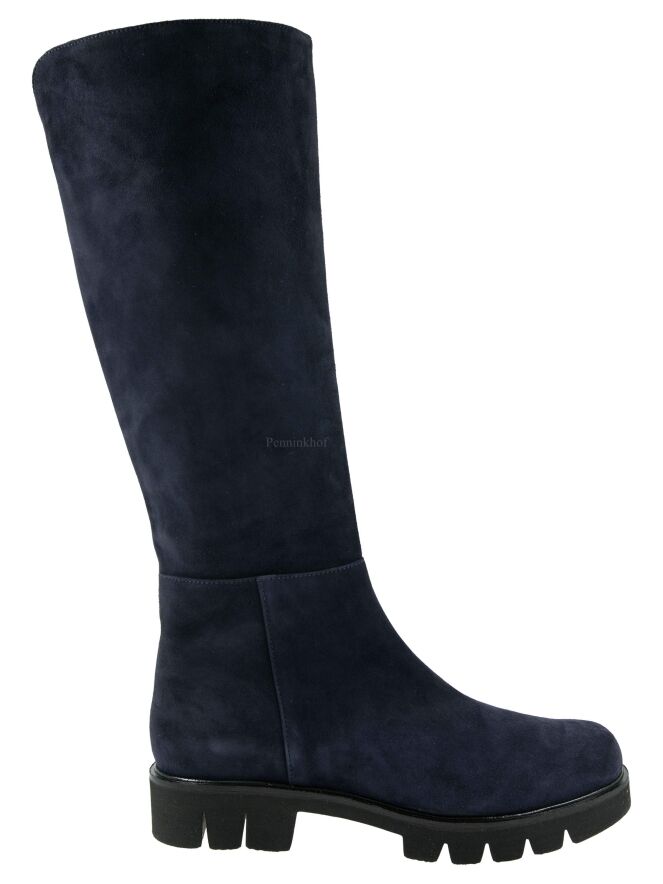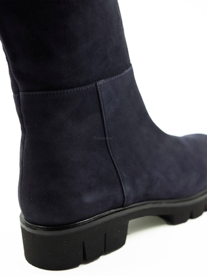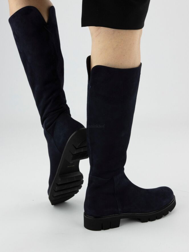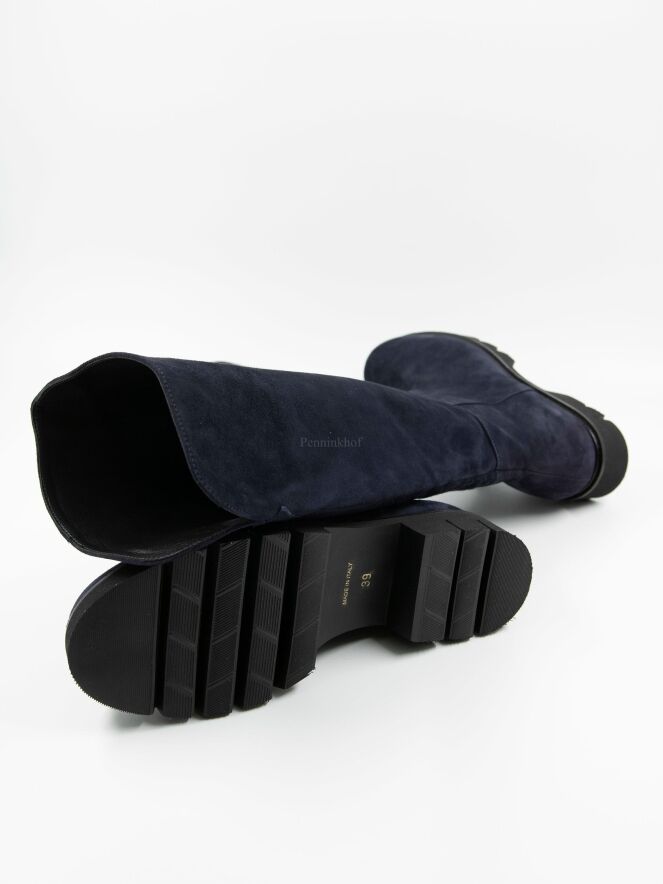 Une botte haute de Cervone en bleu marine. La botte a un bout arrondi et à l'intérieur se trouve une fermeture éclair jusqu'à mi-mollet. L'intérieur de la botte est doublé de cuir.