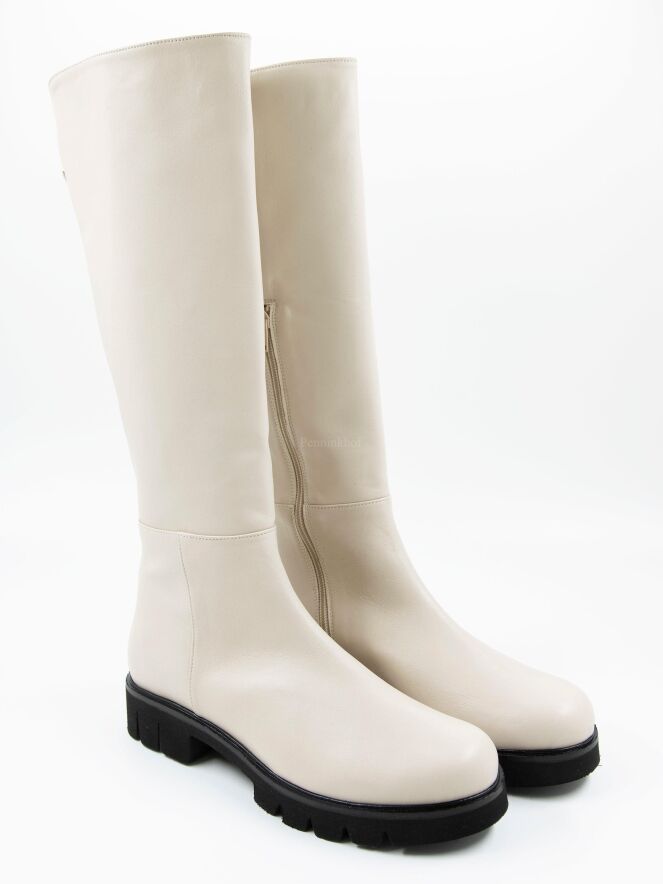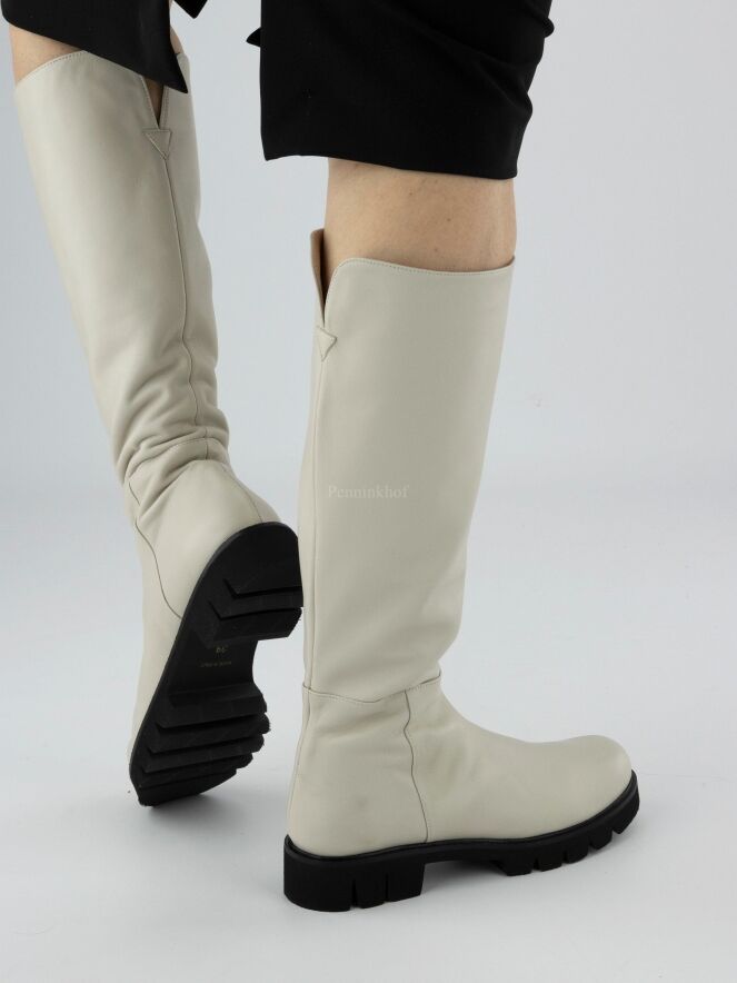 Une botte haute de Cervone en blanc crème. La botte a un nez rond et à l'intérieur se trouve une fermeture à glissière jusqu'à mi-mollet. L'intérieur de la botte est doublé de cuir.