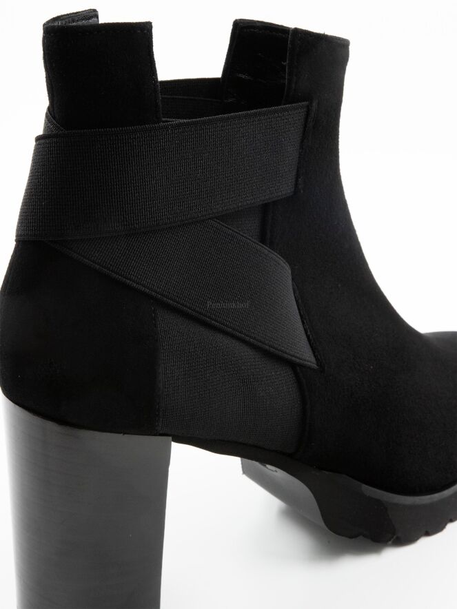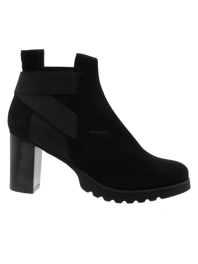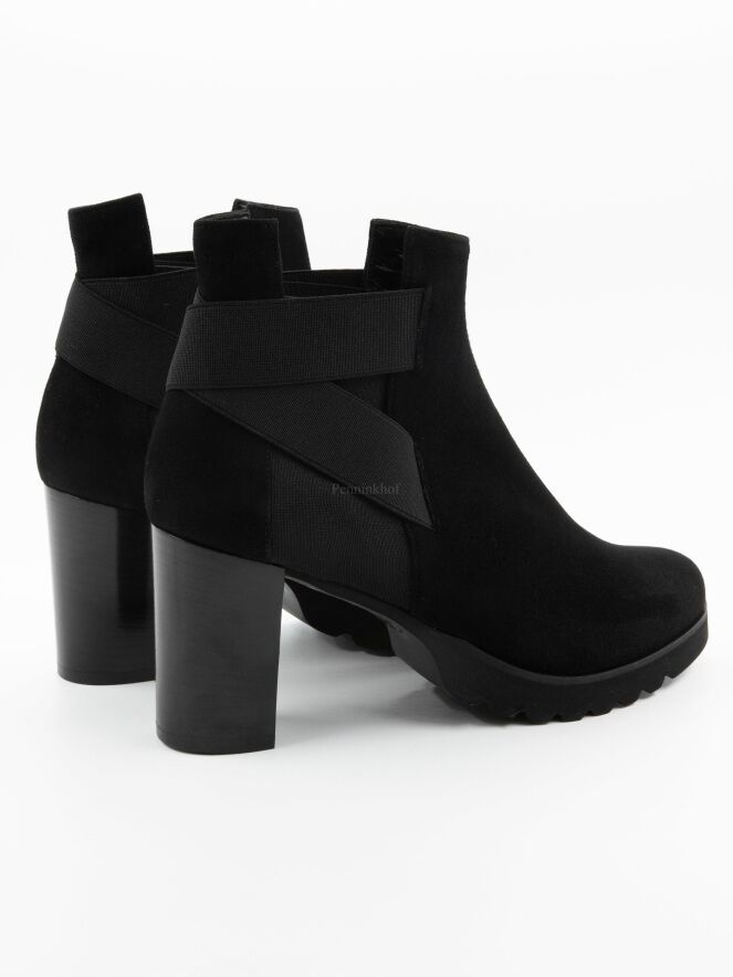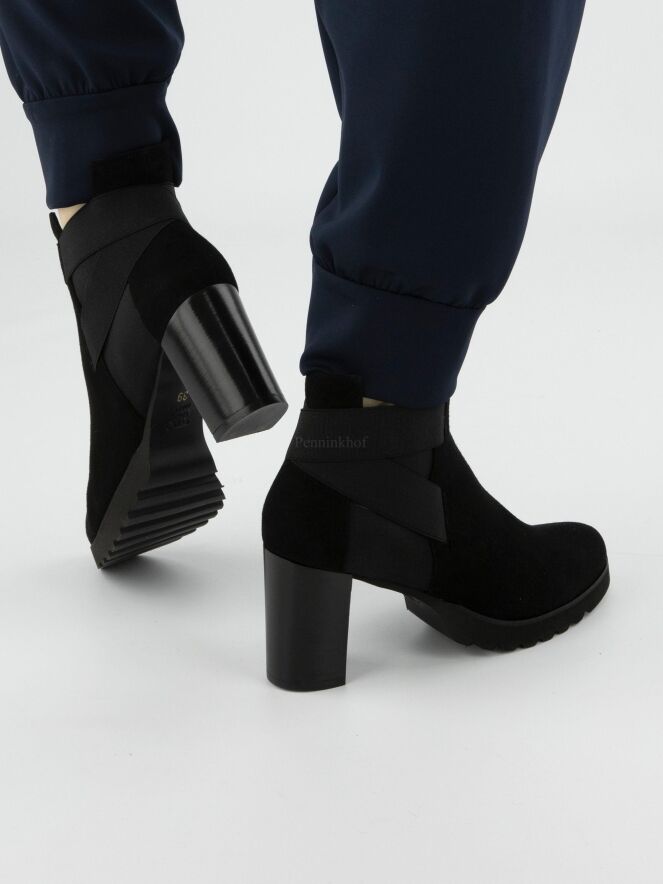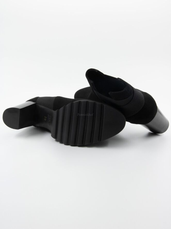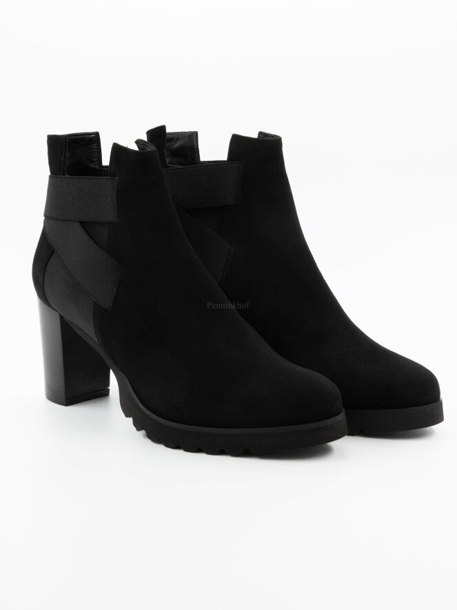 Une bottine de Cervone en noir. La tige est élastiquée de part et d'autre de la tige et comporte deux sangles élastiques supplémentaires. La semelle à plateforme basse est nervurée. L'intérieur est doublé de cuir.