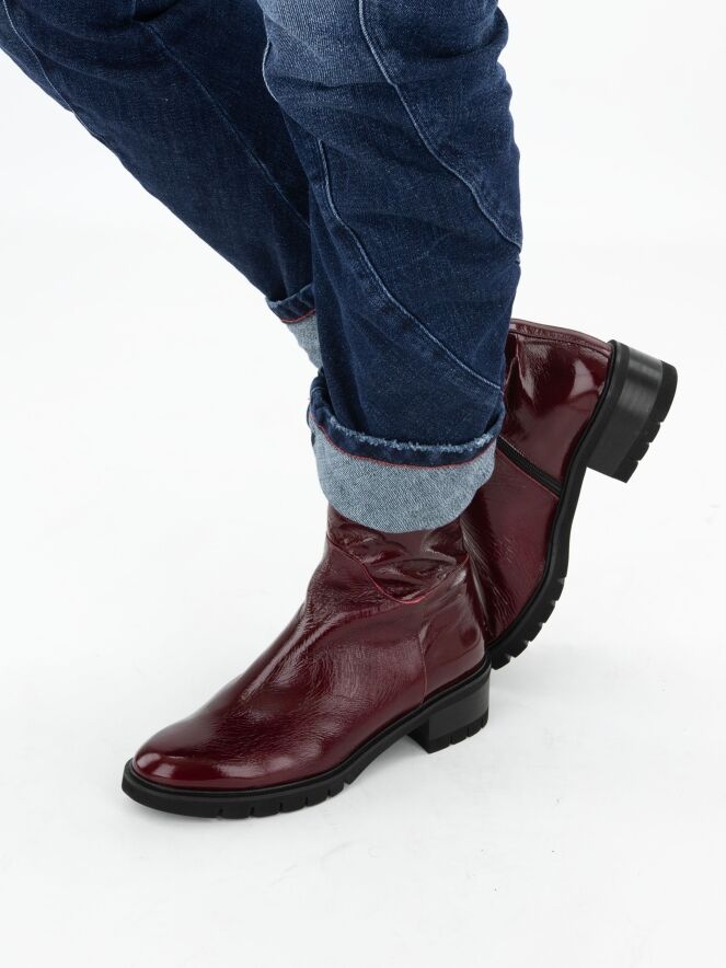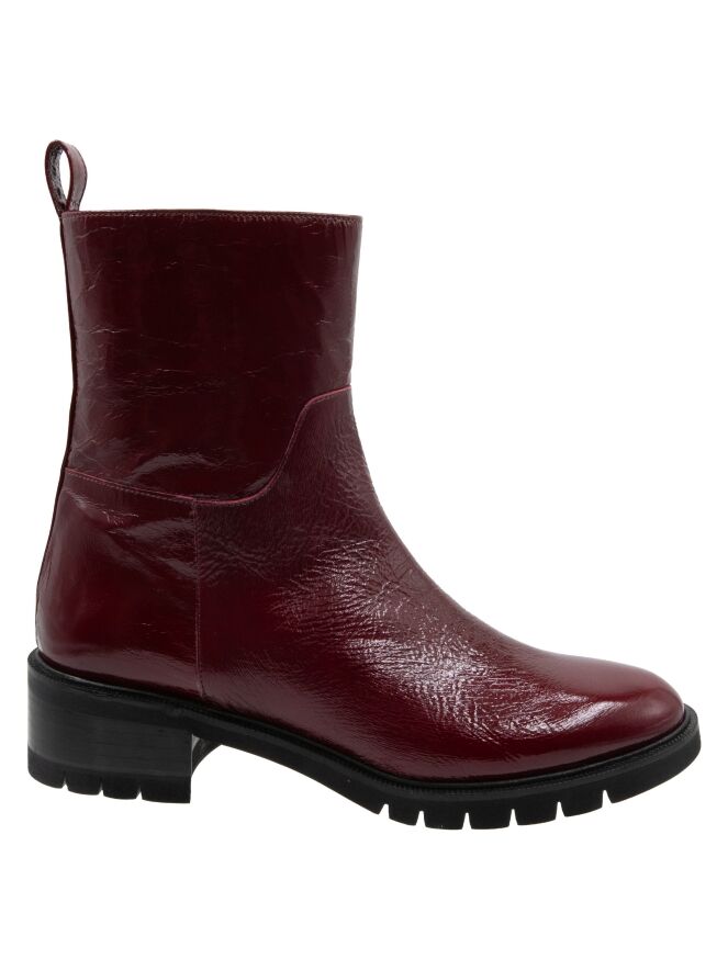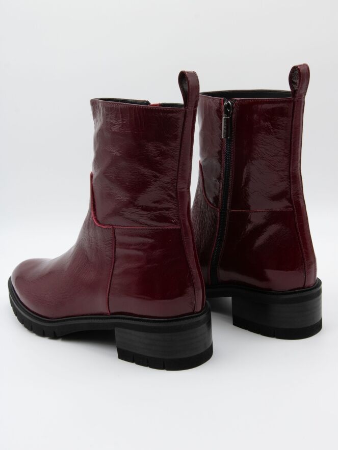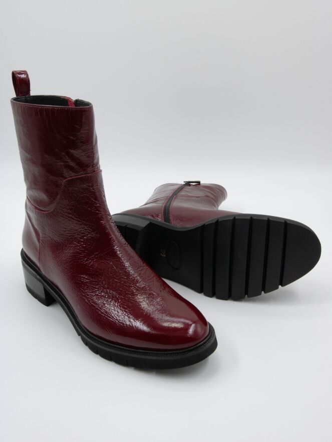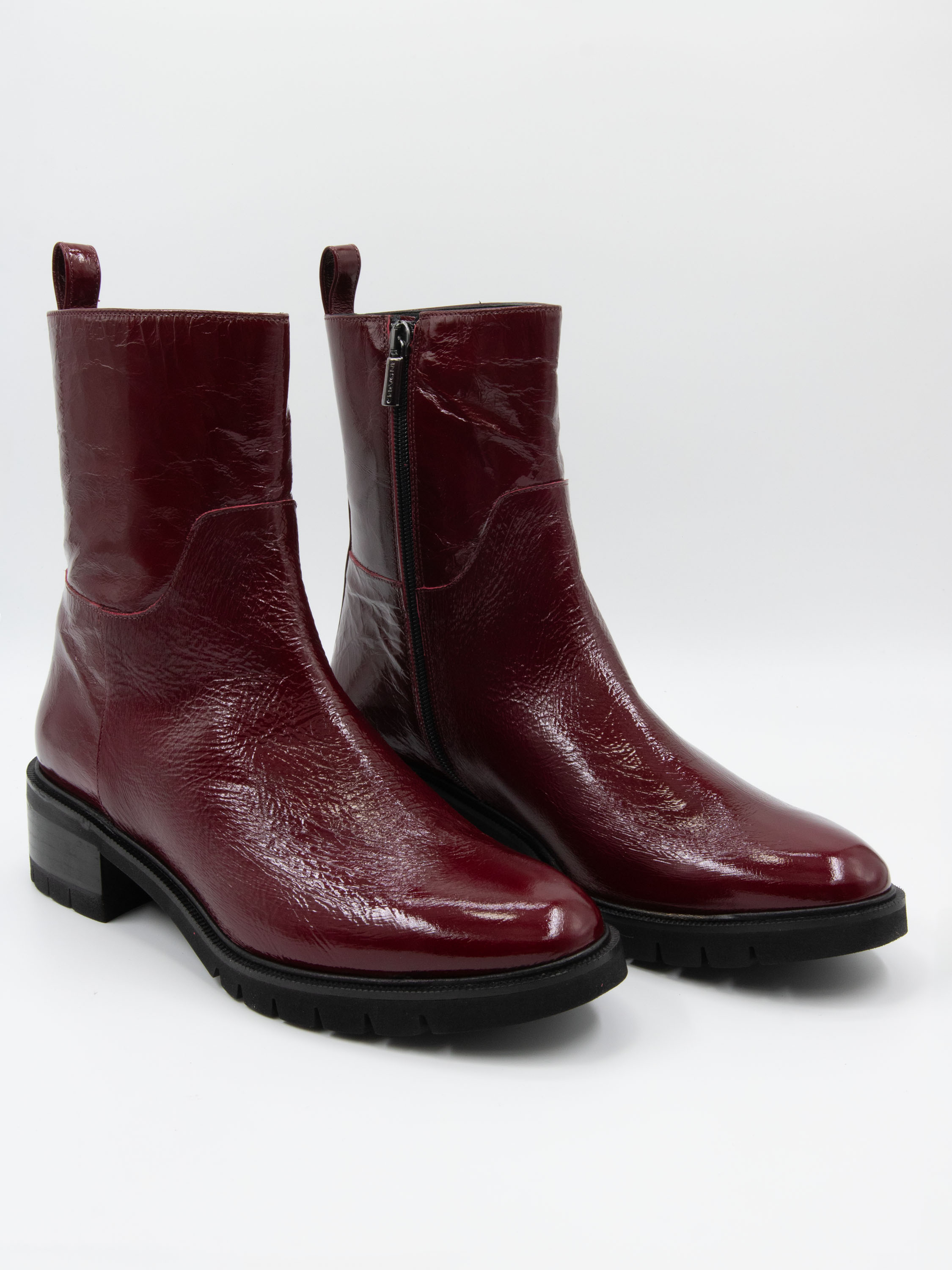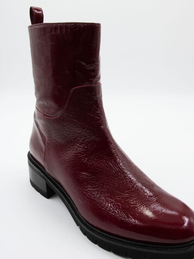 Une bottine de Cervone en cuir verni froissé de couleur bordeaux. Le long du bord de la semelle se trouve une fine trépointe. Le talon est partiellement de couleur bois et partiellement noir. À l'intérieur, il y a une fermeture éclair et l'intérieur est doublé de cuir.