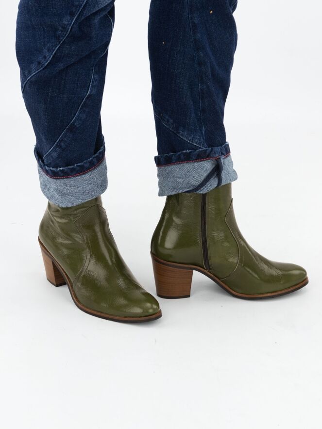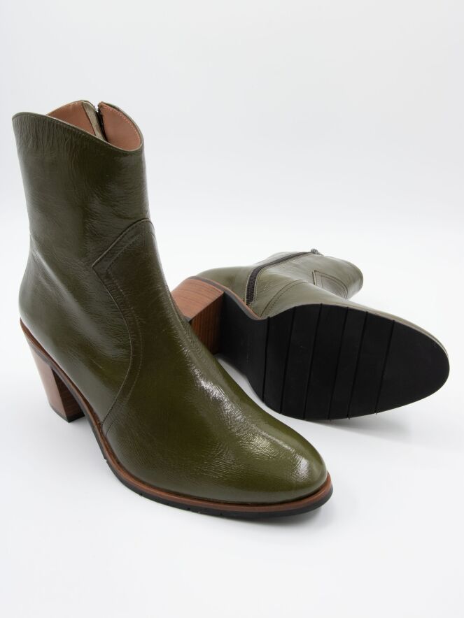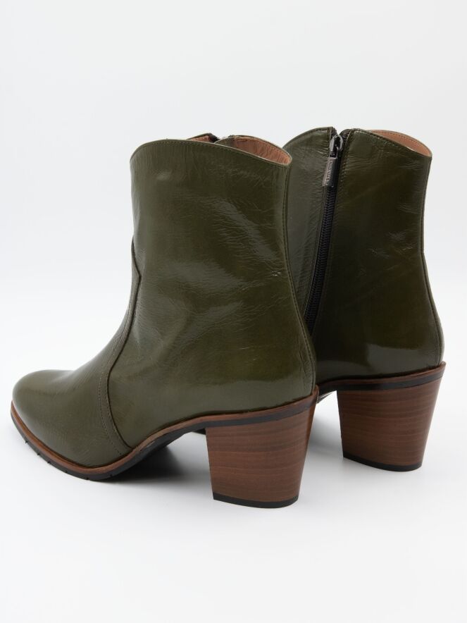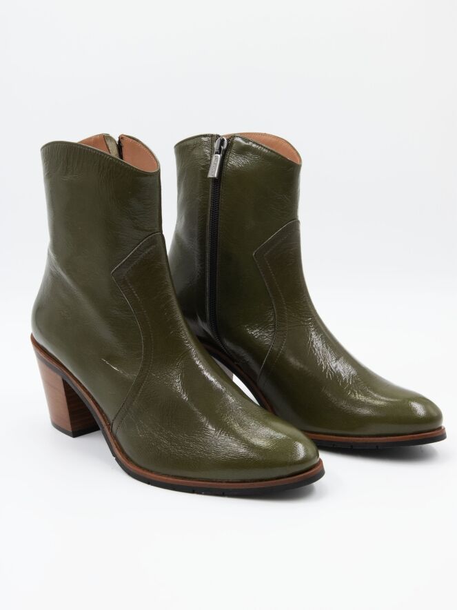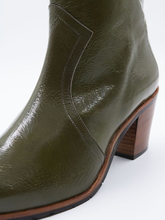 Une bottine western de Cervone en cuir verni froissé de couleur vert olive. La bottine a un bout fin et une fermeture éclair à l'intérieur. L'intérieur de la bottine est doublé de cuir.