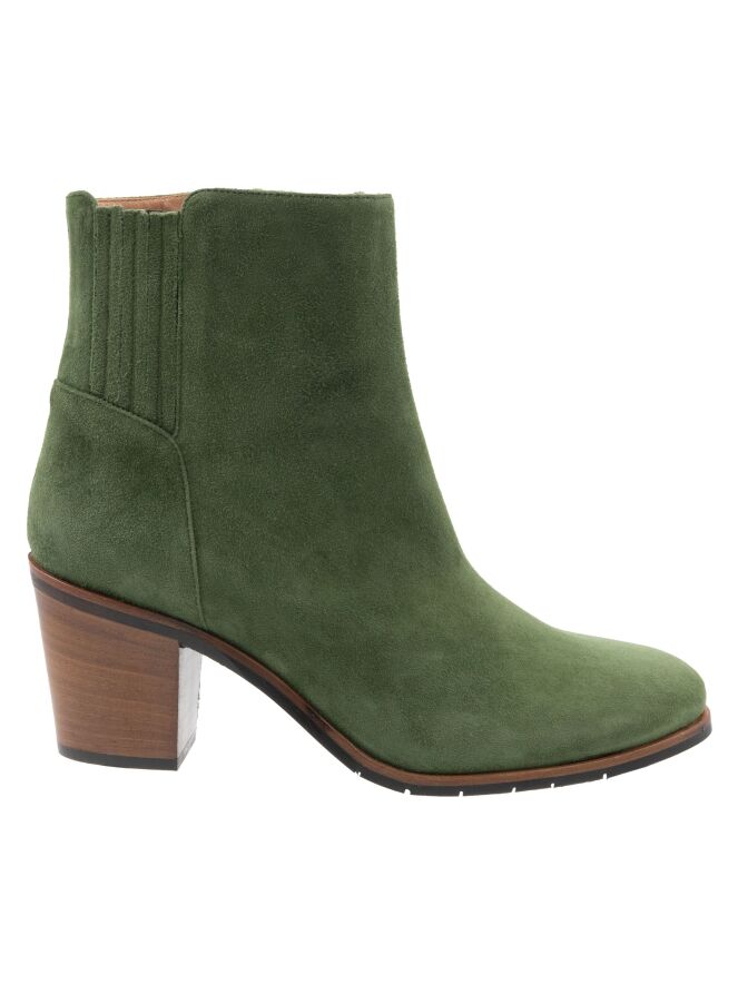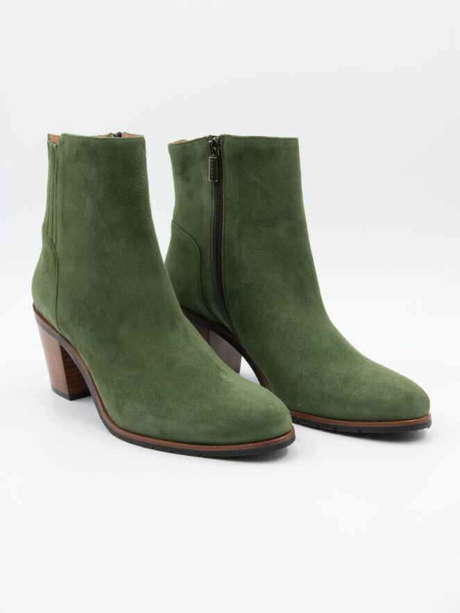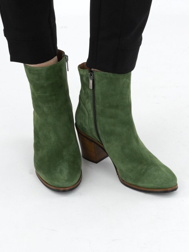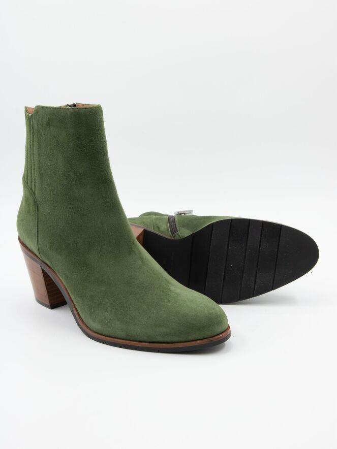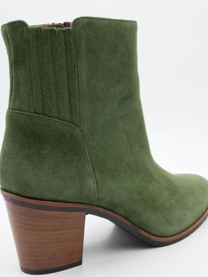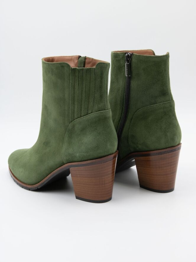 Une courte botte western de Cervone de couleur vert olive. La botte a un bout effilé et une fermeture éclair à l'intérieur. À l'arrière de la tige, le cuir est découpé avec un élastique derrière. L'intérieur est doublé de cuir.