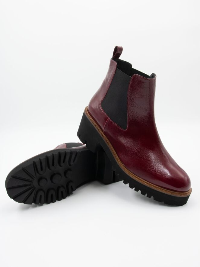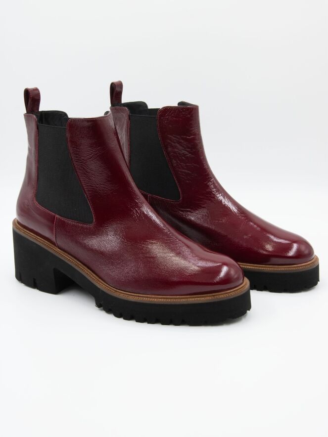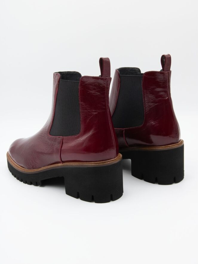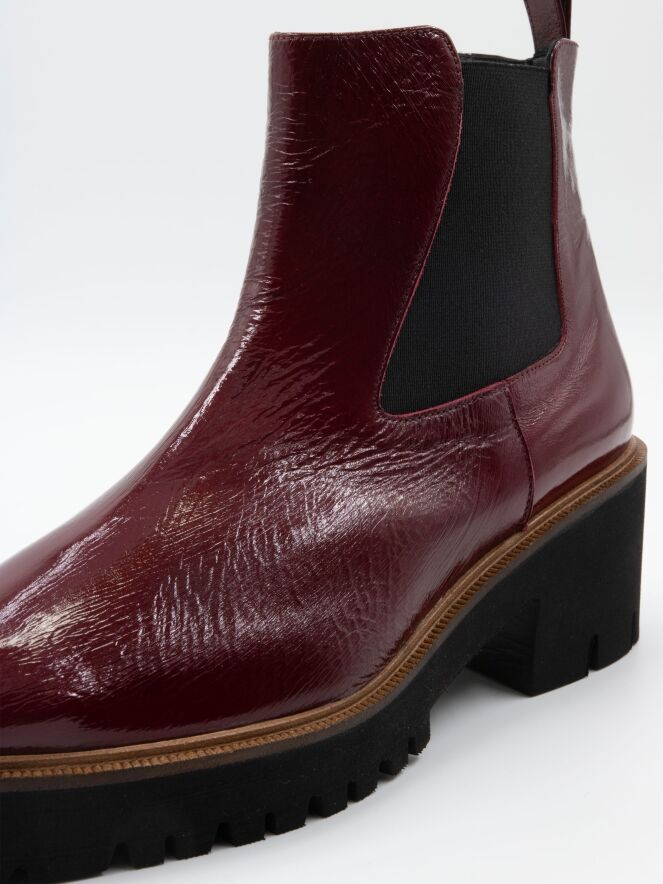 Une bottine de Cervone en cuir verni froissé de couleur bordeaux. Le long du bord de la semelle se trouve une fine trépointe décorative. Il y a des élastiques sur les côtés de la tige. La semelle sportive avec le talon bloc est crantée. L'intérieur de la botte est doublé de cuir.