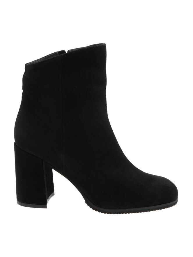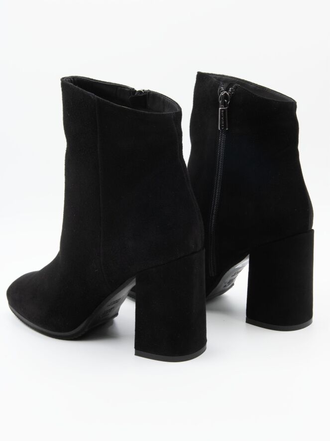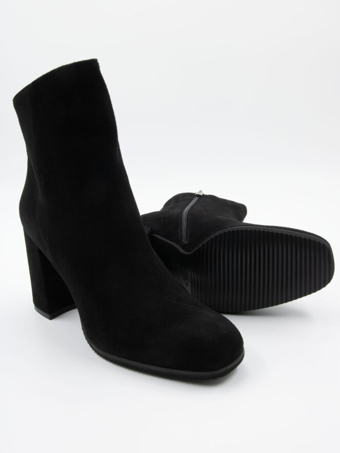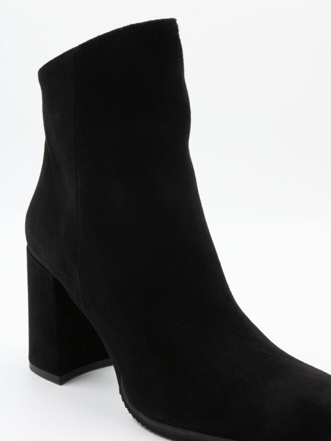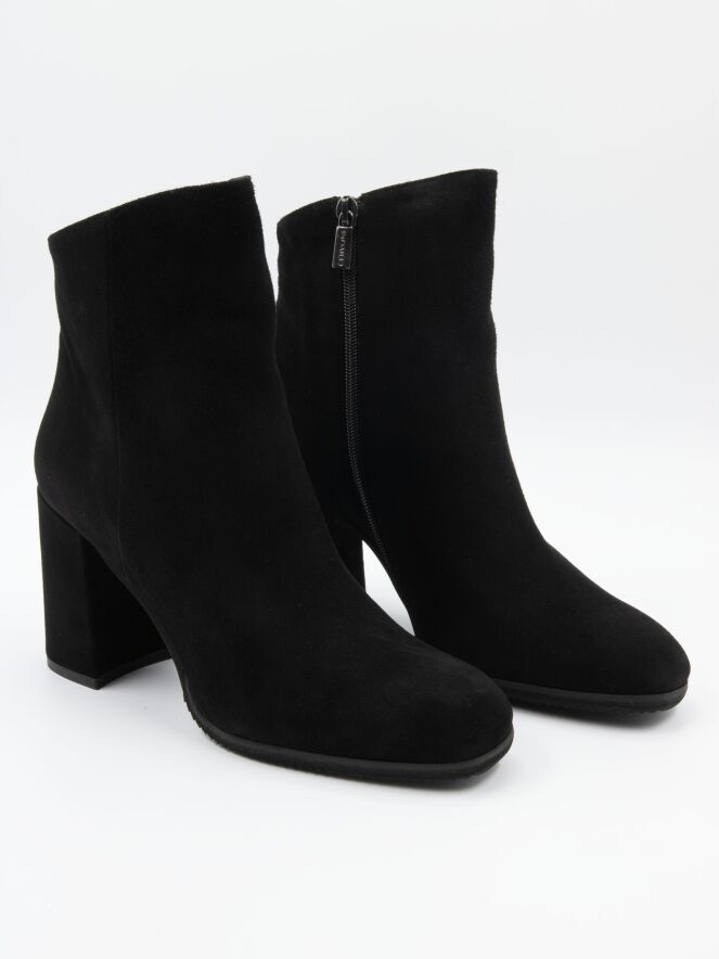 Une bottine de Cervone de couleur noire. La botte a un talon bloc recouvert du même matériau que la botte. Le bord de la tige est coupé en biais. Il y a une fermeture éclair à l'intérieur, et l'intérieur est doublé de cuir.