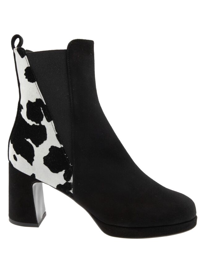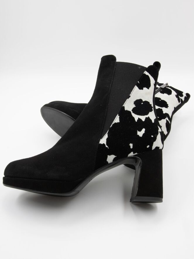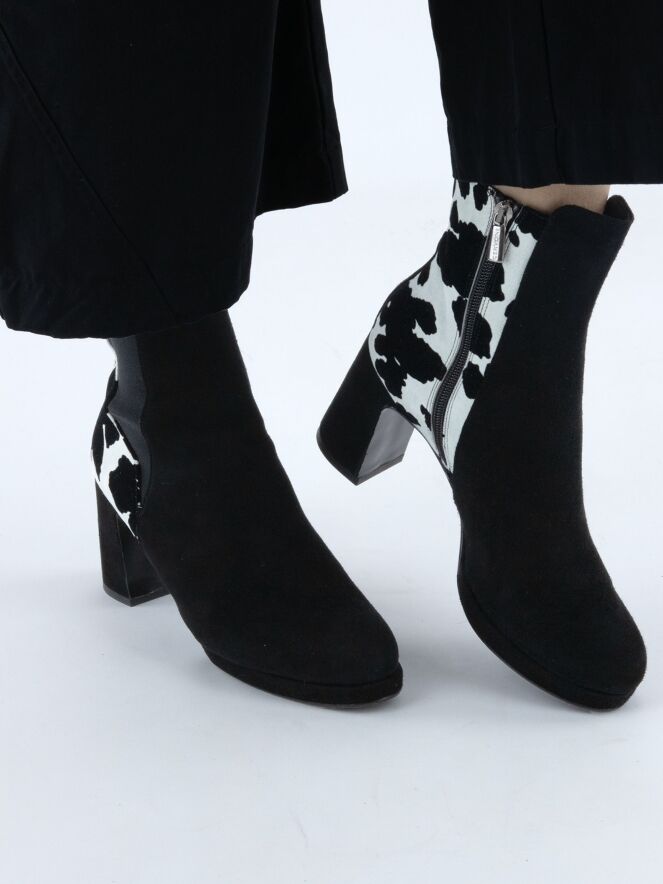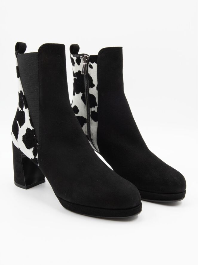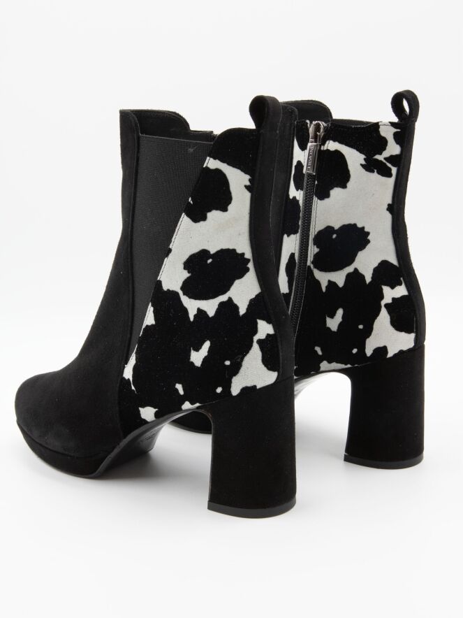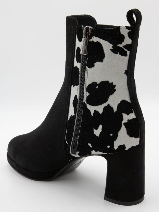 Une bottine de la marque Cervone en noir avec un imprimé tacheté noir et blanc au niveau du talon. La bottine présente un bout rond et fin ainsi qu’un talon bloc robuste recouvert du même matériau noir que la chaussure. À l’intérieur de la tige se trouve une fermeture éclair noire. L’intérieur est doublé de cuir.