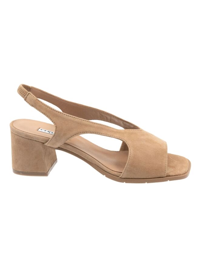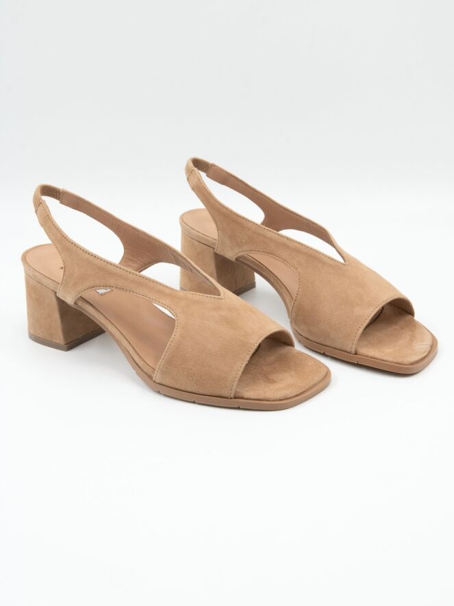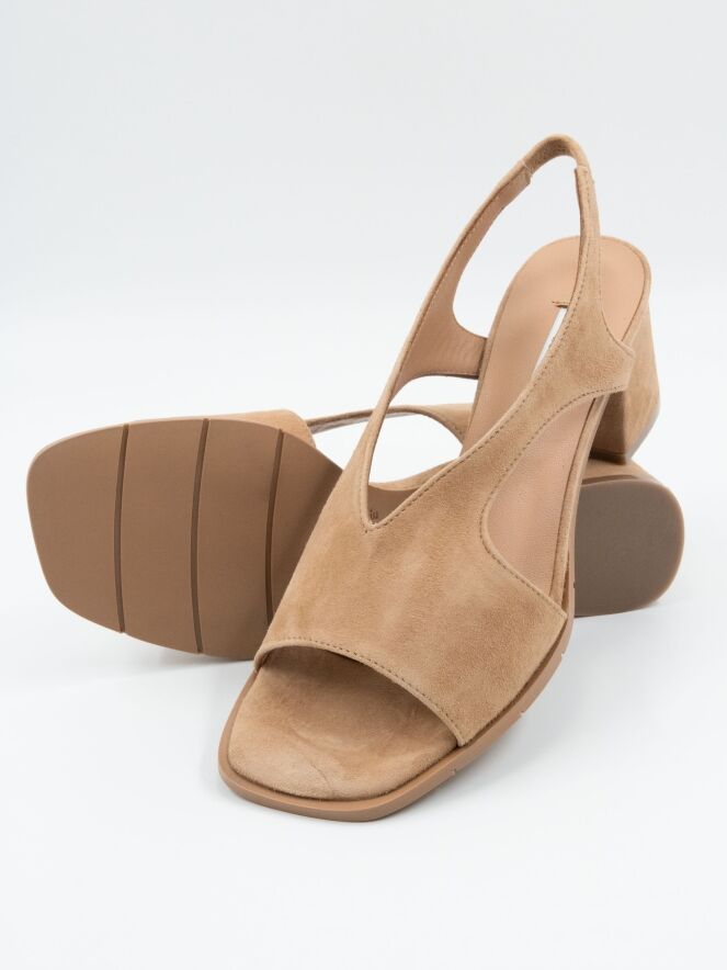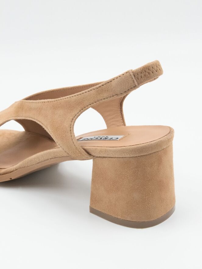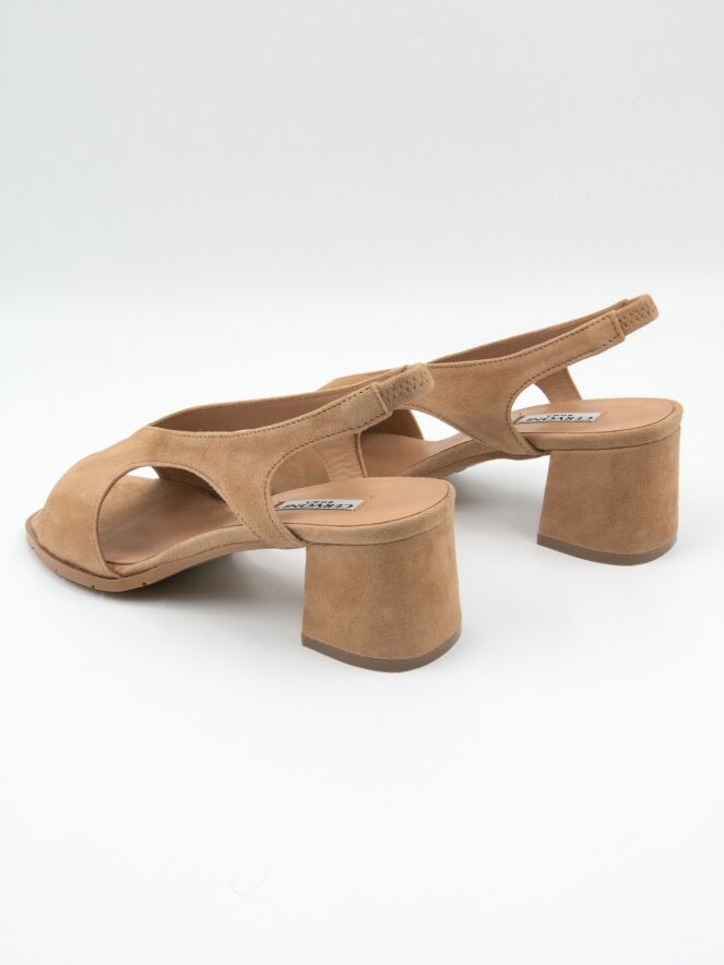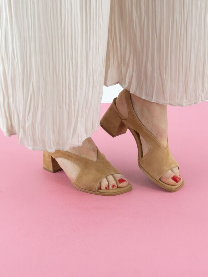 Une sandale à bout ouvert de Cervone dans une douce teinte camel. La bride arrière est élastique. Le talon bloc est recouvert du même matériau que la sandale.