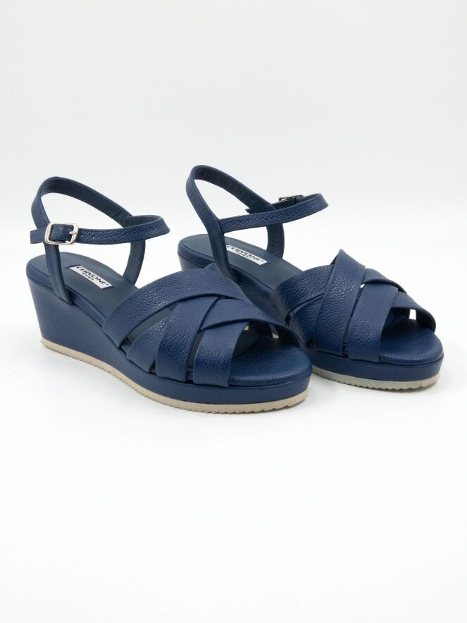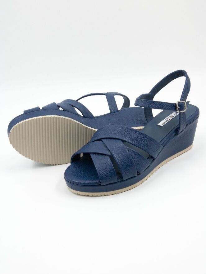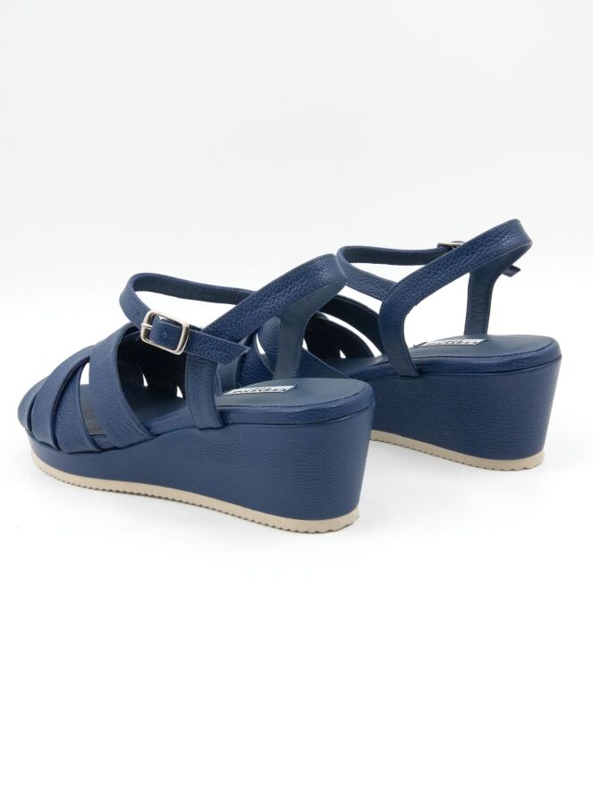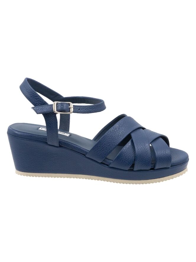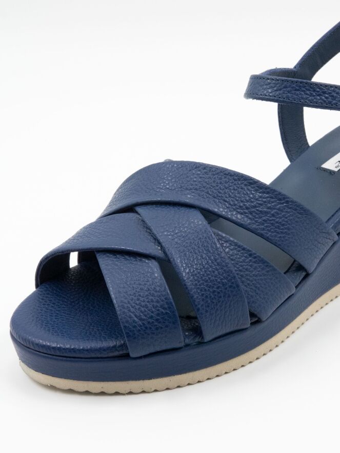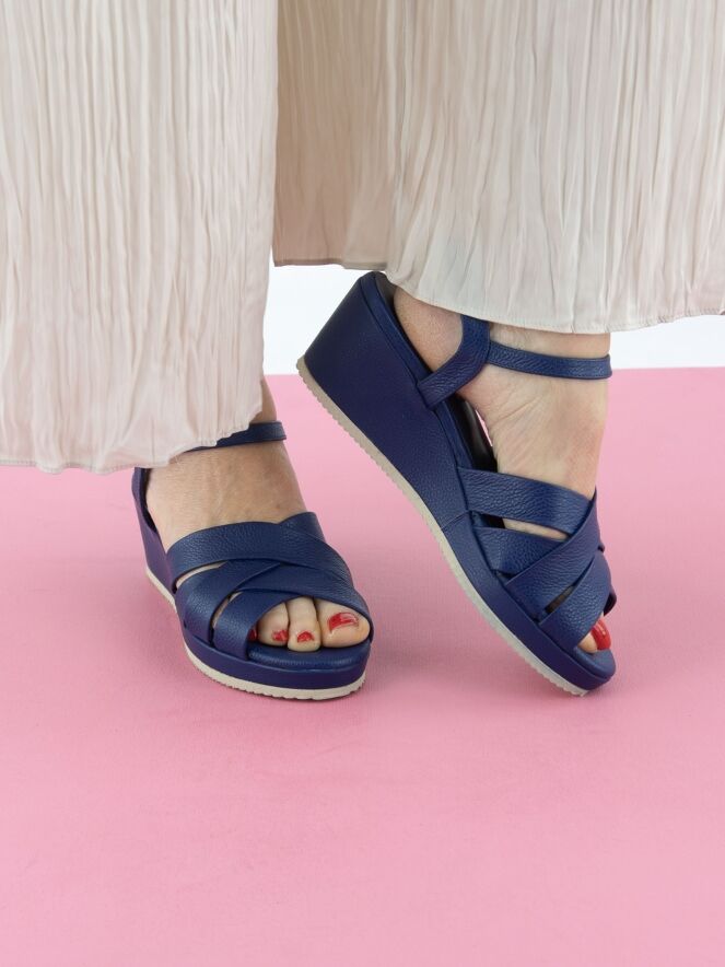 Une sandale de Cervone en bleu cobalt. La sandale comporte cinq brides croisées sur l'avant du pied et une bride de cheville réglable. Sous le talon compensé, recouvert du même cuir que la sandale, se trouve une bordure de semelle blanche finement crantée.