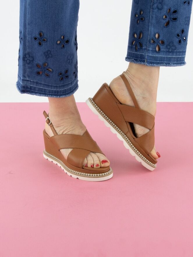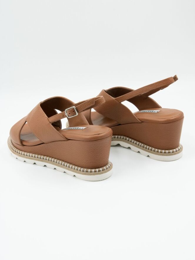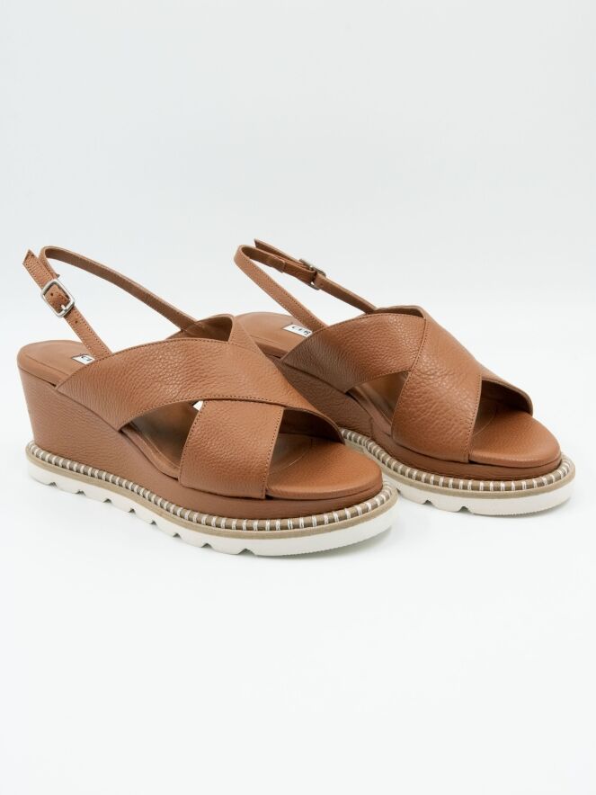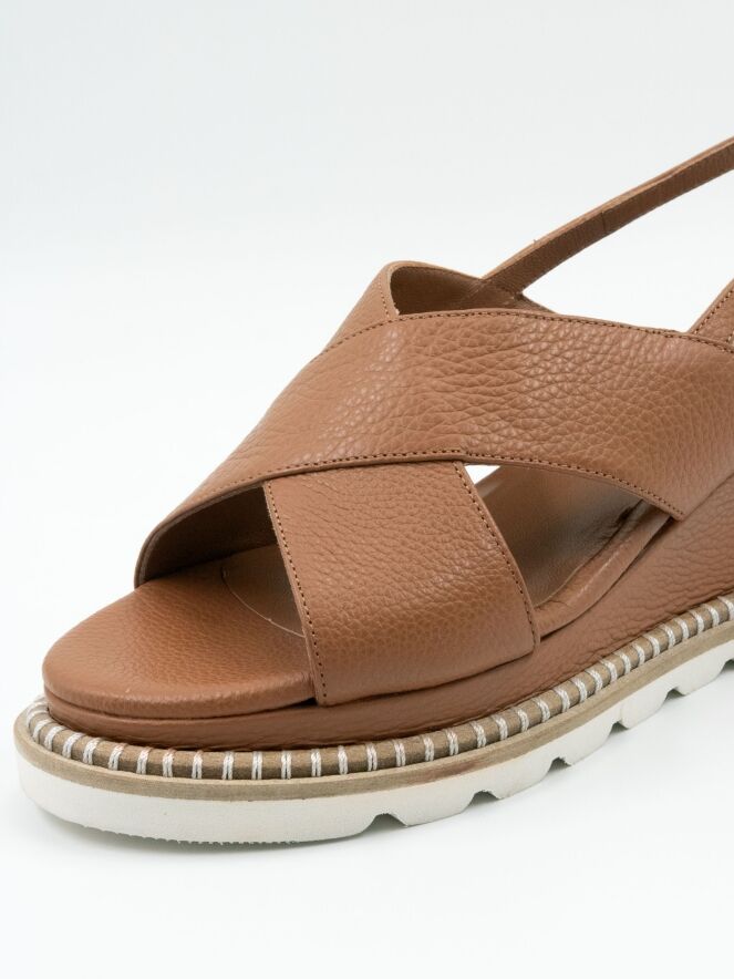 Une sandale de Cervone en couleur cognac. La sandale comporte des brides croisées sur l'avant du pied et une bride arrière réglable. Le long du bord de la semelle blanche court une bordure en jute ronde de couleur sable, ornée de surpiqûres blanches décoratives enroulées autour.