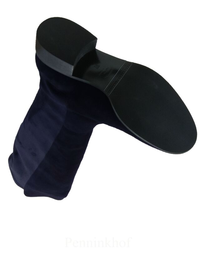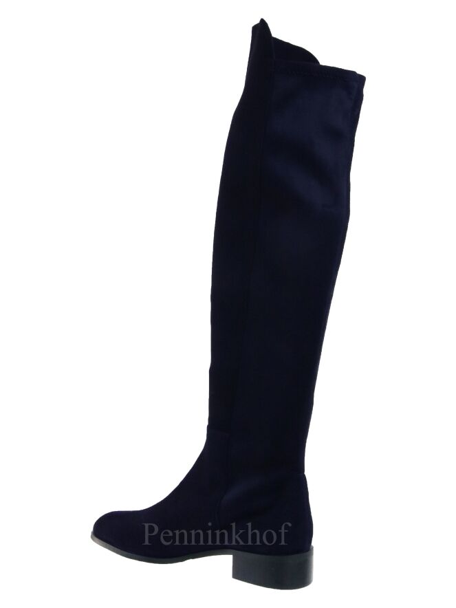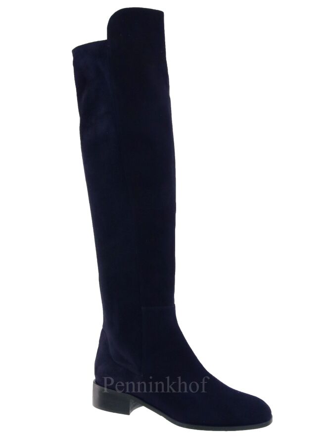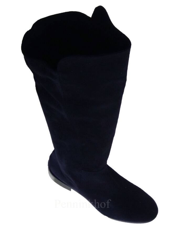 Botte montant jusqu'au genou de la marque Cervone, en camascio de couleur bleu marine. L'arrière de la tige est en daim élastique. L'intérieur est doublé de cuir.