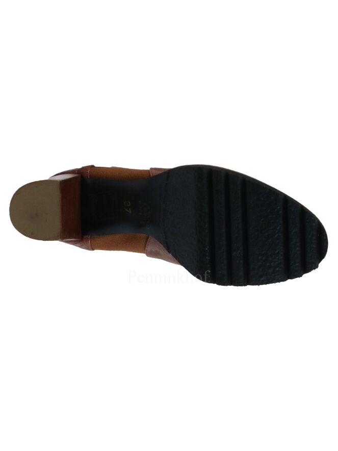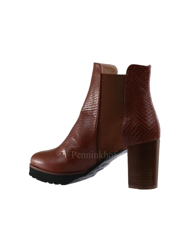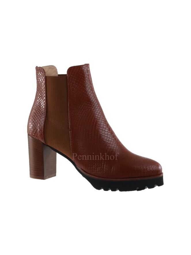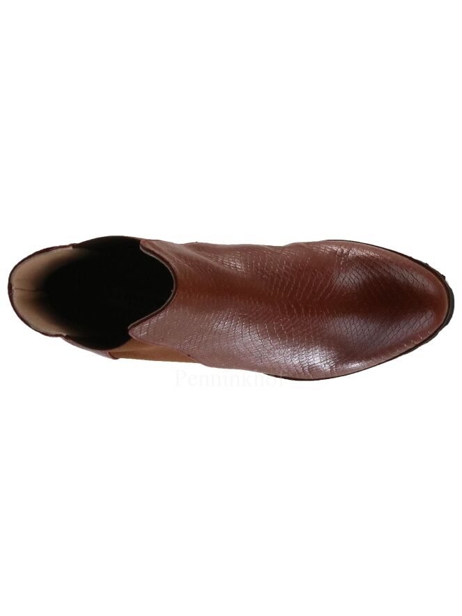 Bottine courte de la marque Cervone, en cuir façon reptile de couleur cognac. Elle présente une bande élastique de même couleur de chaque côté de la tige. La semelle crantée est de couleur noire. L'intérieur est doublé de cuir.