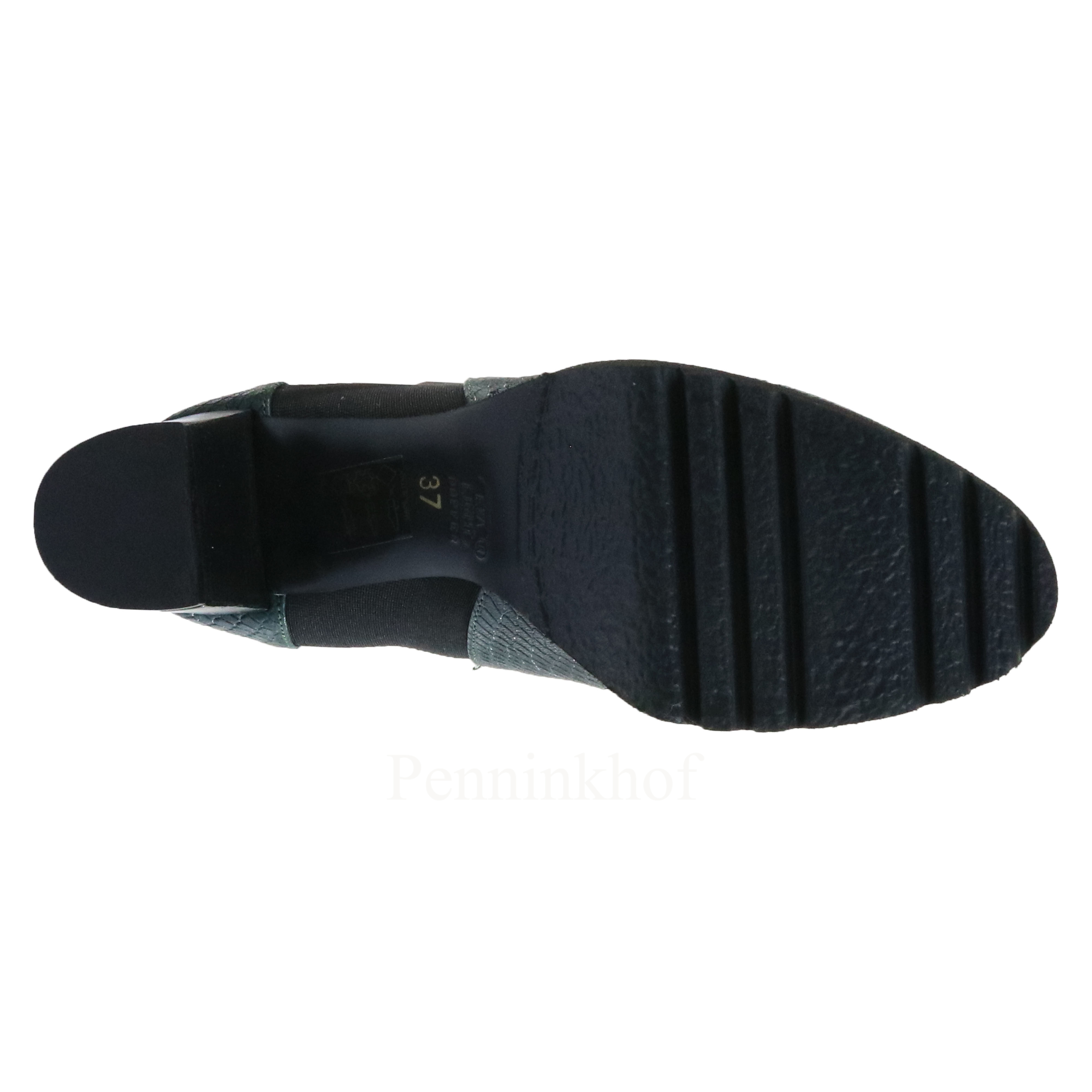 Bottine courte de la marque Cervone, en cuir façon reptile de couleur vert foncé. Elle présente une bande élastique de même couleur de chaque côté de la tige. La semelle crantée est de couleur noire. L'intérieur est doublé de cuir.