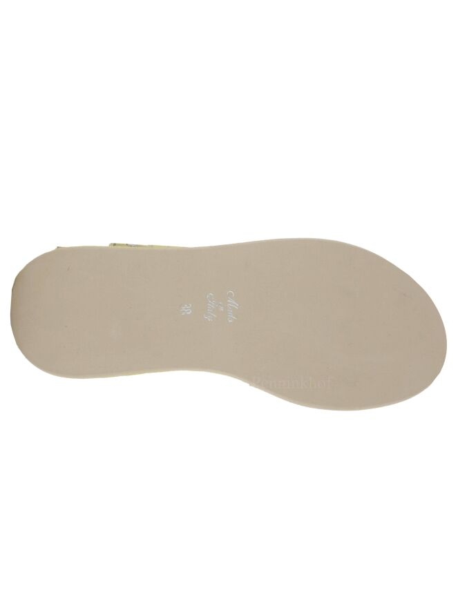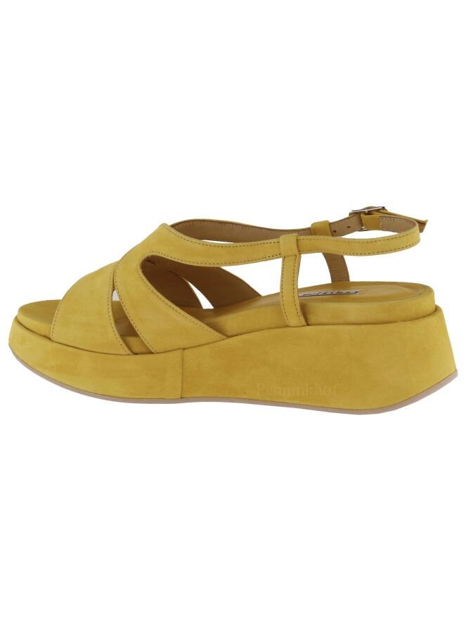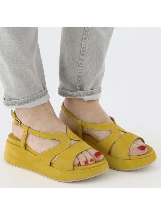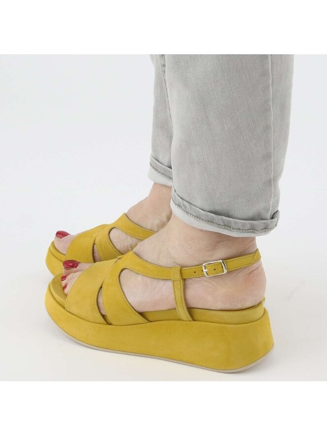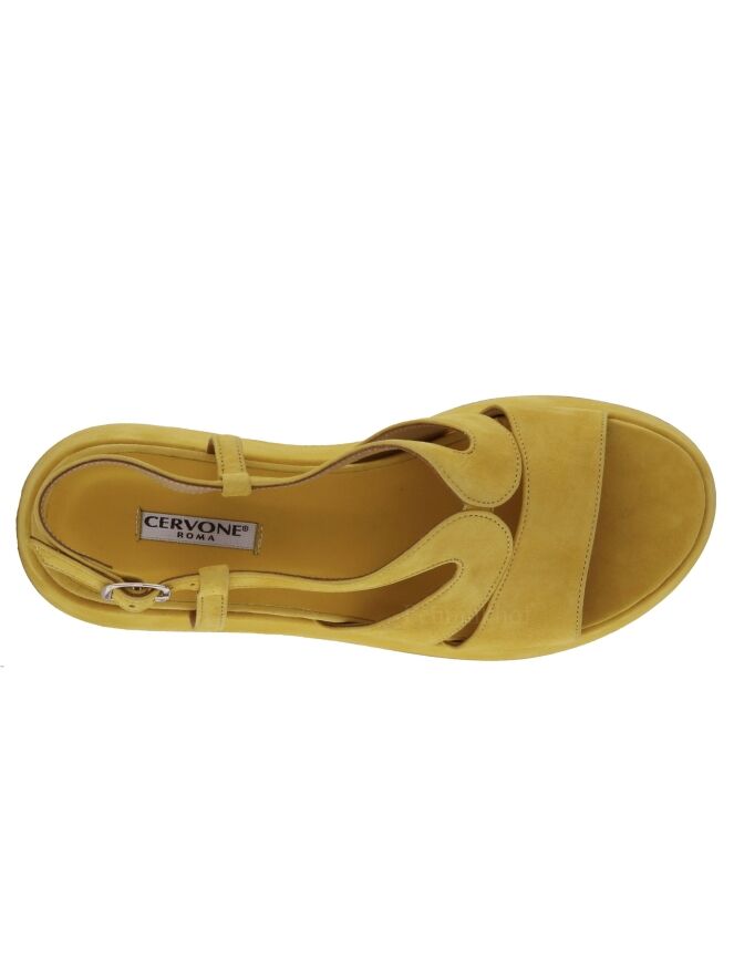 Sandale ouverte de la marque Cervone, de couleur jaune. Le nez est ouvert. Les lanières en daim forment une large bande sur l'avant-pied. La sangle du talon est réglable. La semelle compensée est recouverte du même matériau que la sandale.
