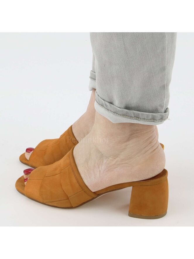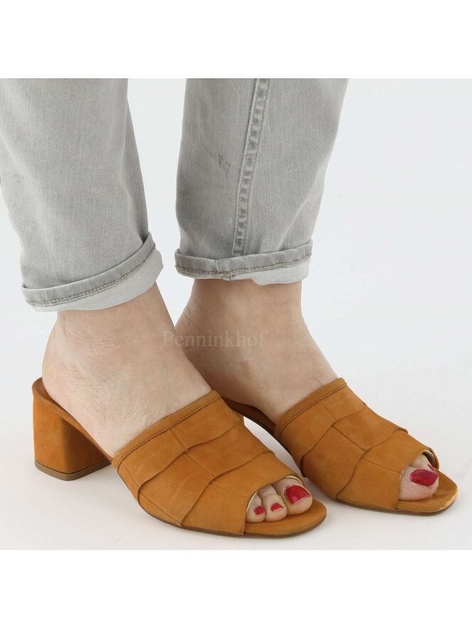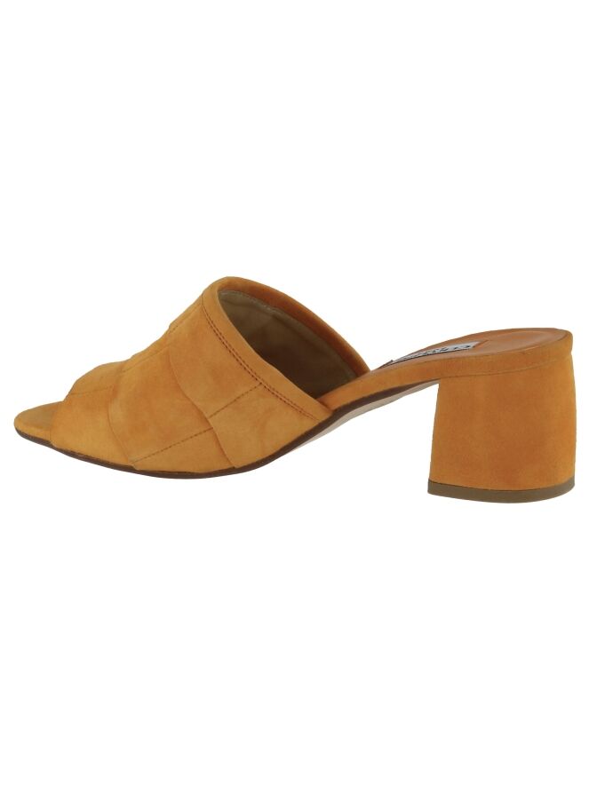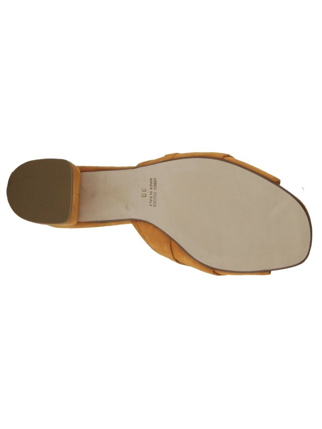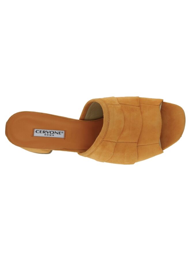 Mule de la marque Cervone, de couleur orange. Le nez de la mule est ouvert. L'avant du pied est couvert de trois bandes à bords festonnées légèrement superposées. Le talon est recouvert de daim de même couleur que la mule.