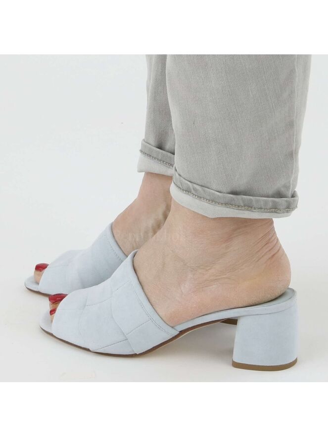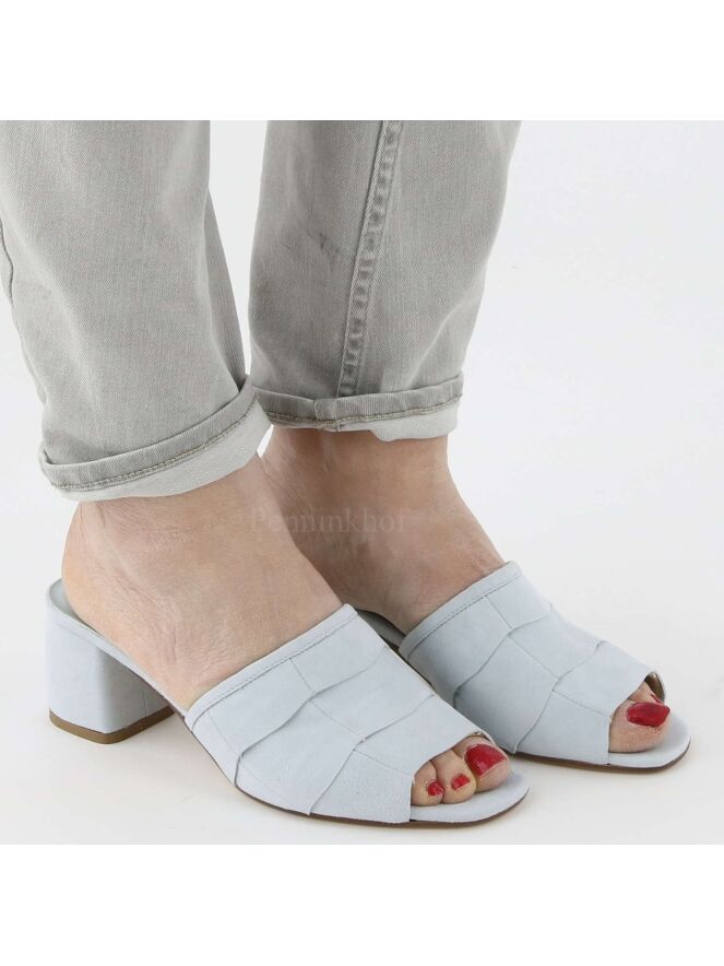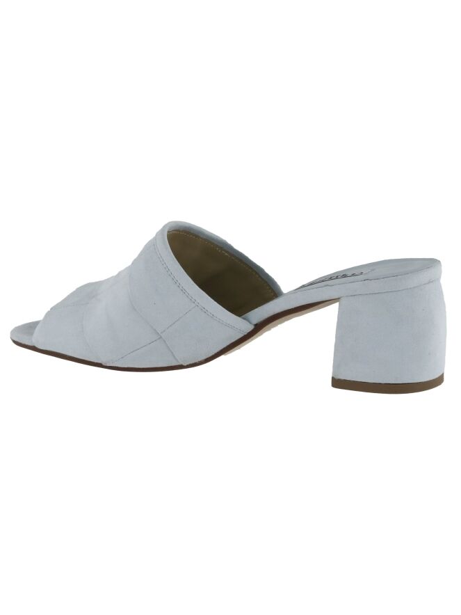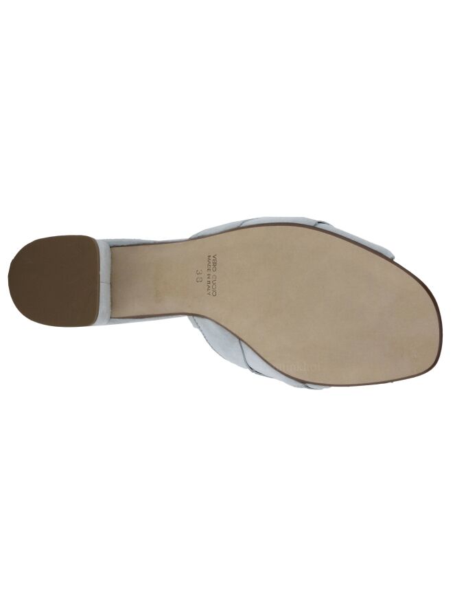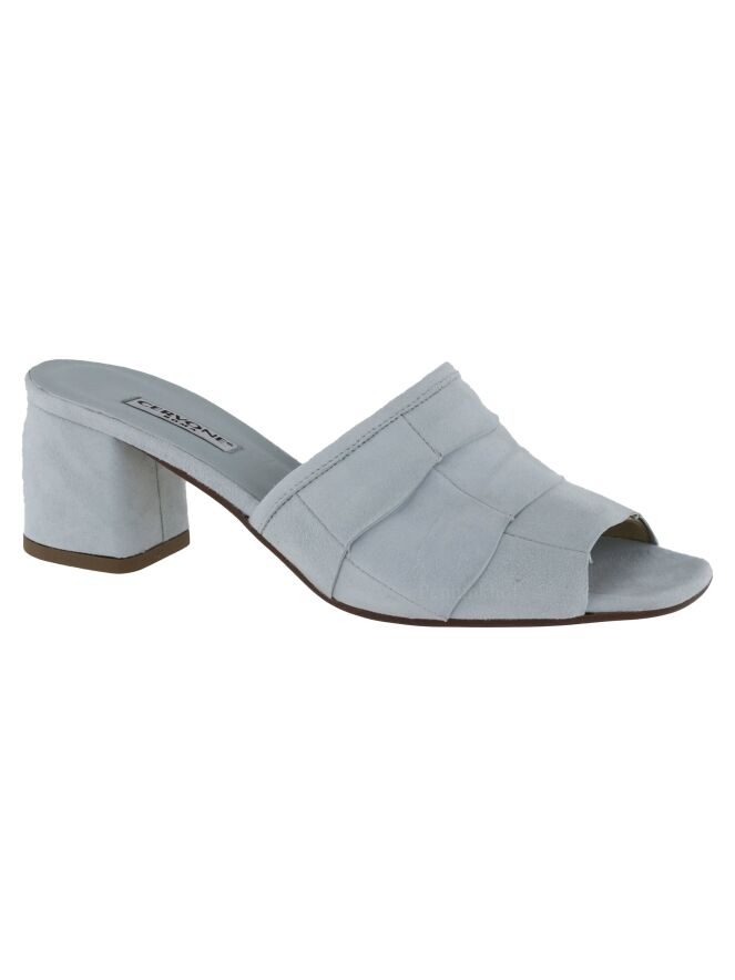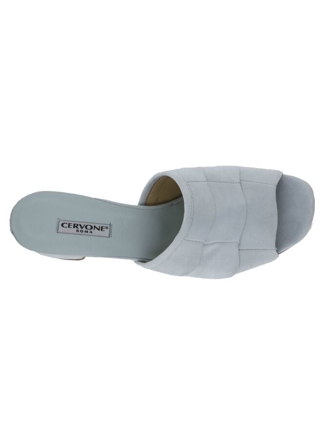 Mule de la marque Cervone, de couleur gris clair. Le nez de la mule est ouvert. L'avant du pied est couvert de trois bandes à bords festonnées légèrement superposées. Le talon est recouvert de daim de même couleur que la mule.