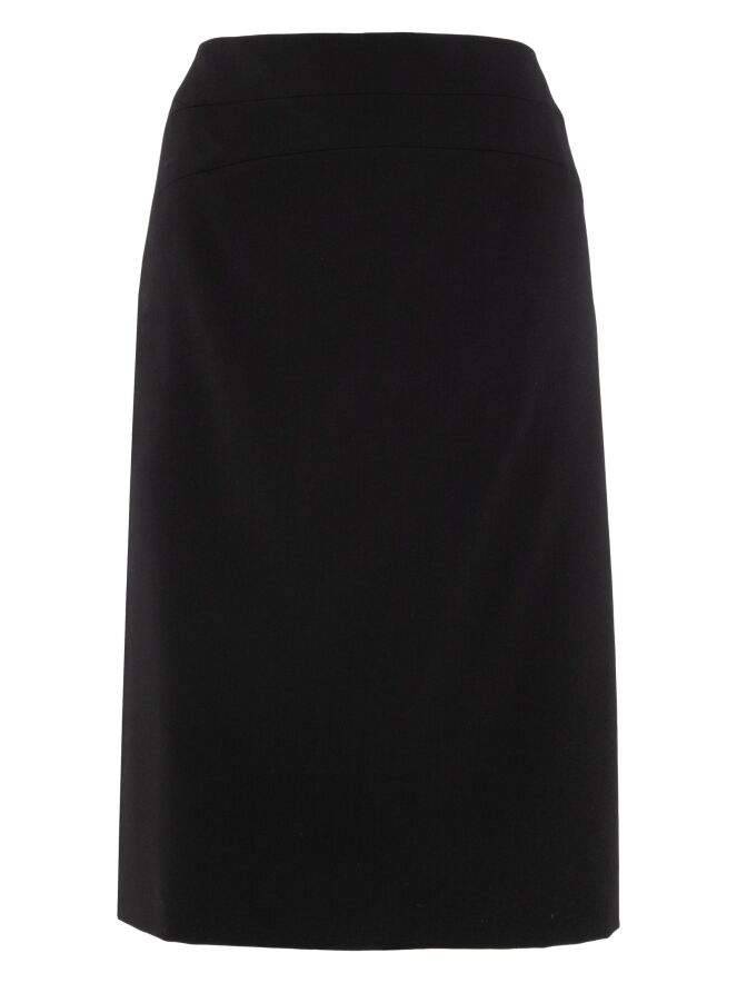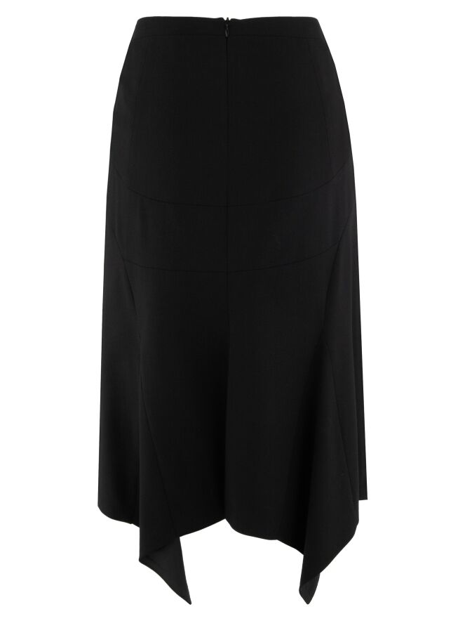 Une jupe de Clasen en noir. À l'arrière, au niveau des hanches, il y a deux coutures circulaires, et à partir de ces coutures, deux plis s'étendent. La jupe est doublée et peut être lavée à la main.