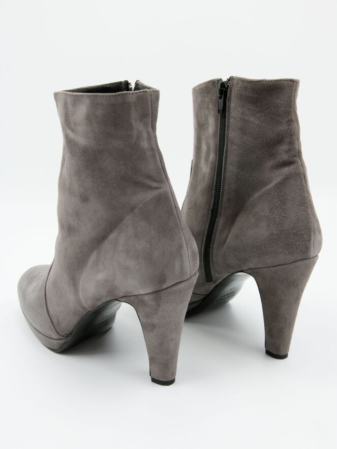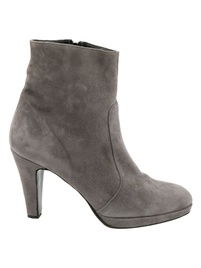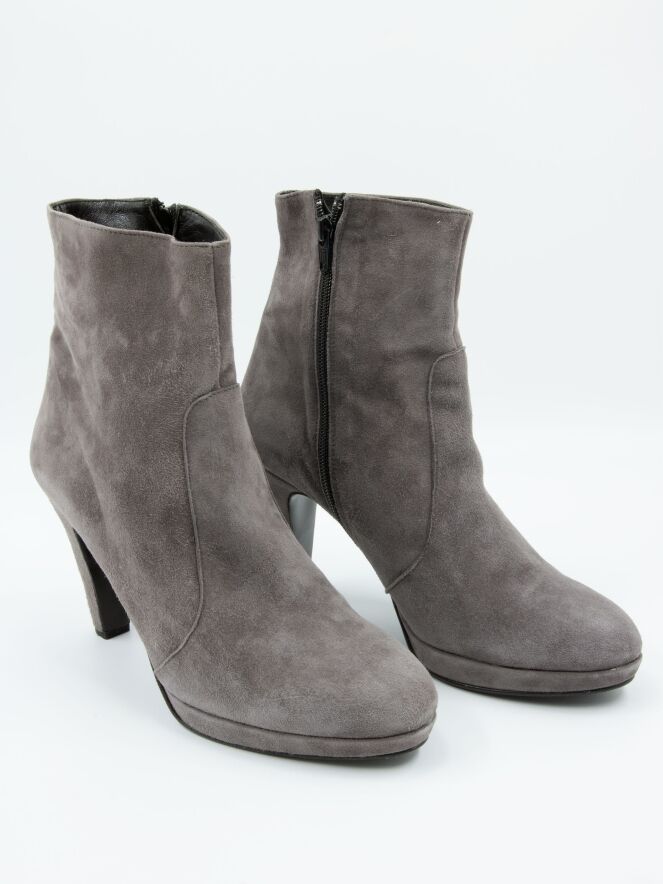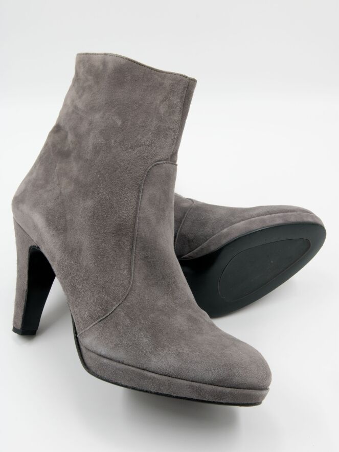 Une bottine de Cristian Daniël en gris. Le talon fin est recouvert du même matériau que la bottine. Une fermeture éclair noire est placée sur le côté intérieur. L’intérieur est doublé de cuir.