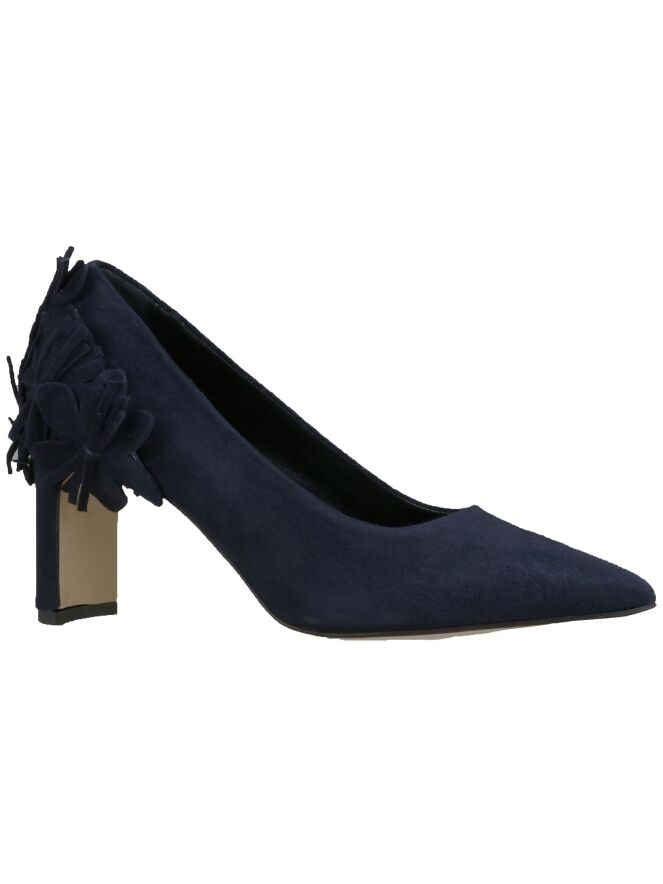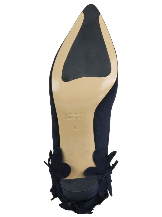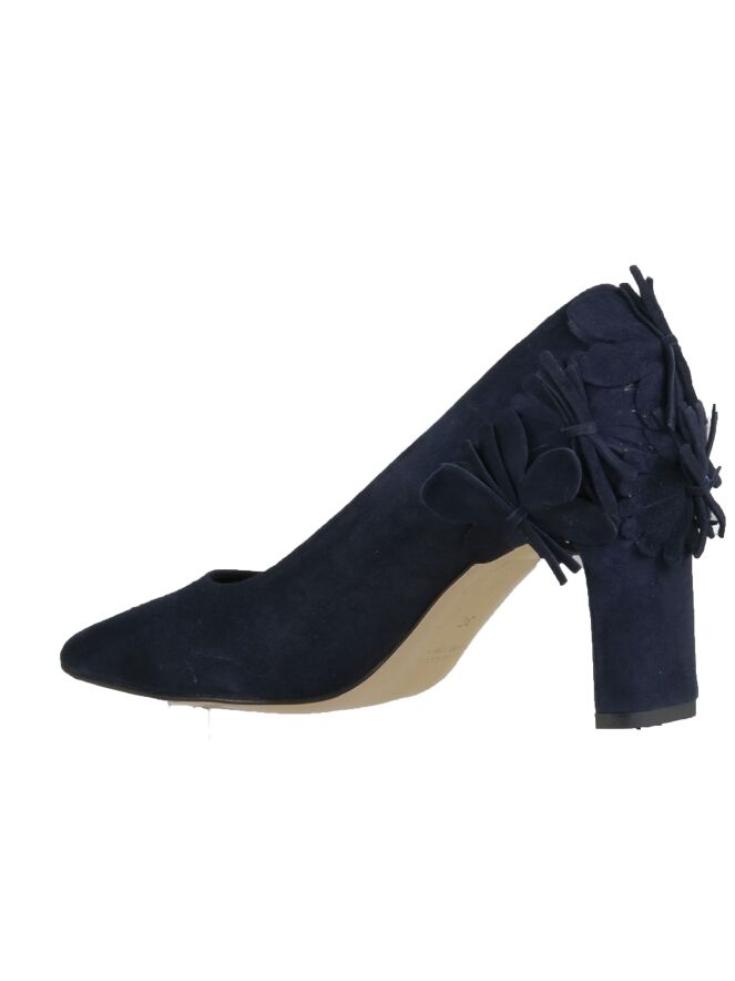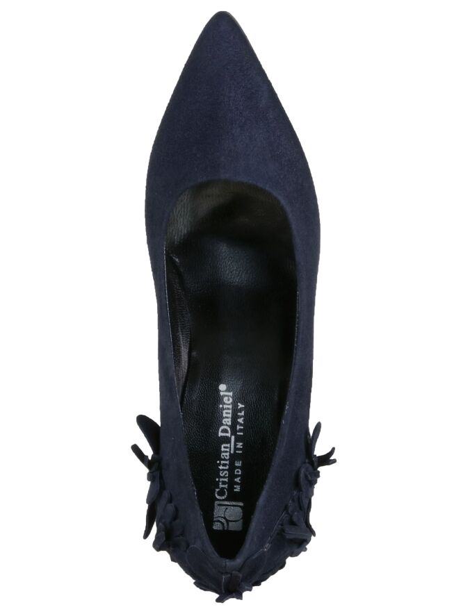 Elégant escarpin à nez pointu, de la marque Cristian Daniel, en daim bleu marine. Son talon élégant est décoré de franges en daim en forme de fleurs délicatement posées. Intérieur doublé cuir.