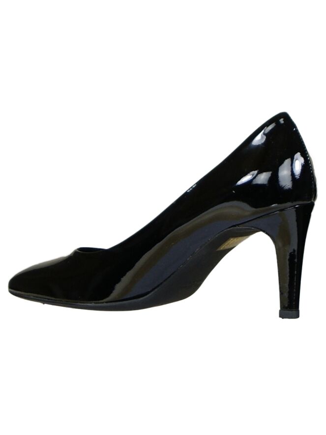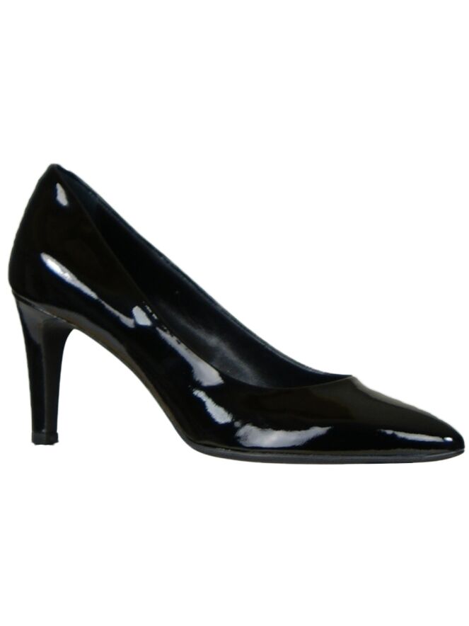 Elégant escarpin de la marque Cristian Daniel, en cuir noir verni, avec son haut talon fin de 7 cm laqué et son nez rond légèrement pointu. Intérieur doublé cuir noir.
