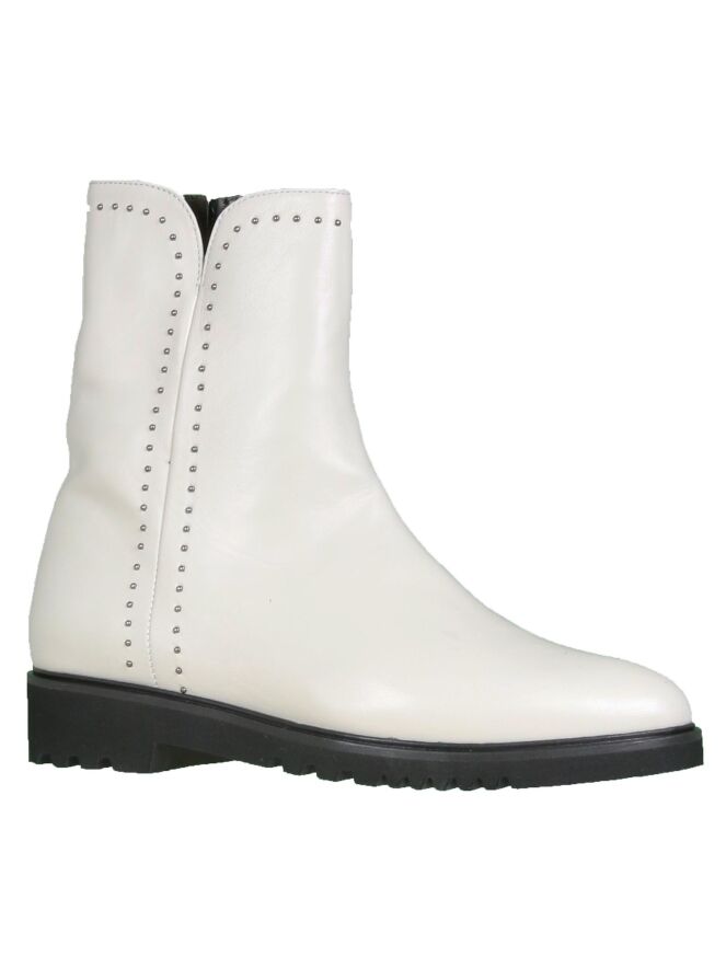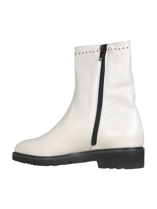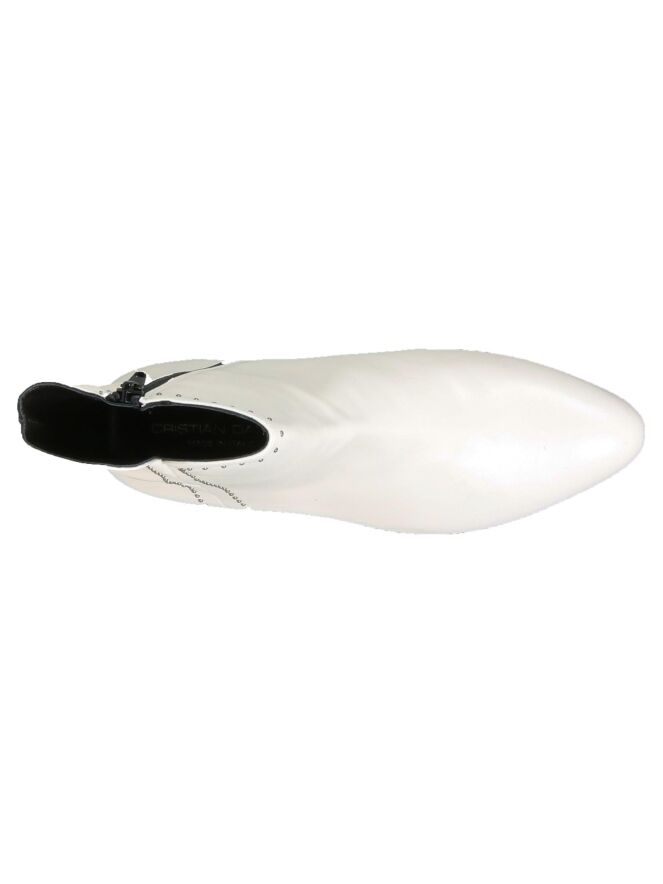 Bottine en cuir blanc crème de la marque Cristian Daniel. Modèle habillé d'une ligne de fins rivets de couleur nickel avec fermeture Eclair sur l'intérieur de la botte. L'intérieur de la tige est doublé de cuir.