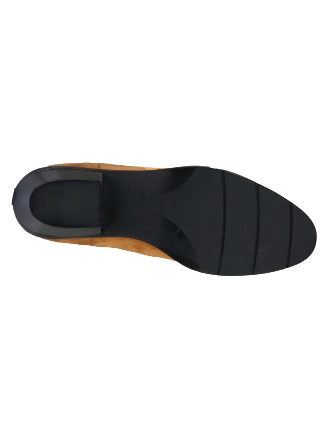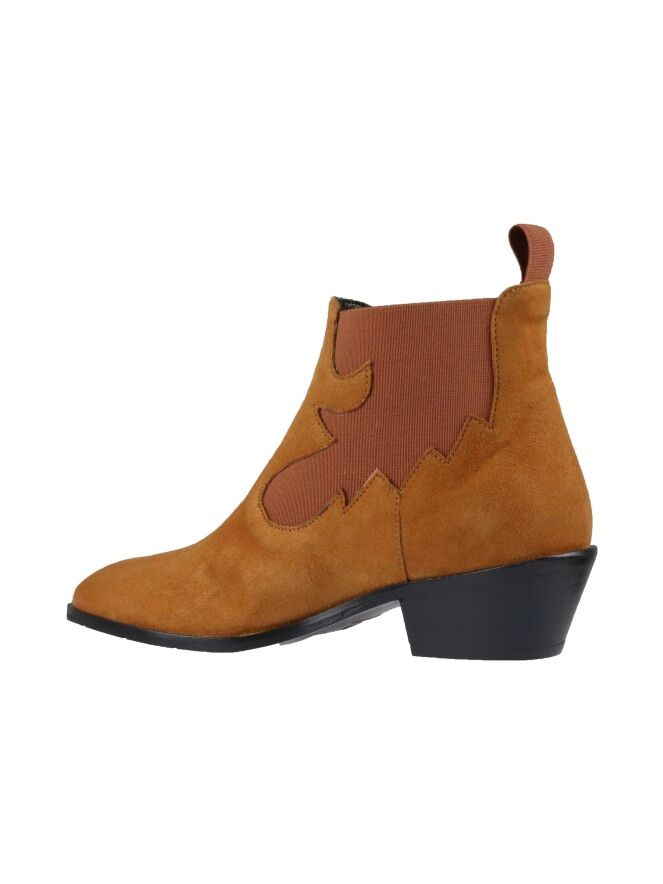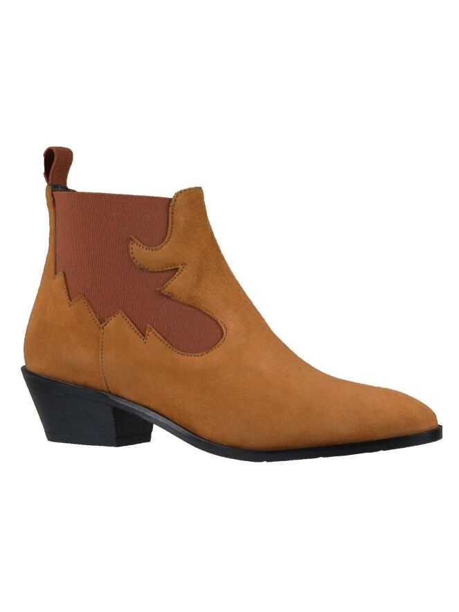 Botte western de la marque Cristian Daniel, de couleur cognac. Les deux côtés présentent une découpe décorative sur le tissu élastique de même couleur. La botte est dotée d'un nez rond et d'un talon noir. Intérieur doublé cuir.